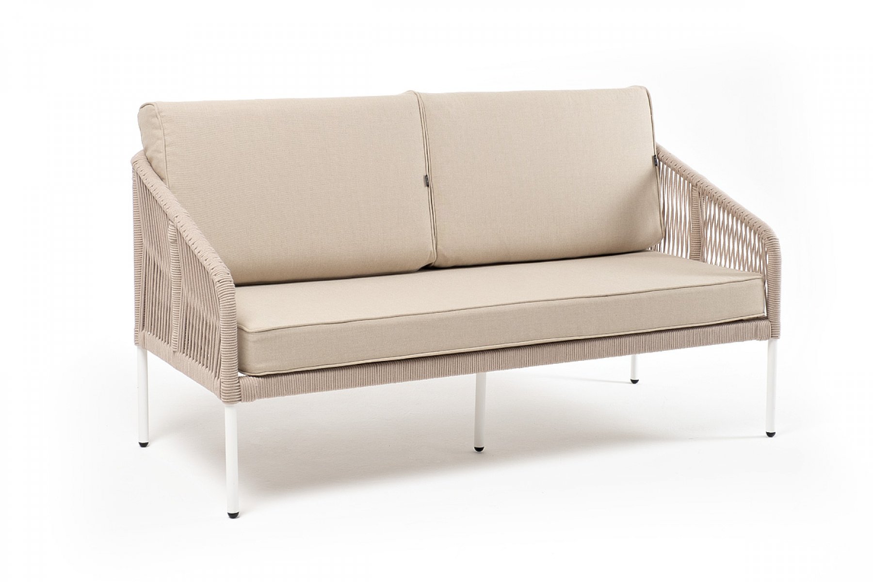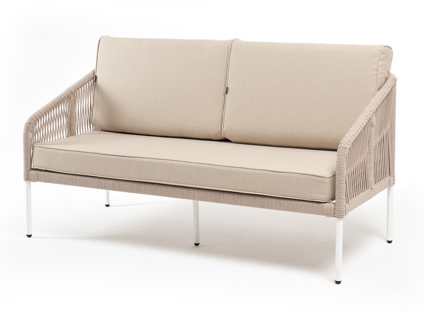 "Канны" диван 2-местный плетеный из роупа, каркас алюминий белый муар, роуп бежевый круглый, ткань бежевая 15052