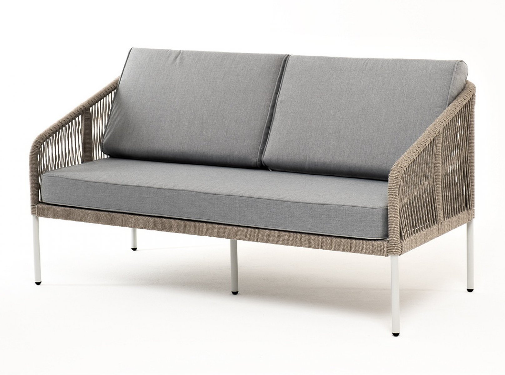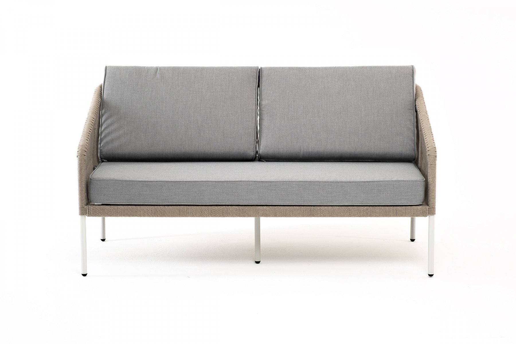 "Канны" диван 2-местный плетеный из роупа, каркас алюминий светло-серый (RAL7035) шагрень, роуп серый меланж круглый, ткань светло-серая
