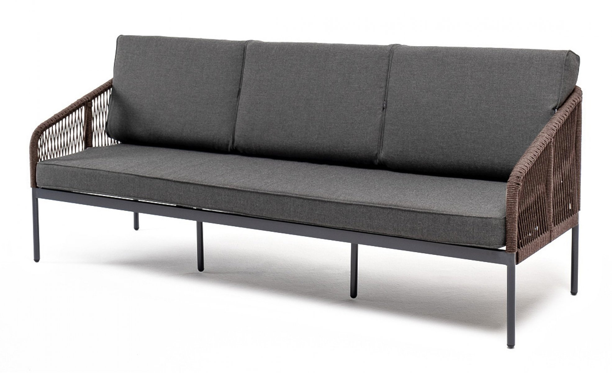 "Канны" диван 3-местный плетеный из роупа, каркас алюминий темно-серый (RAL7024) муар, роуп коричневый круглый, ткань темно-серая 027