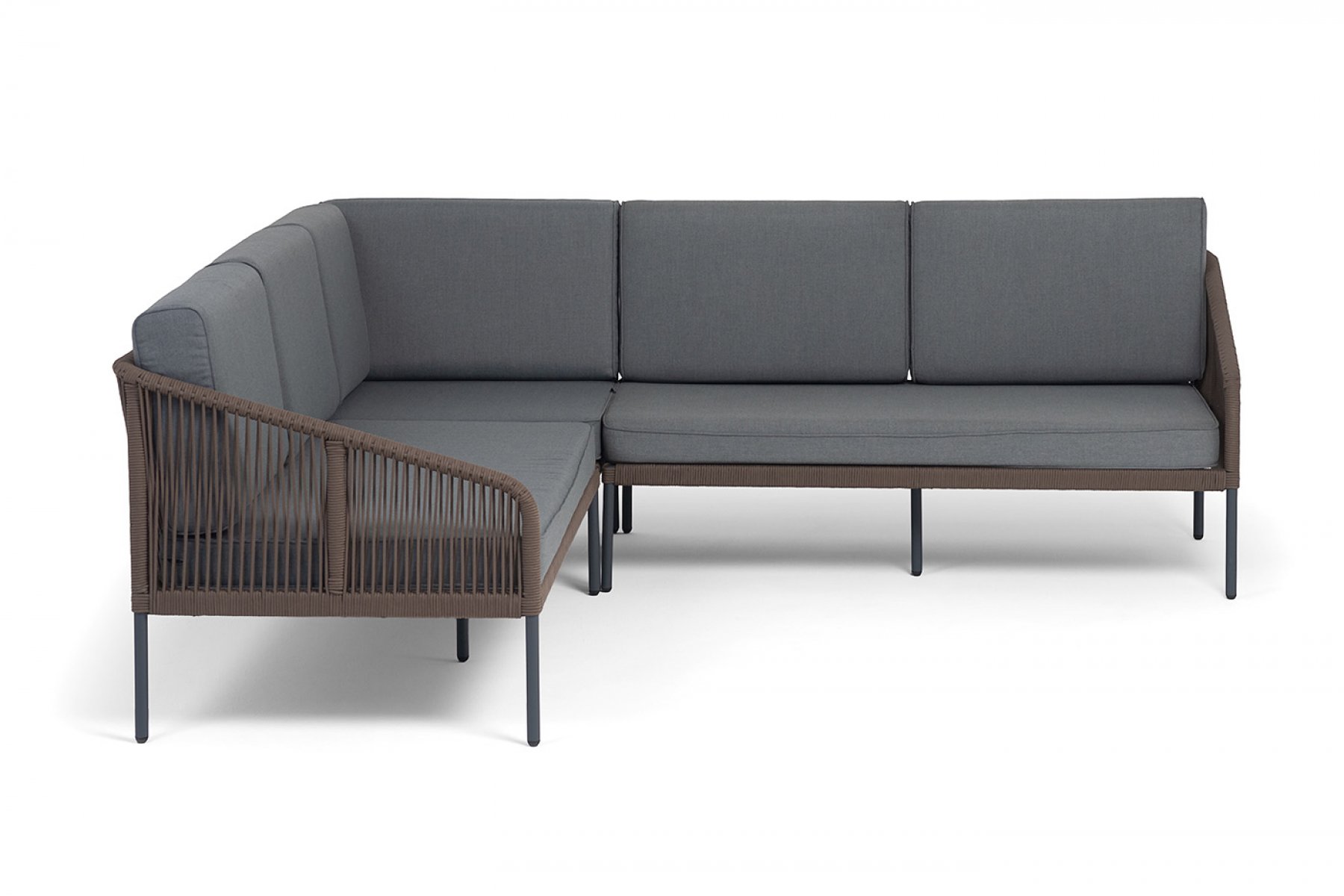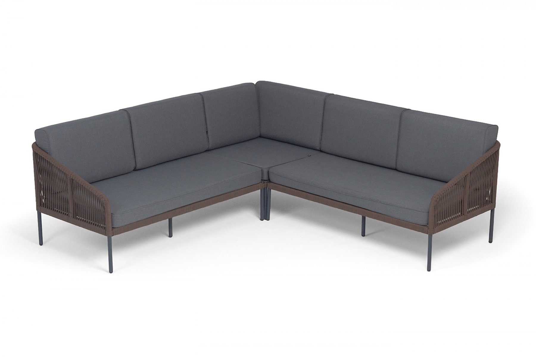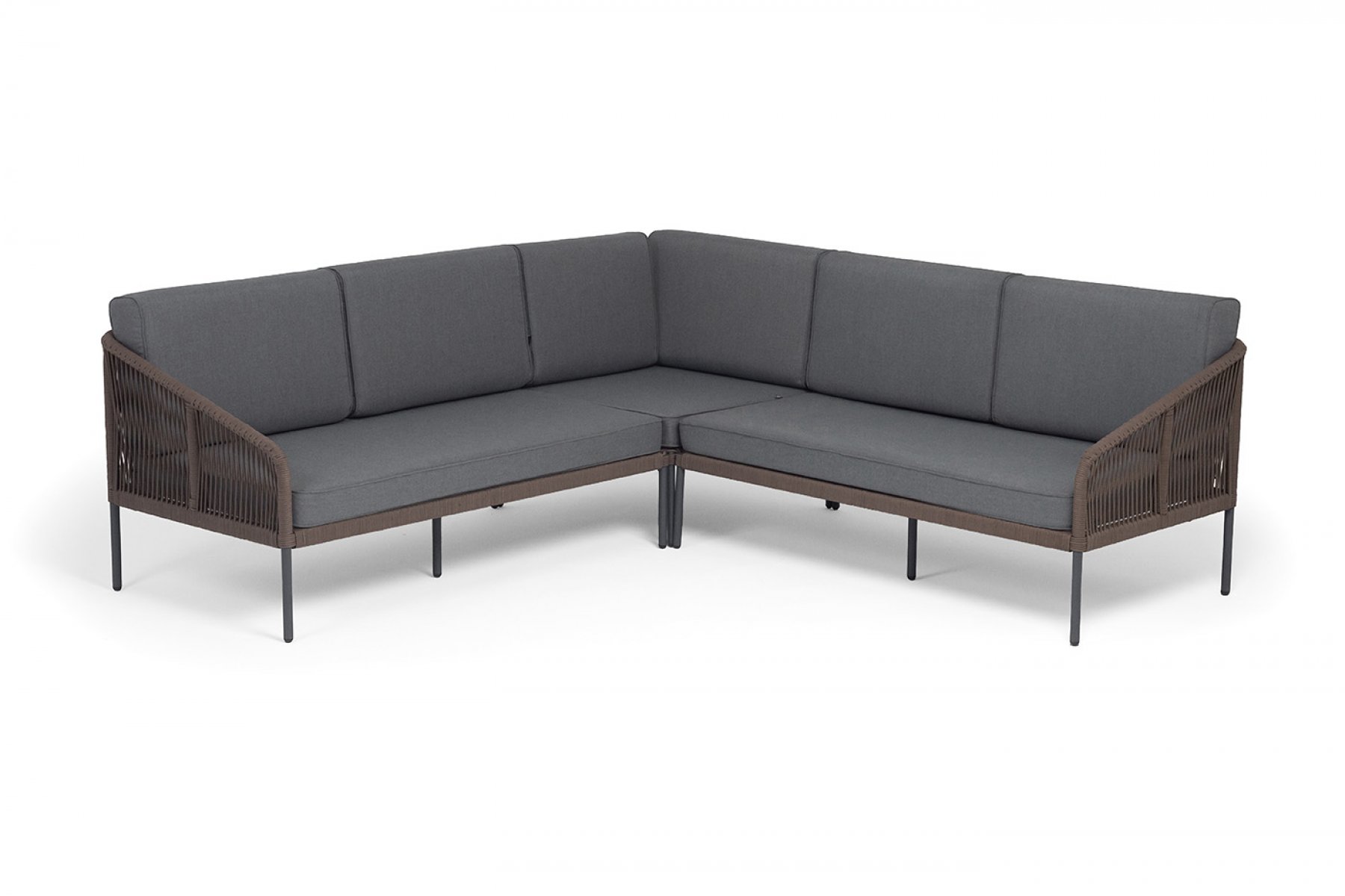 "Канны" диван модульный плетеный из роупа, каркас алюминий темно-серый (RAL7024) муар, роуп коричневый круглый, ткань серая 017