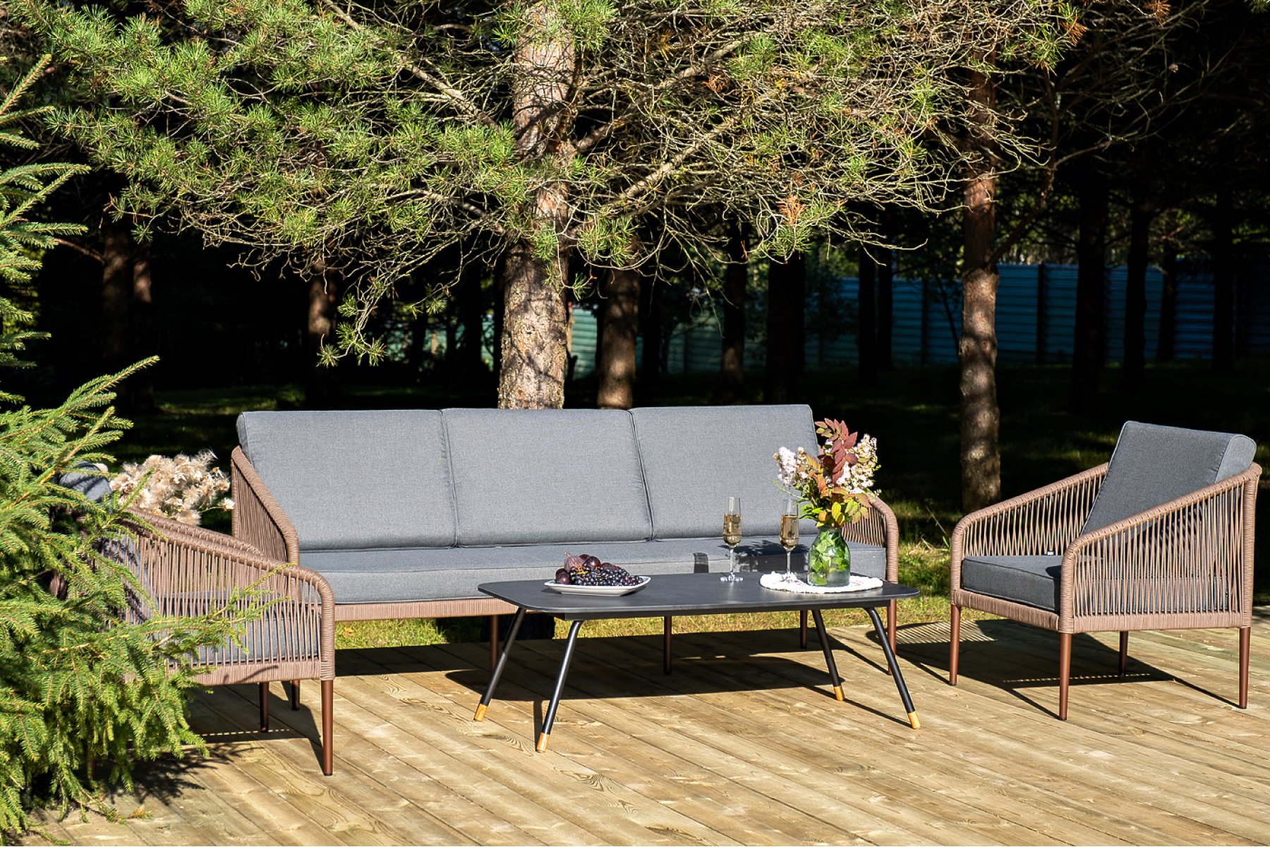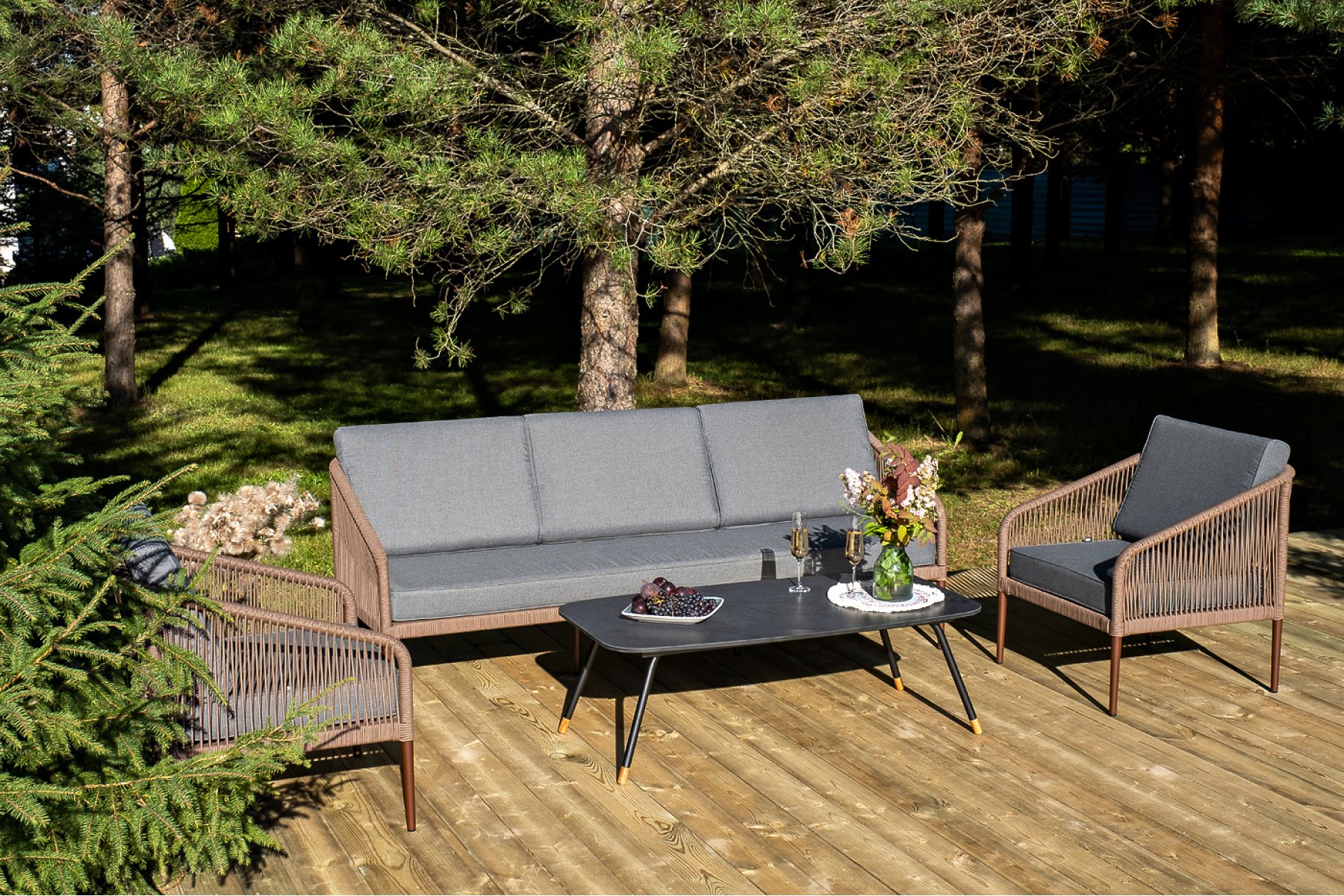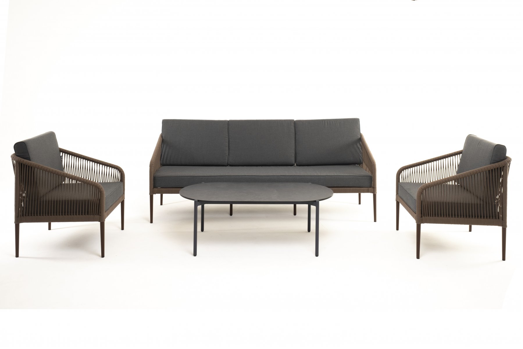 Кресла и диван идут в комплекте с мягкими подушками в чехлах темно-серого цвета. "Верона" журнальный стол из HPL 120х65, H40, каркас черный муар, цвет столешницы "серый гранит" 1шт. 1 200Х650Х400, "Канны" диван 3-местный плетеный из роупа, каркас алюминий коричневый (RAL8016) муар, роуп коричневый круглый, ткань темно-серая 027 1шт. 2 030Х700Х750, "Канны" кресло плетеное из роупа, каркас алюминий коричневый (RAL8016) муар, роуп коричневый круглый, ткань темно-серая 027 2шт. 700Х700Х750,