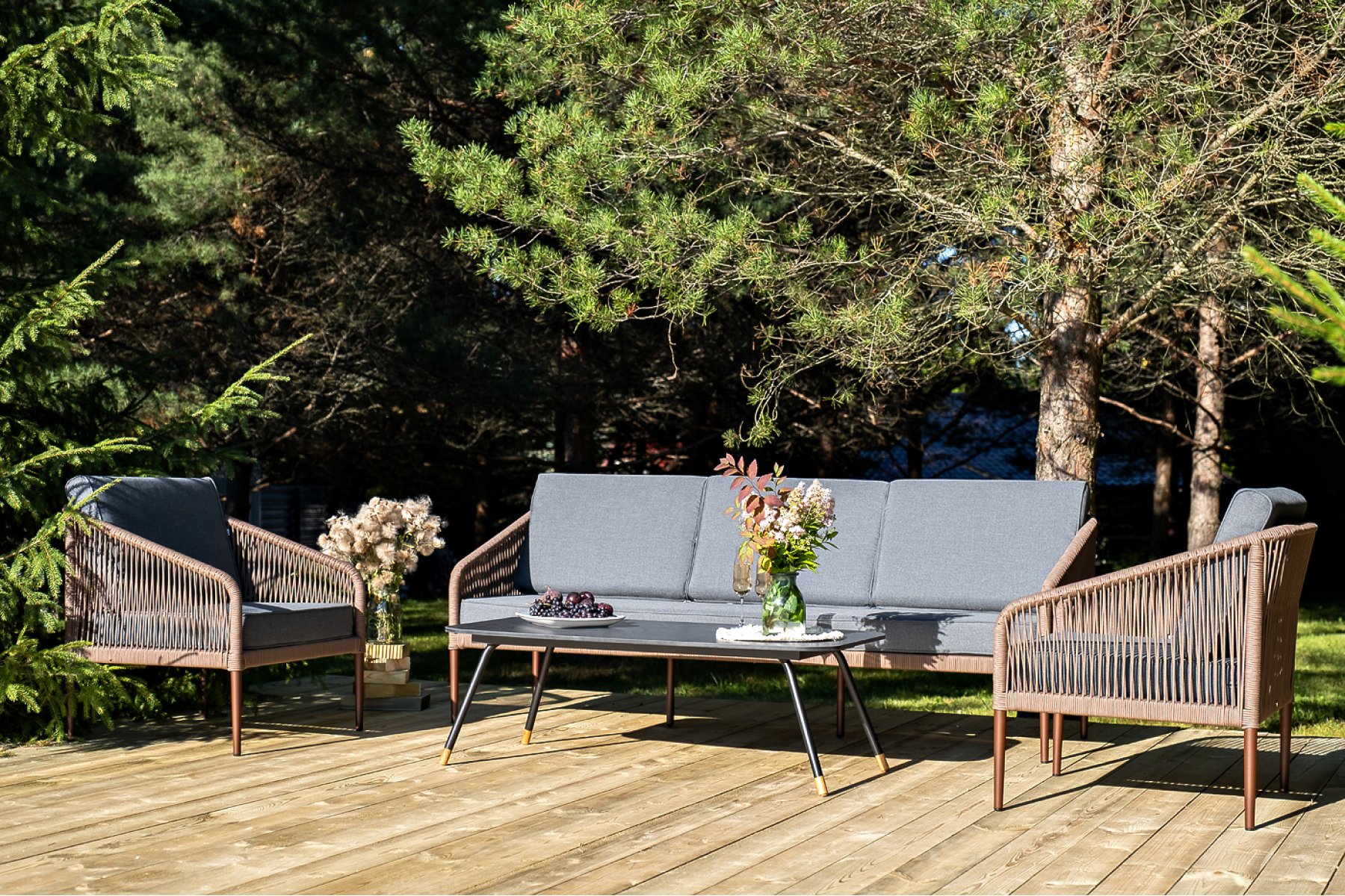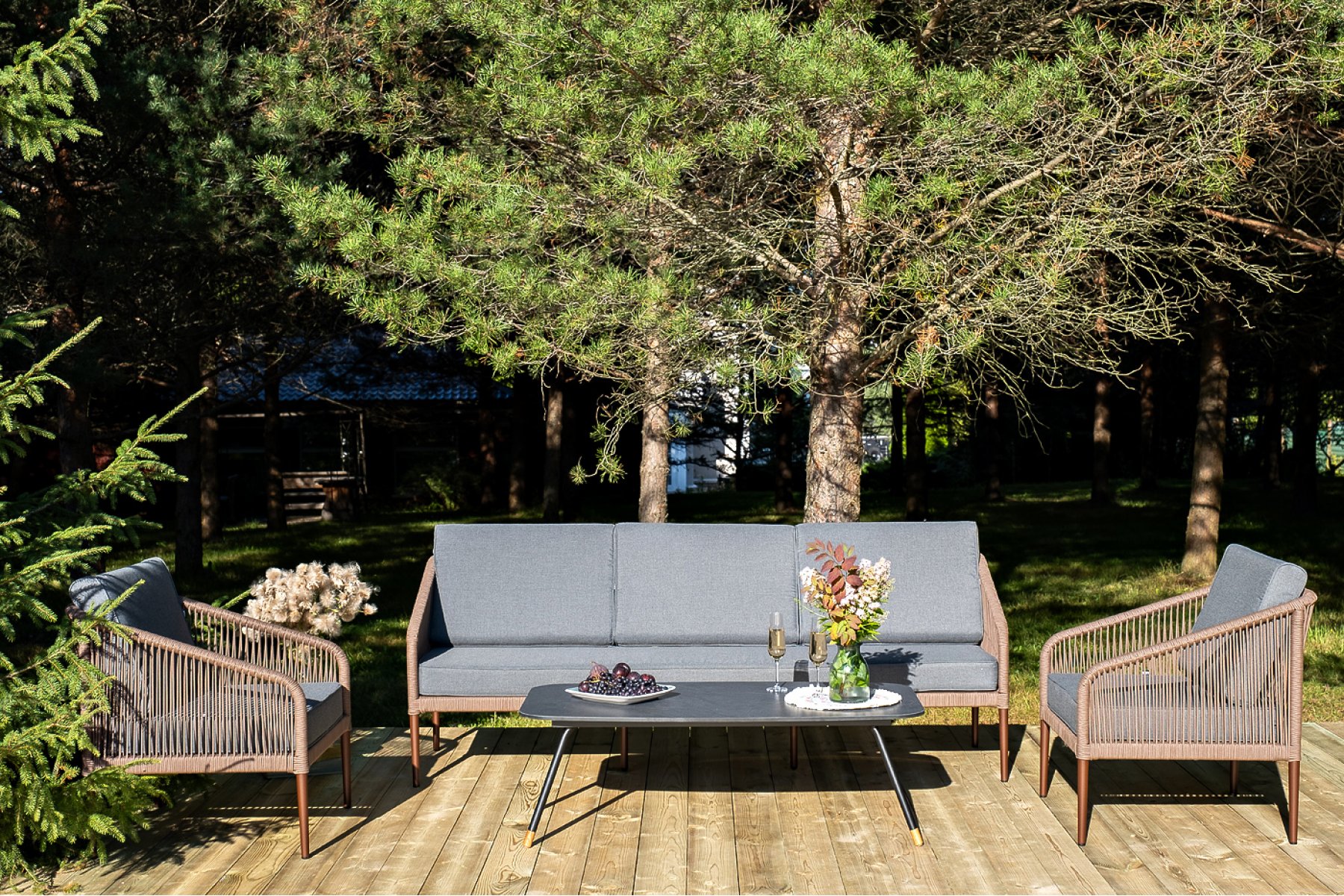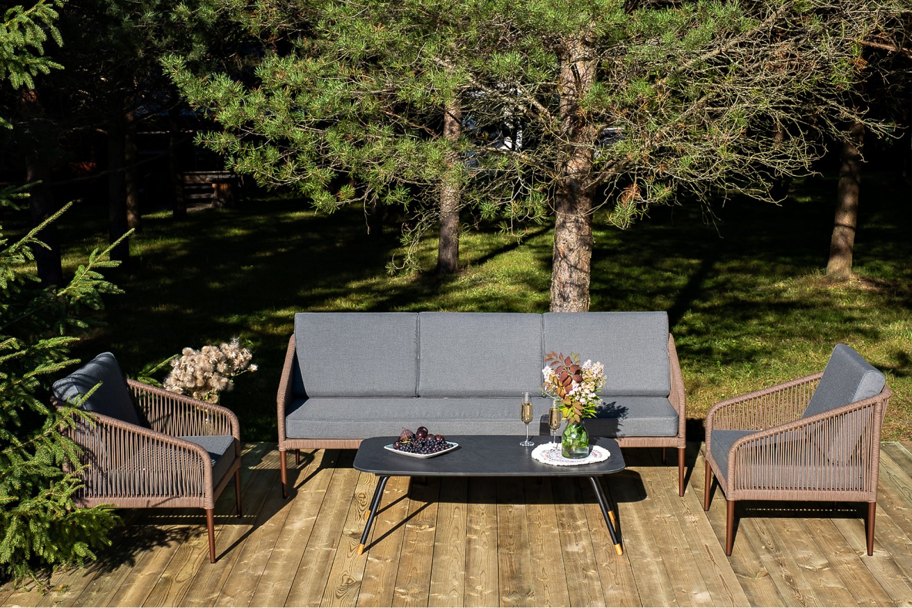 Кресла и диван идут в комплекте с мягкими подушками в чехлах темно-серого цвета. "Верона" журнальный стол из HPL 120х65, H40, каркас черный муар, цвет столешницы "серый гранит" 1шт. 1 200Х650Х400, "Канны" диван 3-местный плетеный из роупа, каркас алюминий коричневый (RAL8016) муар, роуп коричневый круглый, ткань темно-серая 027 1шт. 2 030Х700Х750, "Канны" кресло плетеное из роупа, каркас алюминий коричневый (RAL8016) муар, роуп коричневый круглый, ткань темно-серая 027 2шт. 700Х700Х750,