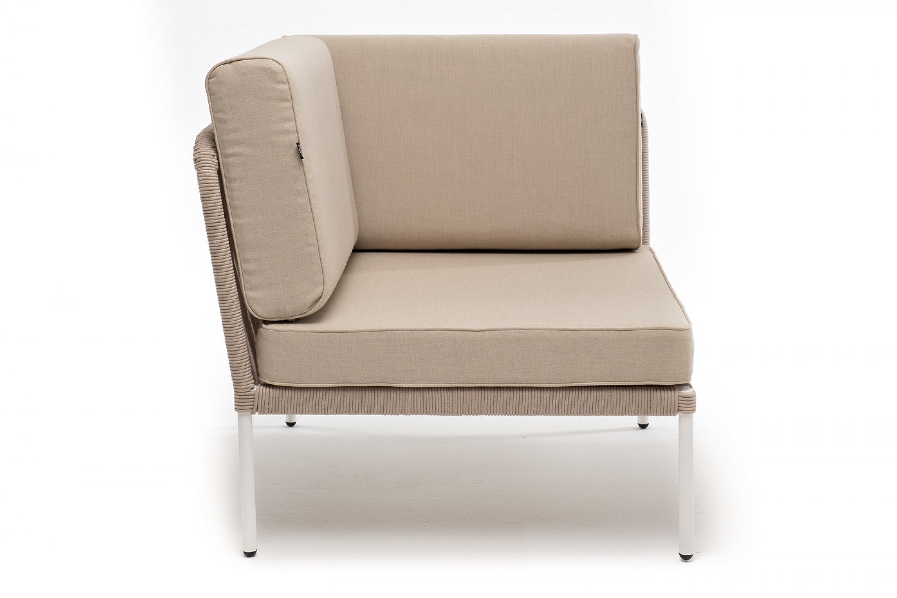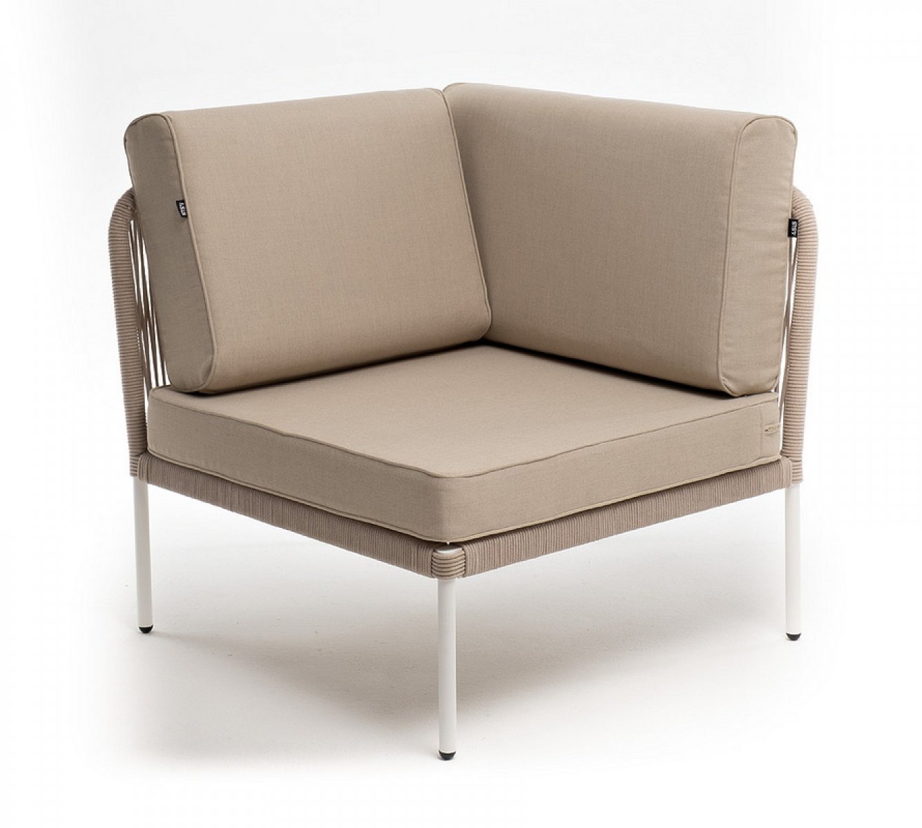 "Канны" угловой модуль плетеный из роупа, каркас алюминий белый муар, роуп бежевый круглый, ткань бежевая 15052