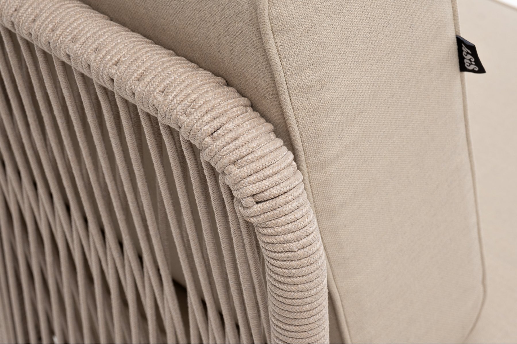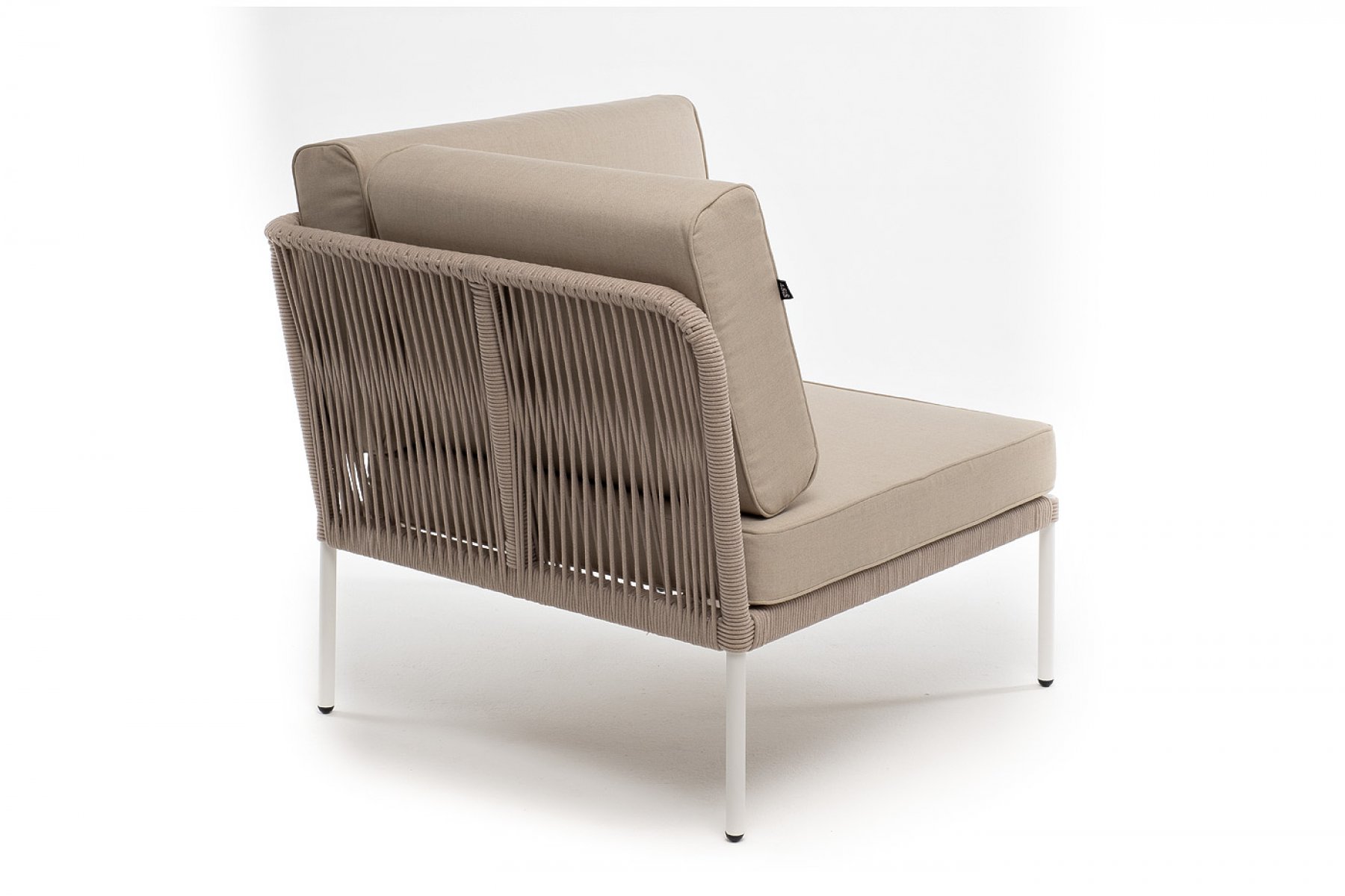 Плетеный модуль имеет алюминиевый каркас, окрашенный порошковой краской в белый цвет. Боковины каркаса вручную оплетены роупом - эластичными синтетическими лентами, изготовленными из высокопрочных полиэфирных волокон. Цвет оплетки - бежевый.