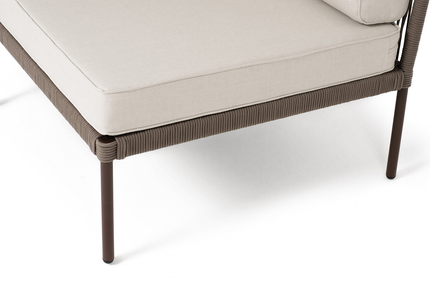 Плетеный модуль имеет алюминиевый каркас, окрашенный порошковой краской в коричневый цвет. Боковины каркаса вручную оплетены роупом - эластичными синтетическими лентами, изготовленными из высокопрочных полиэфирных волокон. Цвет оплетки - коричневый.
