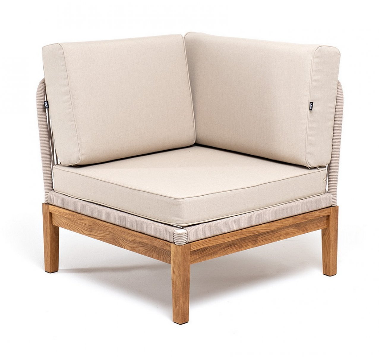 "Канны" угловой модуль плетеный из роупа, основание дуб, роуп бежевый круглый, ткань бежевая 15052