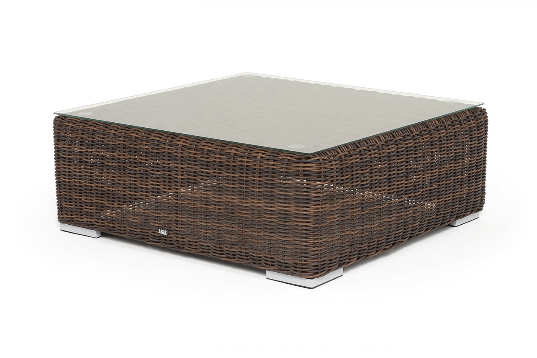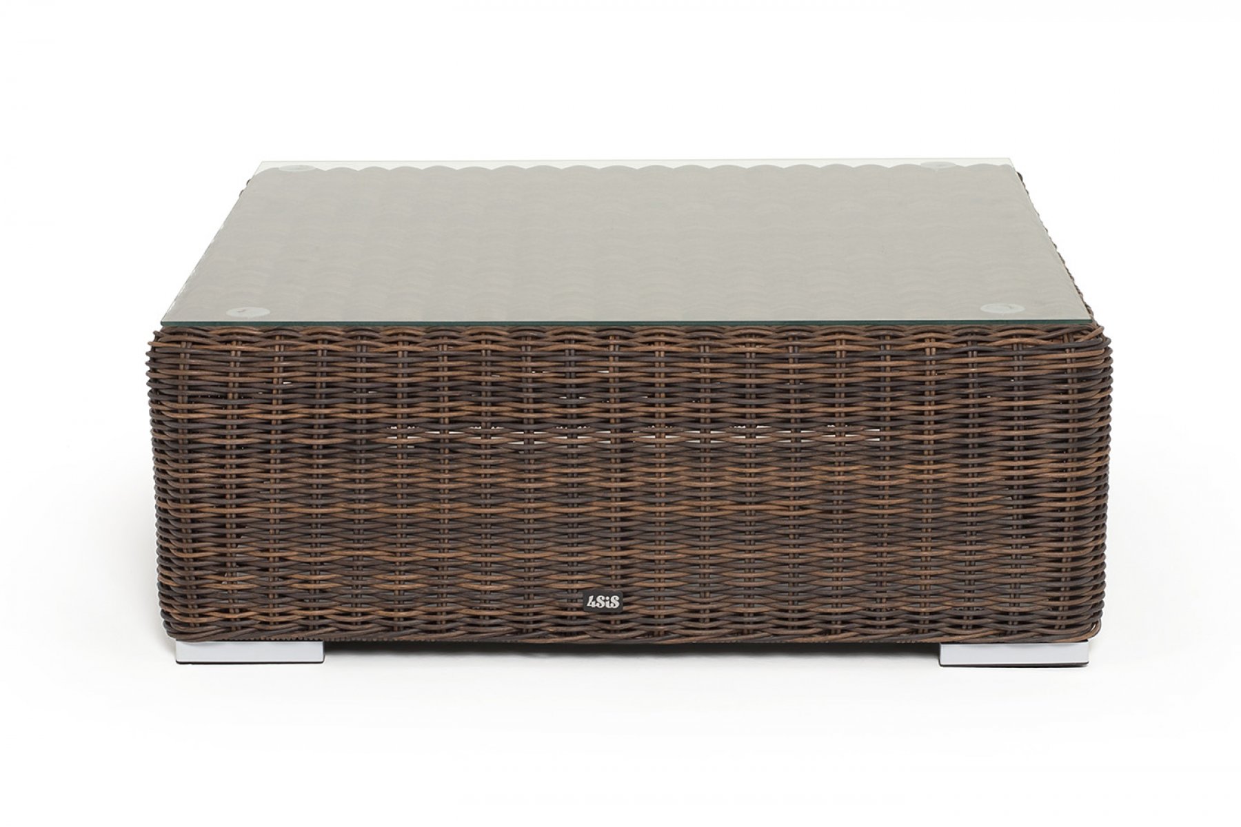 Размер модели – 950×950×370 мм. Ее каркас сделан из высокопрочного алюминия, который оплетен искусственным ротангом с помощью ручного круглого плетения. Столик представлен в коричневом цвете.