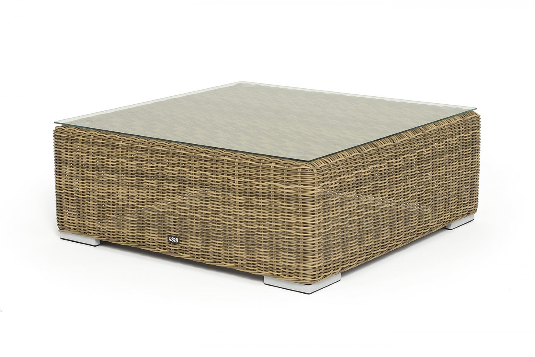 Размер модели – 950×950×350 мм. Ее каркас сделан из высокопрочного алюминия, который оплетен искусственным ротангом с помощью ручного круглого плетения. Столик представлен в соломенном цвете.
