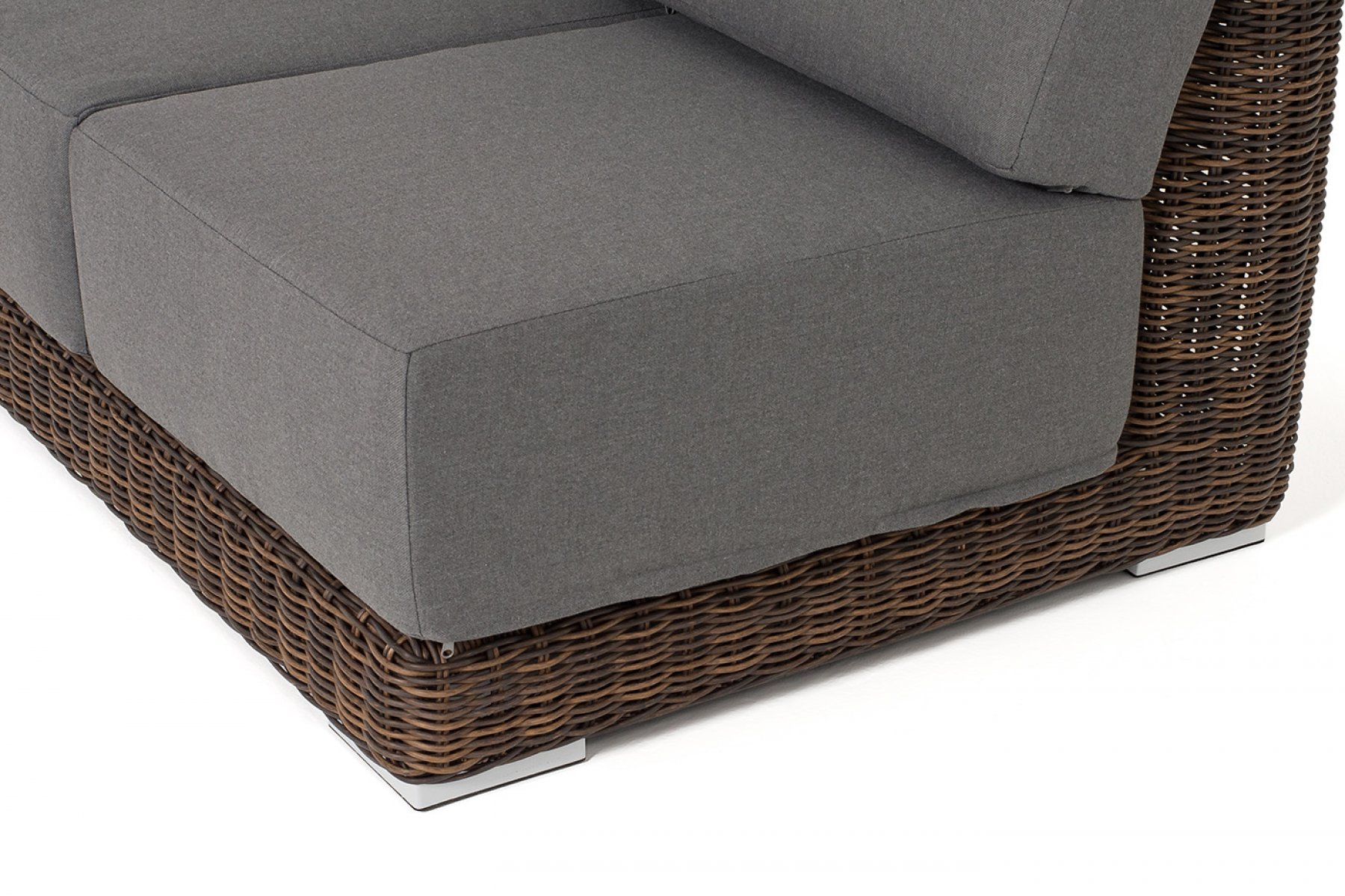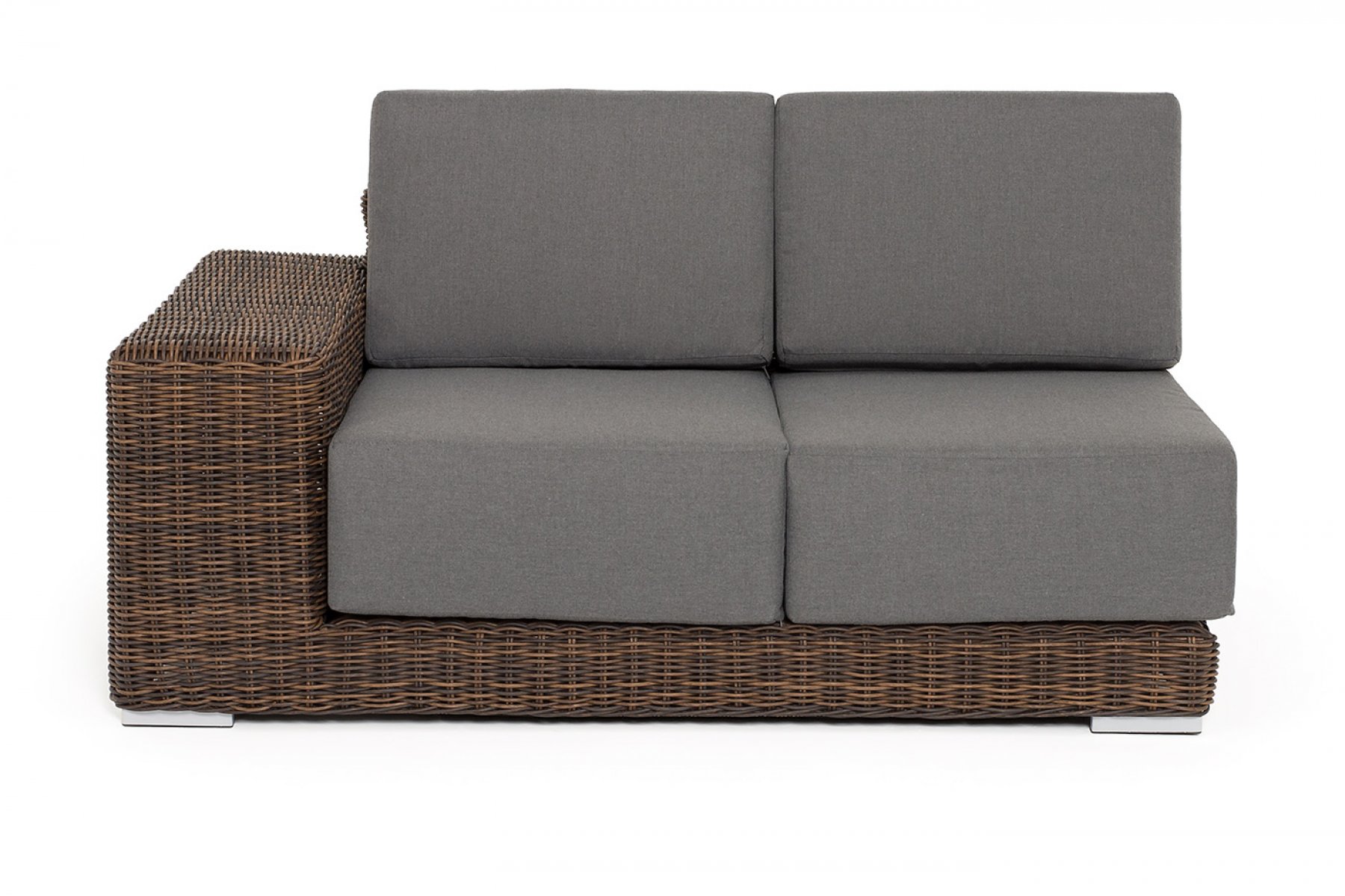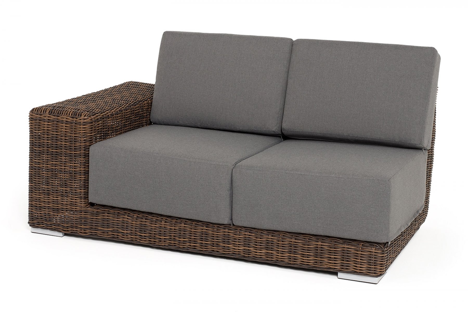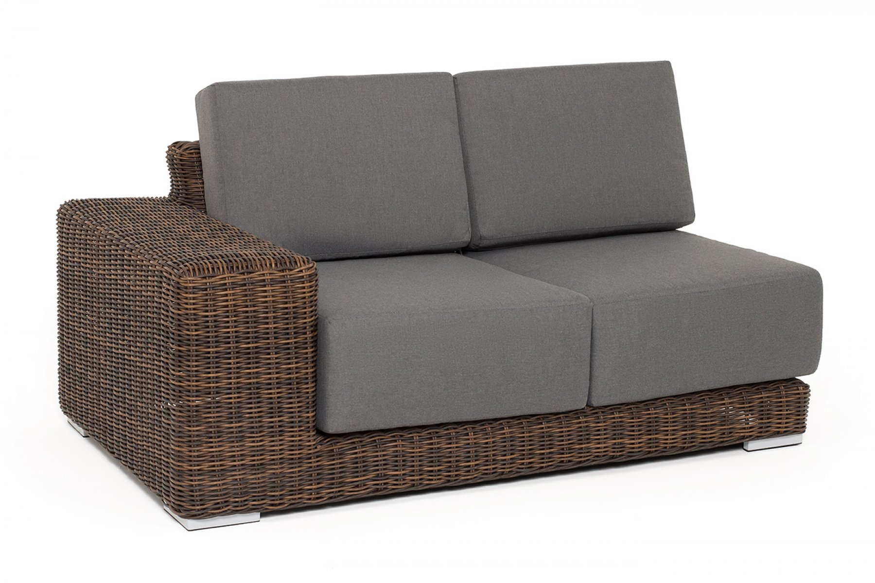 Правый модуль «Капри», выполненный из круглого искусственного ротанга коричневого оттенка, позволяет использовать не только как самостоятельный элемент, но и быть частью лаунж-зоны, в которую данная модель превосходно интегрируется.