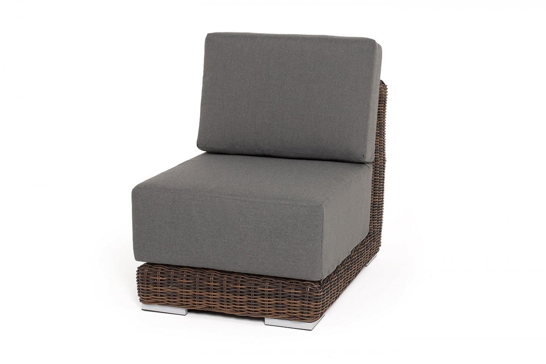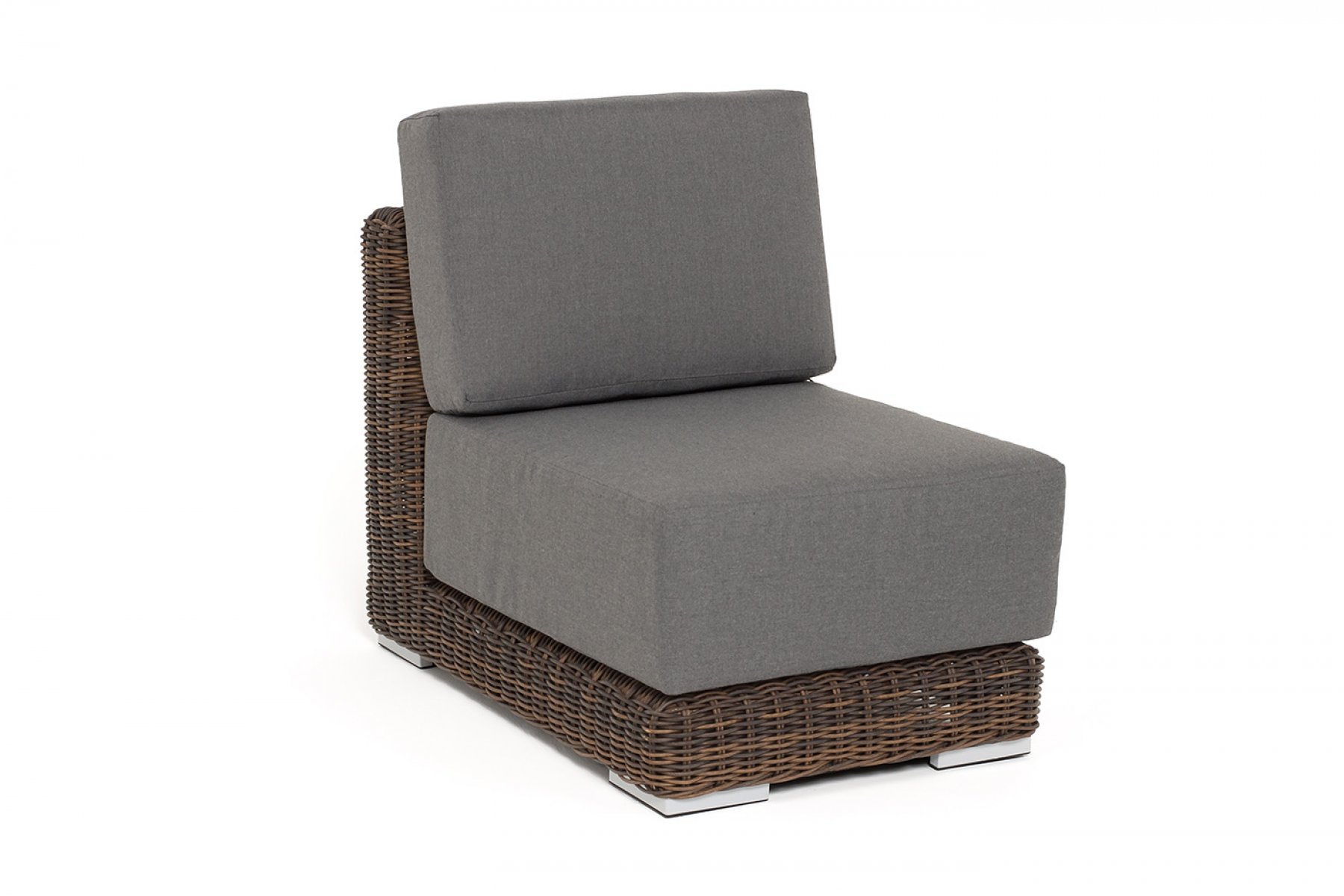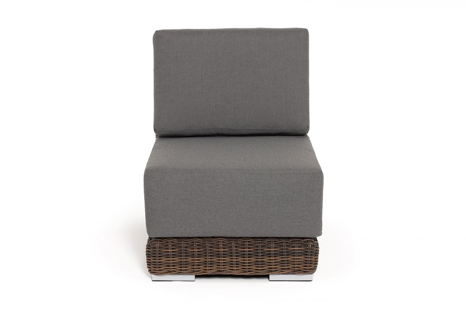 Прямой модуль «Капри», выполненный из круглого искусственного ротанга коричневого оттенка, позволяет использовать не только как самостоятельный элемент, но и быть частью лаунж-зоны, в которую данная модель превосходно интегрируется.