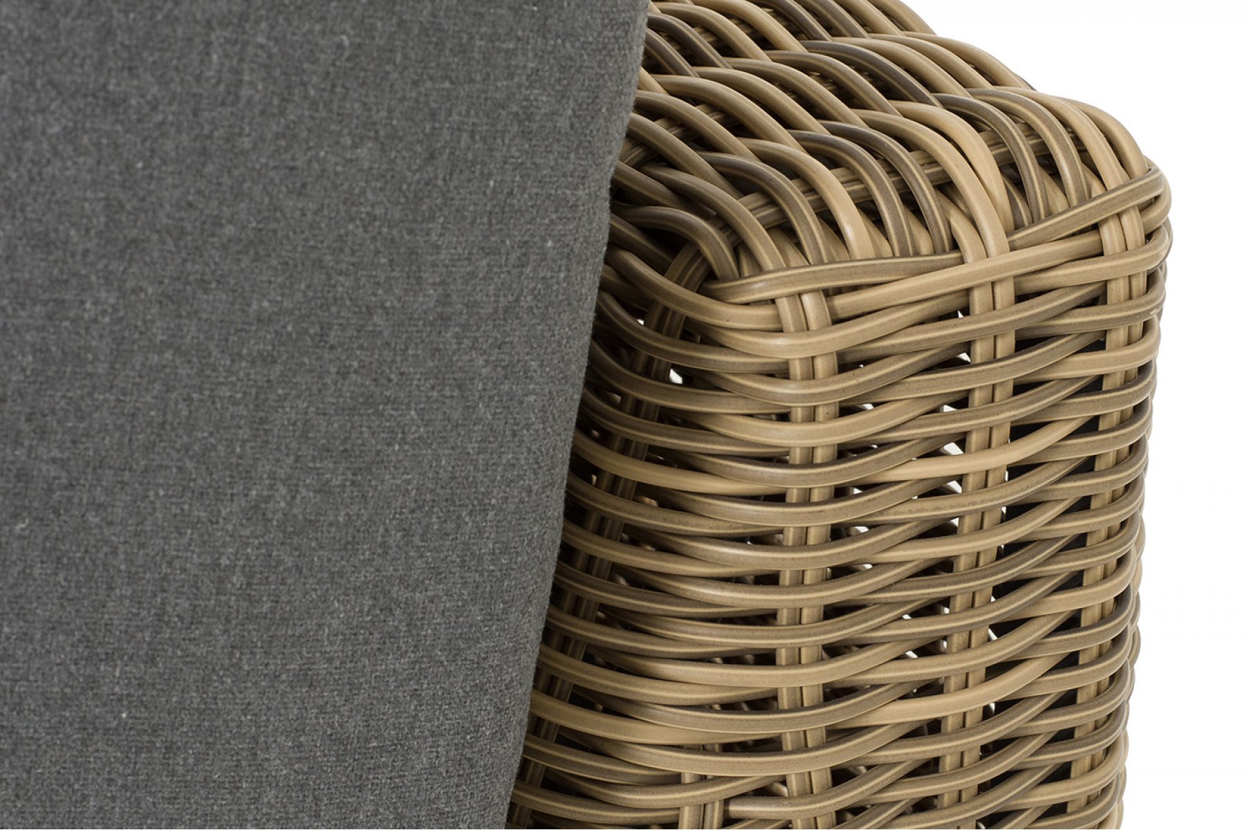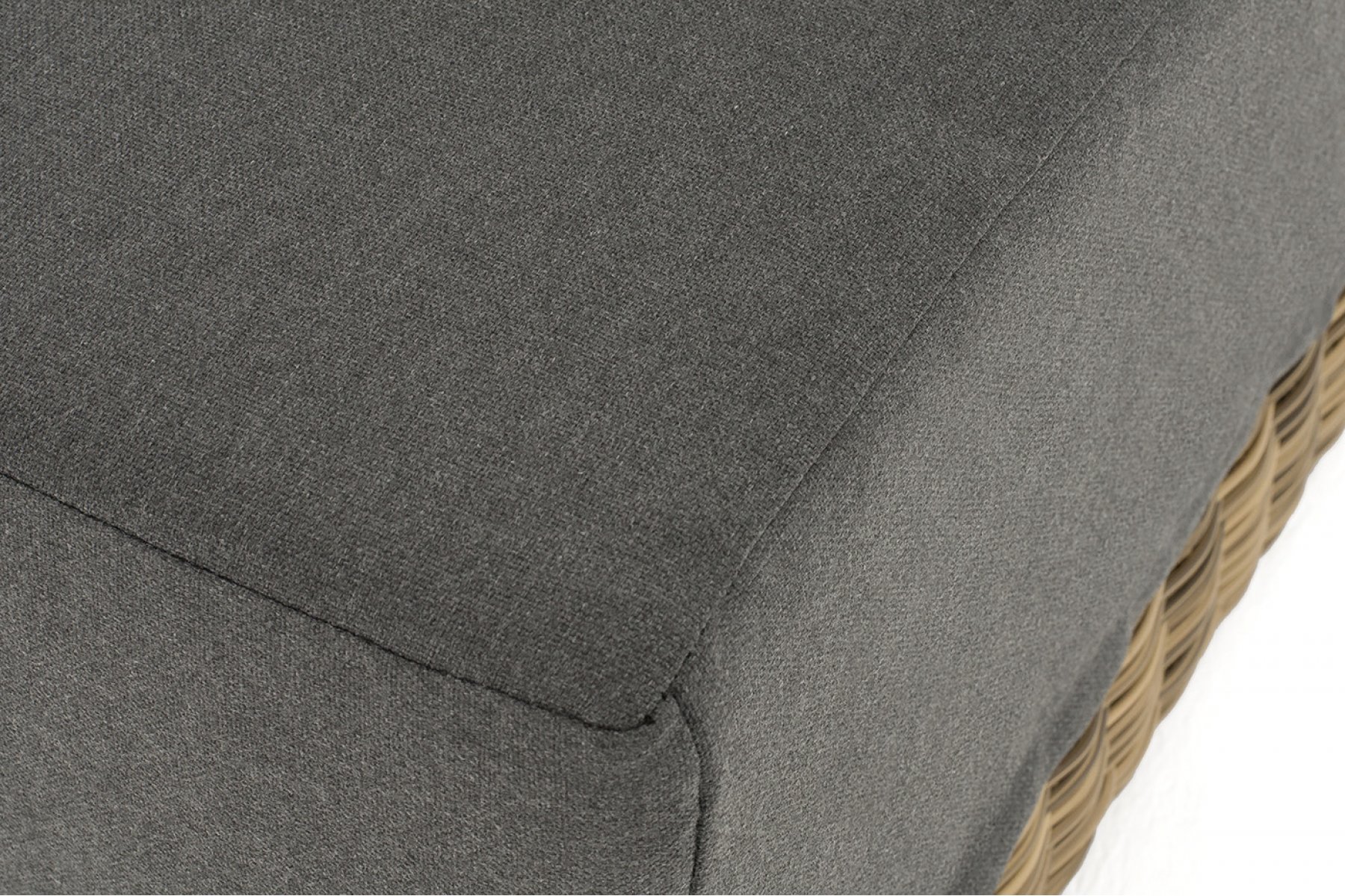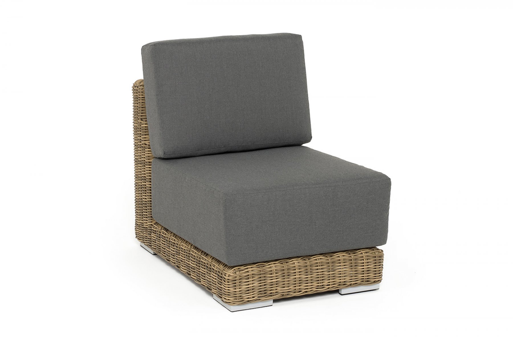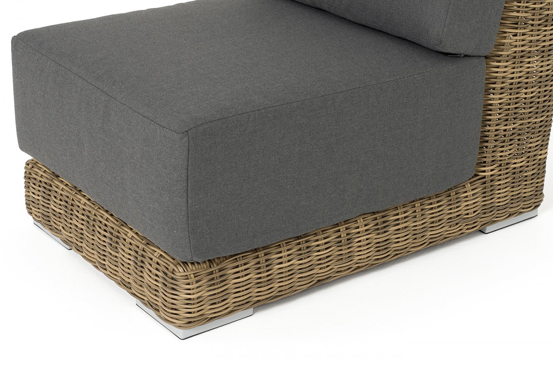 Прямой модуль «Капри», выполненный из круглого искусственного ротанга соломенного оттенка, позволяет использовать не только как самостоятельный элемент, но и быть частью лаунж-зоны, в которую данная модель превосходно интегрируется.