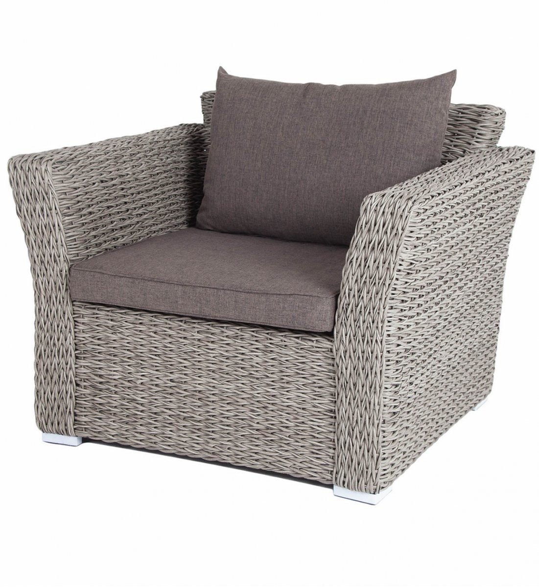 Кресло из искусственного ротанга «Капучино» серого цвета, прекрасно подходит для обустройства веранды, а относительно небольшой вес, который составляет 21,5 кг, увеличивает мобильность данной модели. Плетение используется вида «гиацинт».