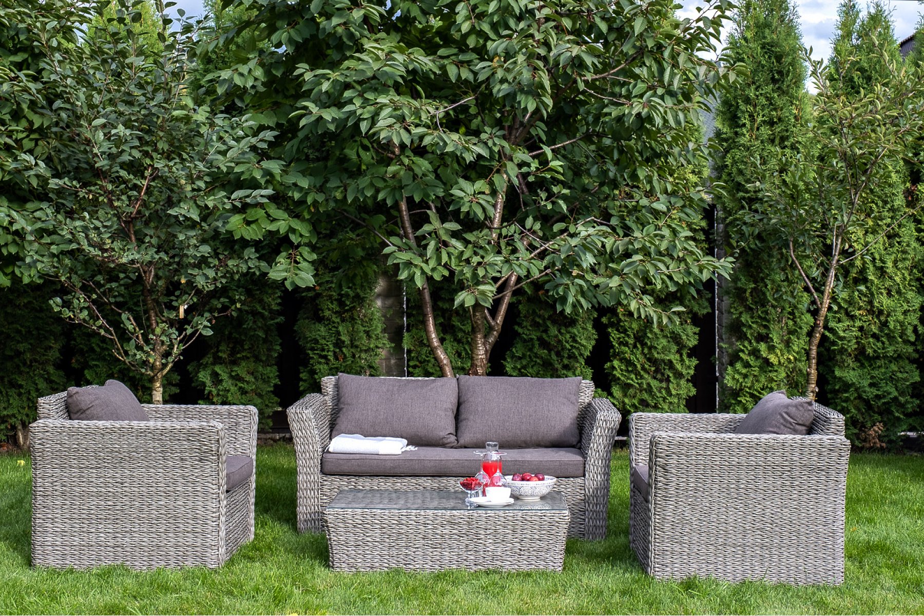 Более комфортной лаунж-зону делают мягкие подушки с чехлами из серого полиэстера плотностью 300гр/м2. Ткань предварительно "Капучино" кресло из искусственного ротанга (гиацинт), цвет серый 2шт. 1 040Х865Х815, "Капучино" журнальный столик из искусственного ротанга (гиацинт), цвет серый 1шт. 1 110Х660Х340, "Капучино" диван из искусственного ротанга (гиацинт) двухместный, цвет серый 1шт. 1 700Х865Х815,