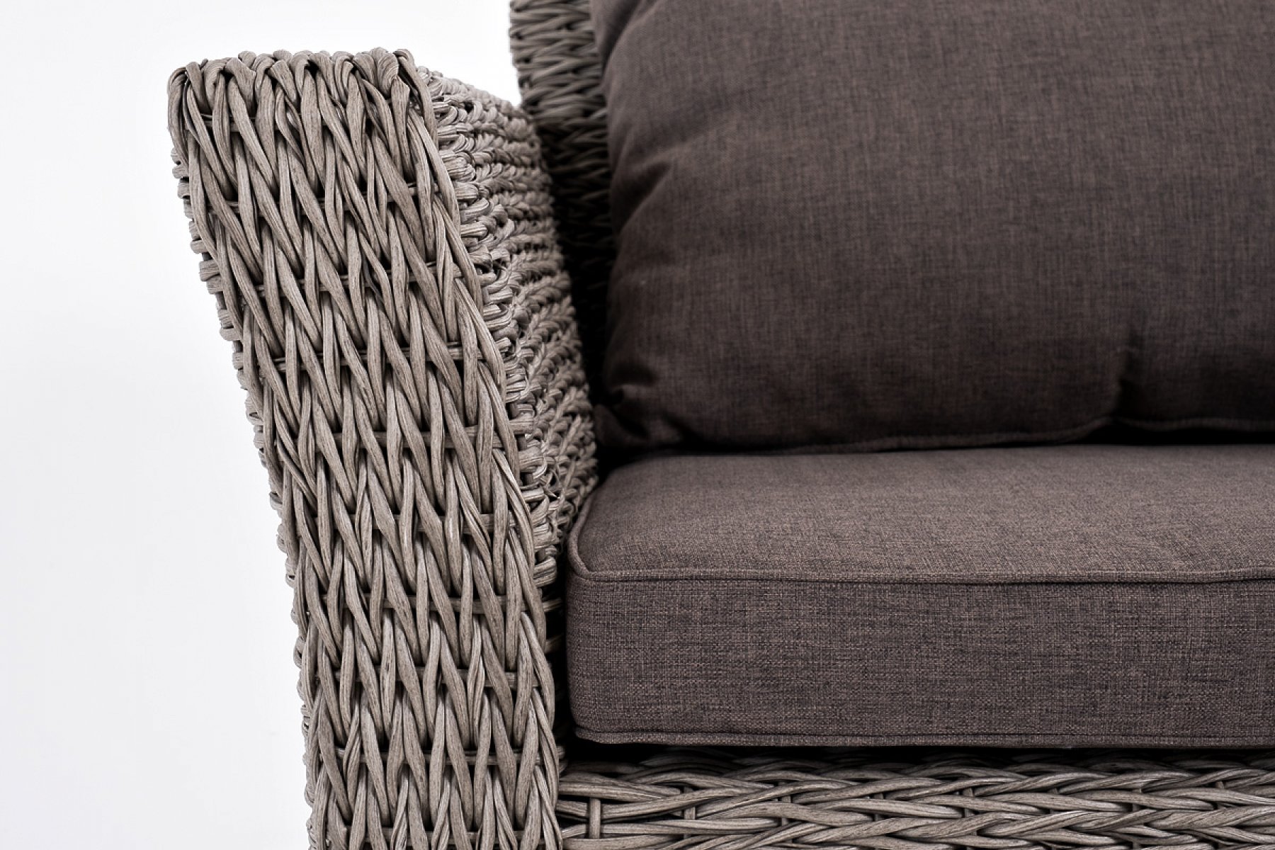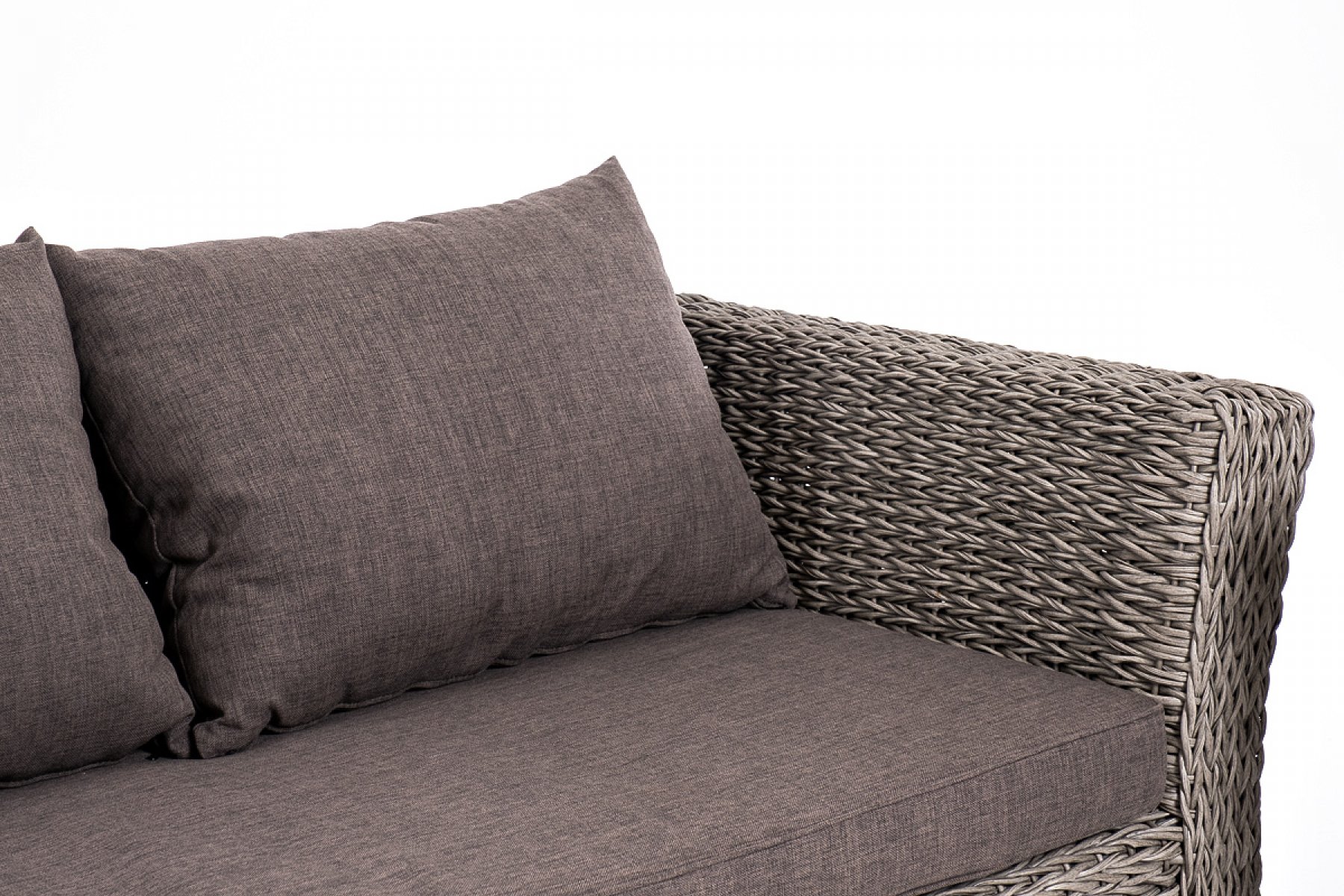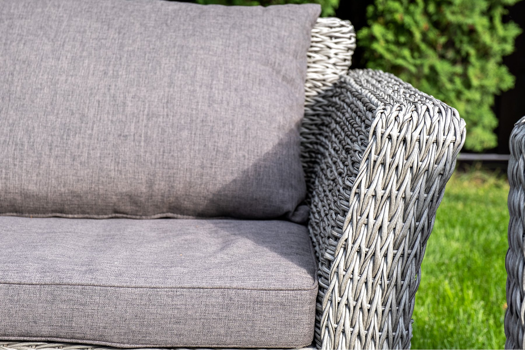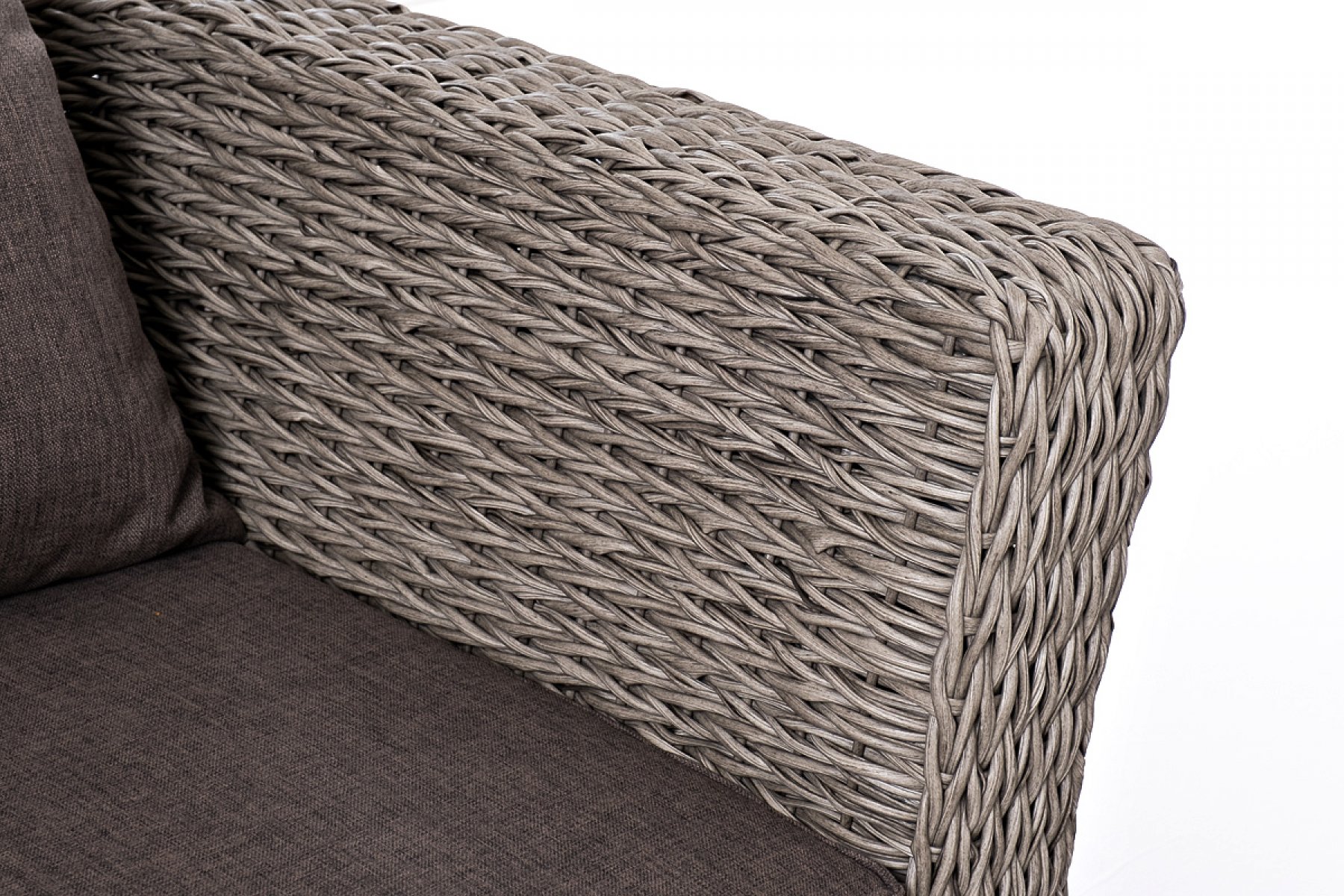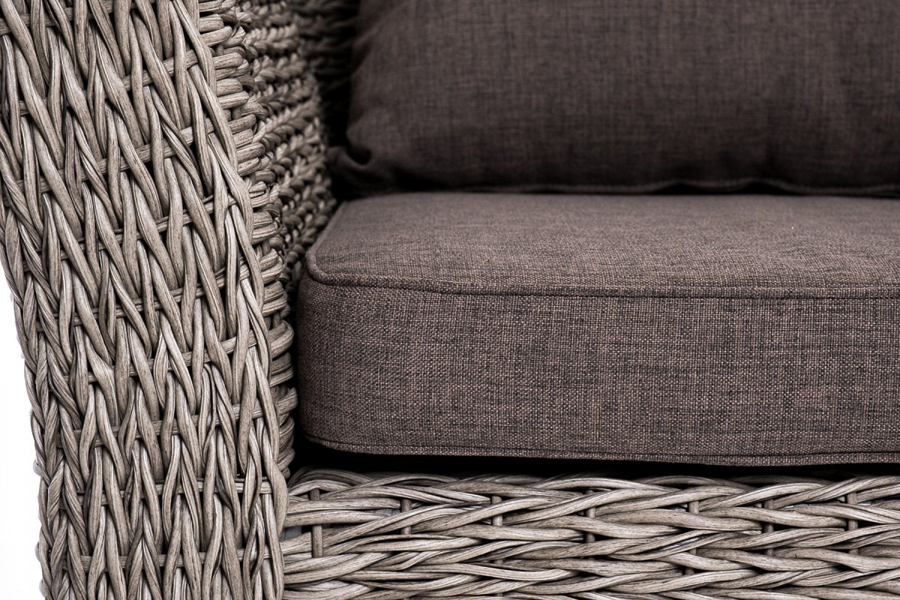 Прочный алюминиевый каркас усиливает устойчивость мебели. Его дополняет плетение в сером цвете, которое представлено из искусственного ротанга вида "гиацинт".