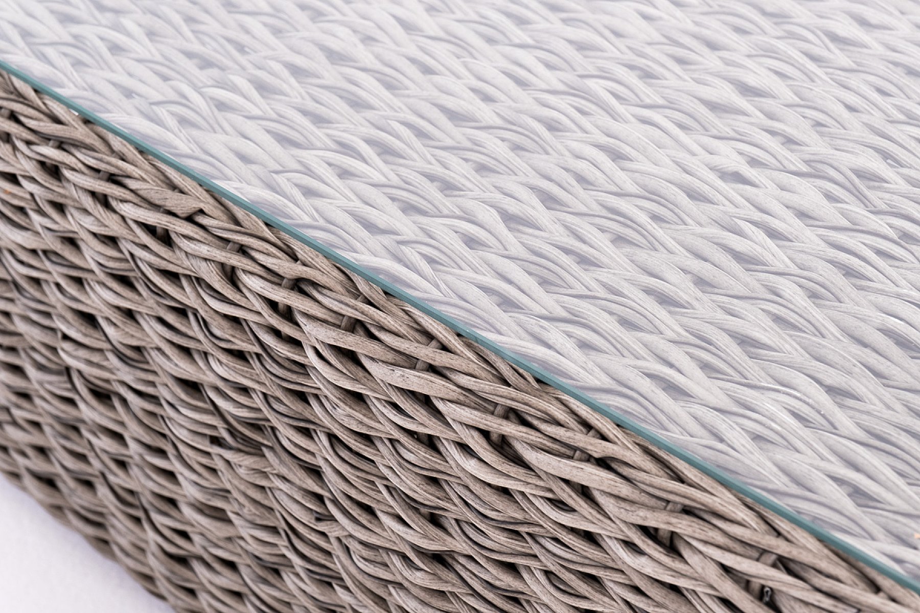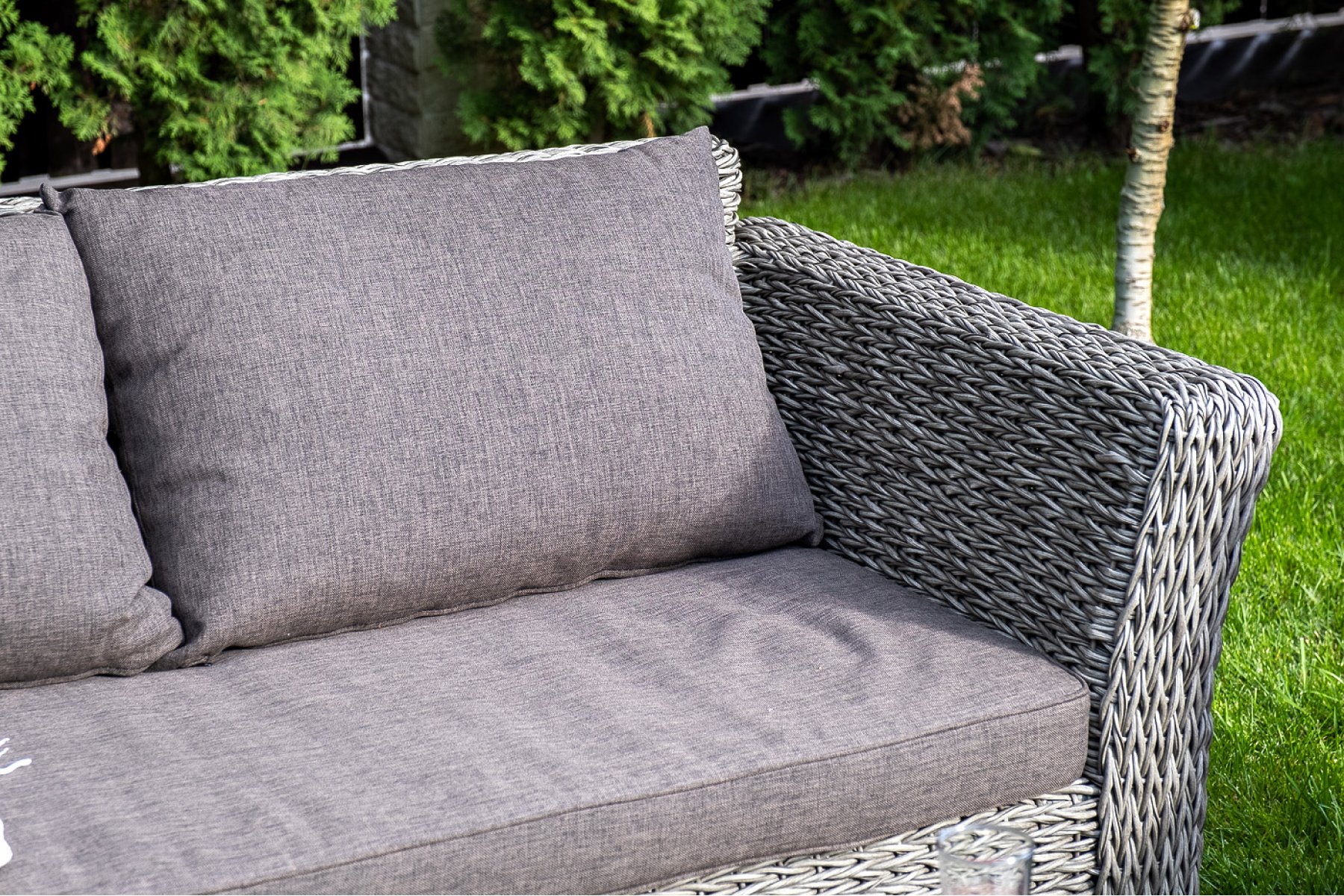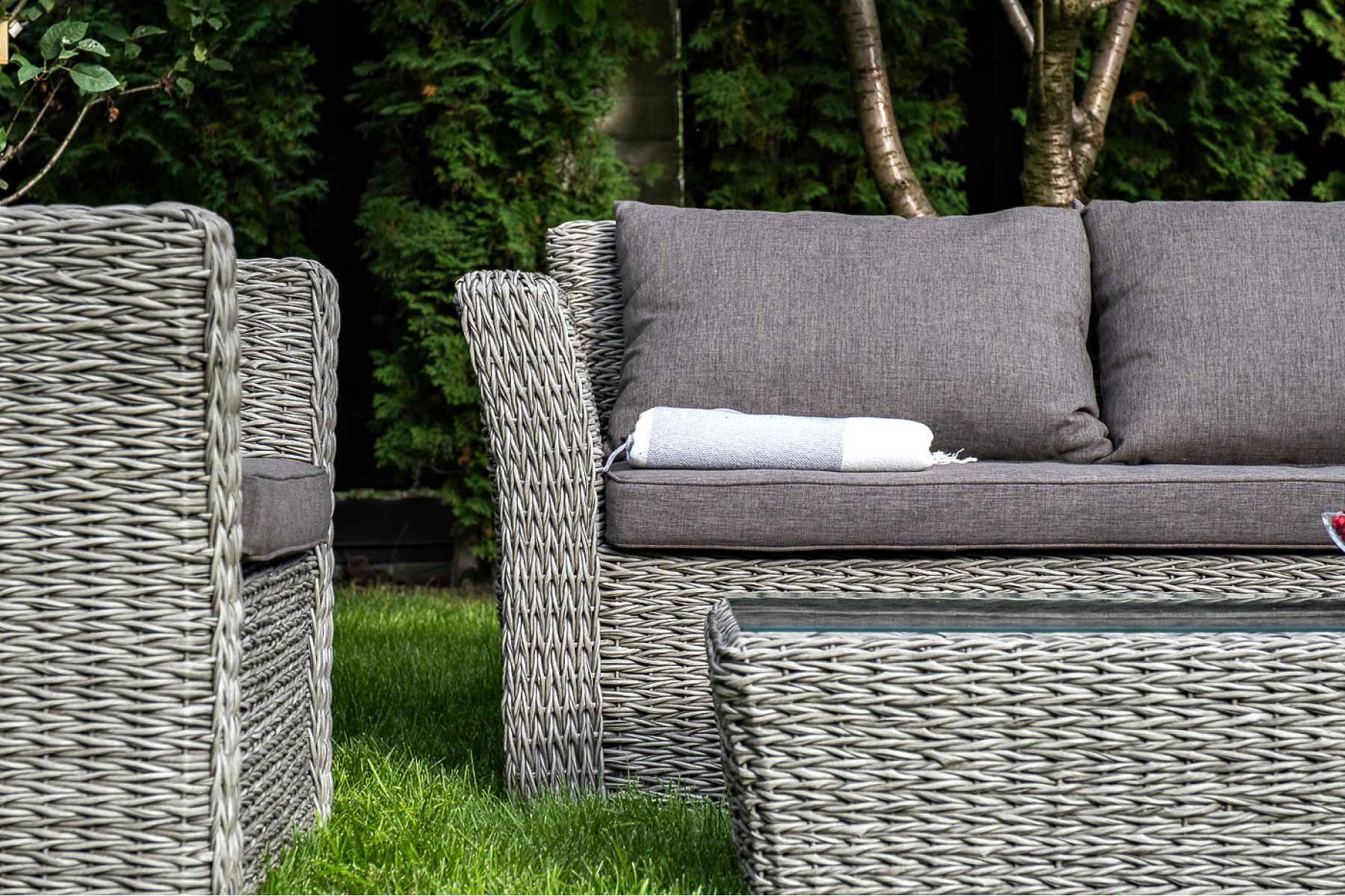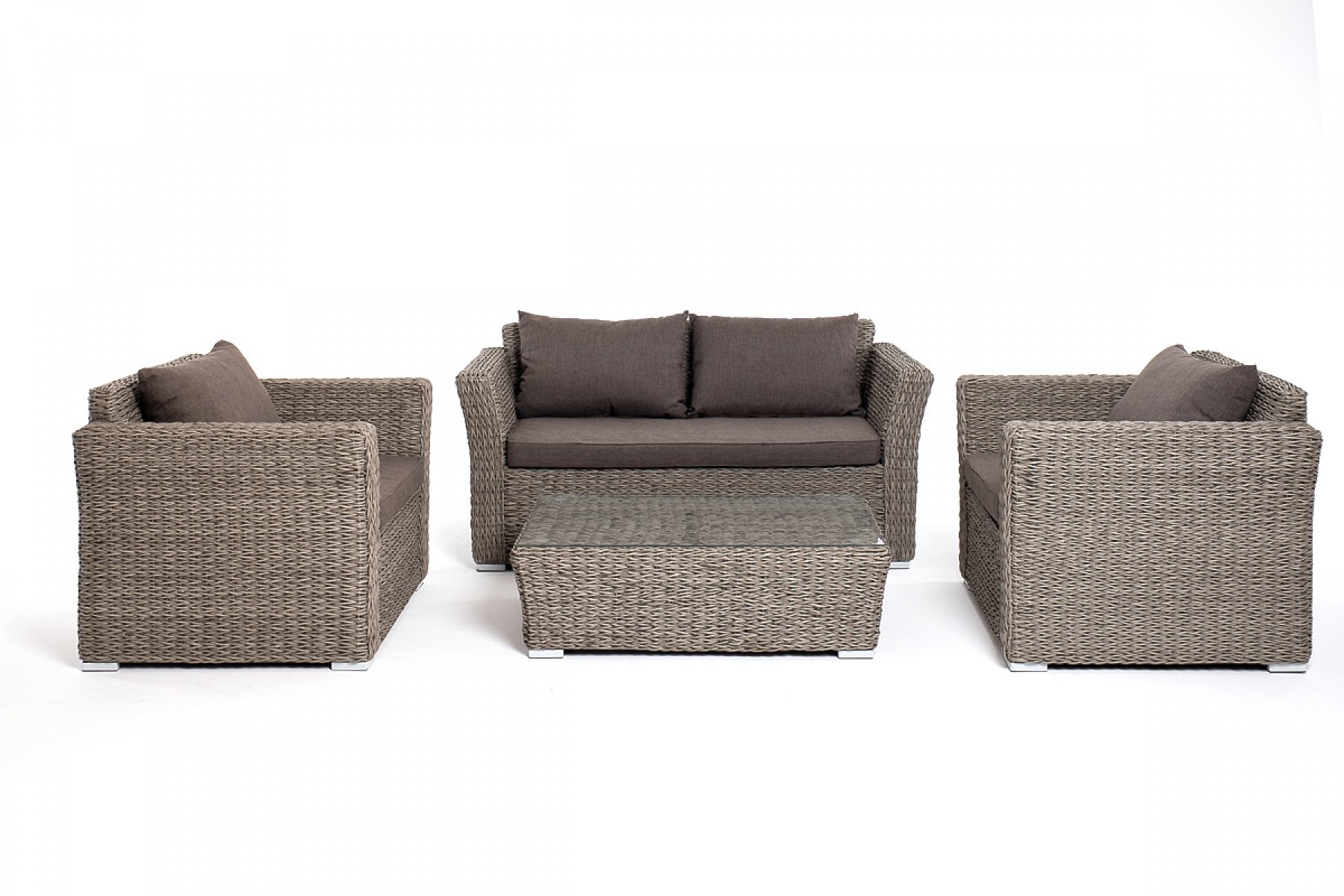 Прочный алюминиевый каркас усиливает устойчивость мебели. Его дополняет плетение в сером цвете, которое представлено из искусственного ротанга вида "гиацинт".