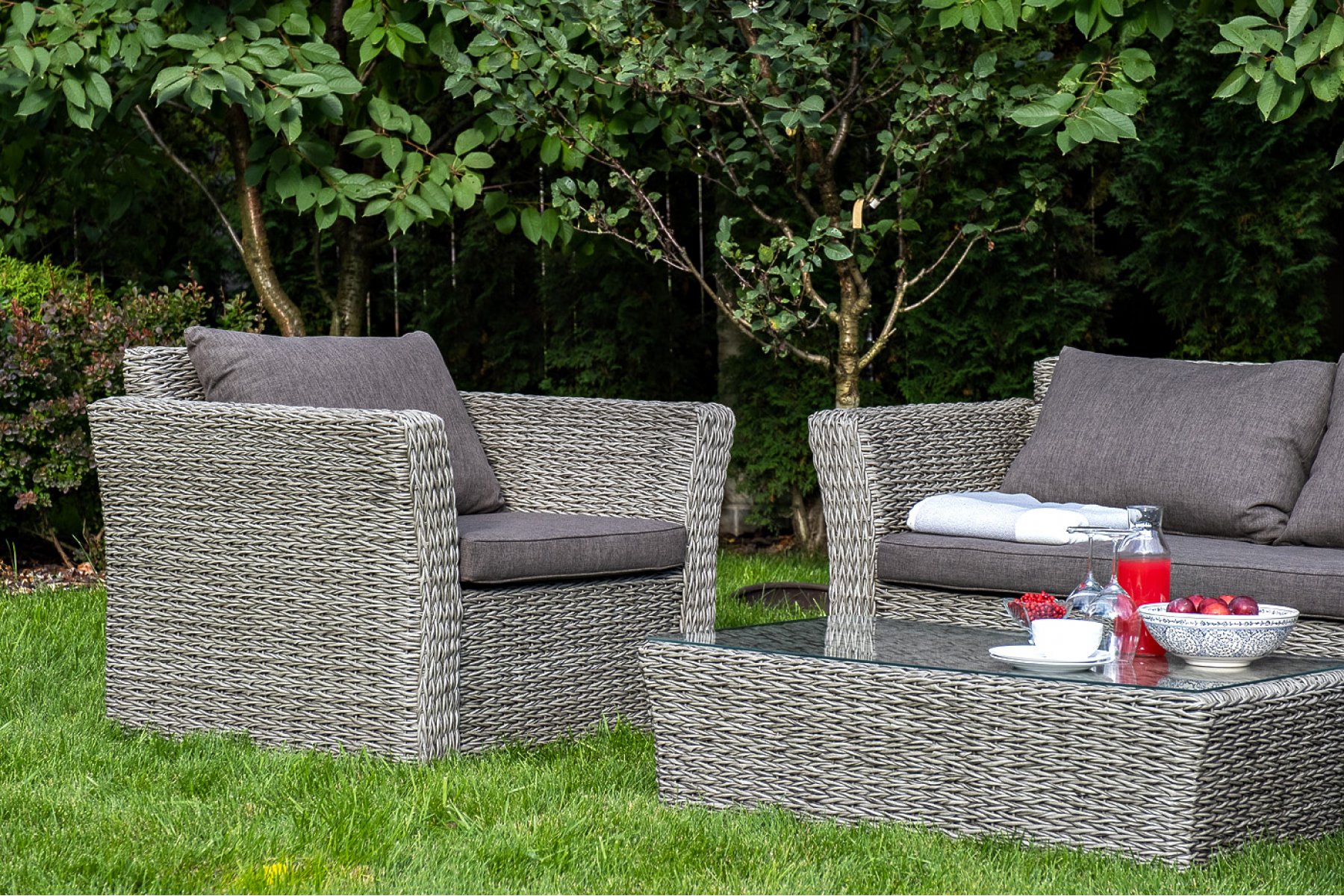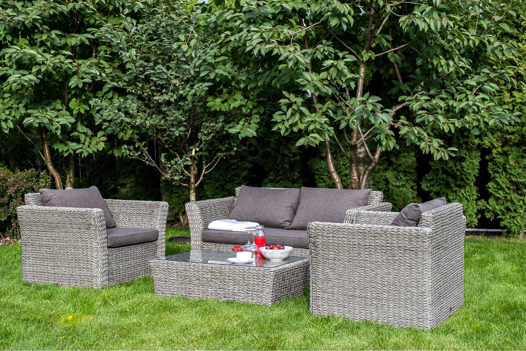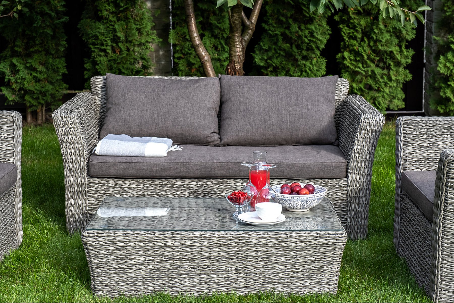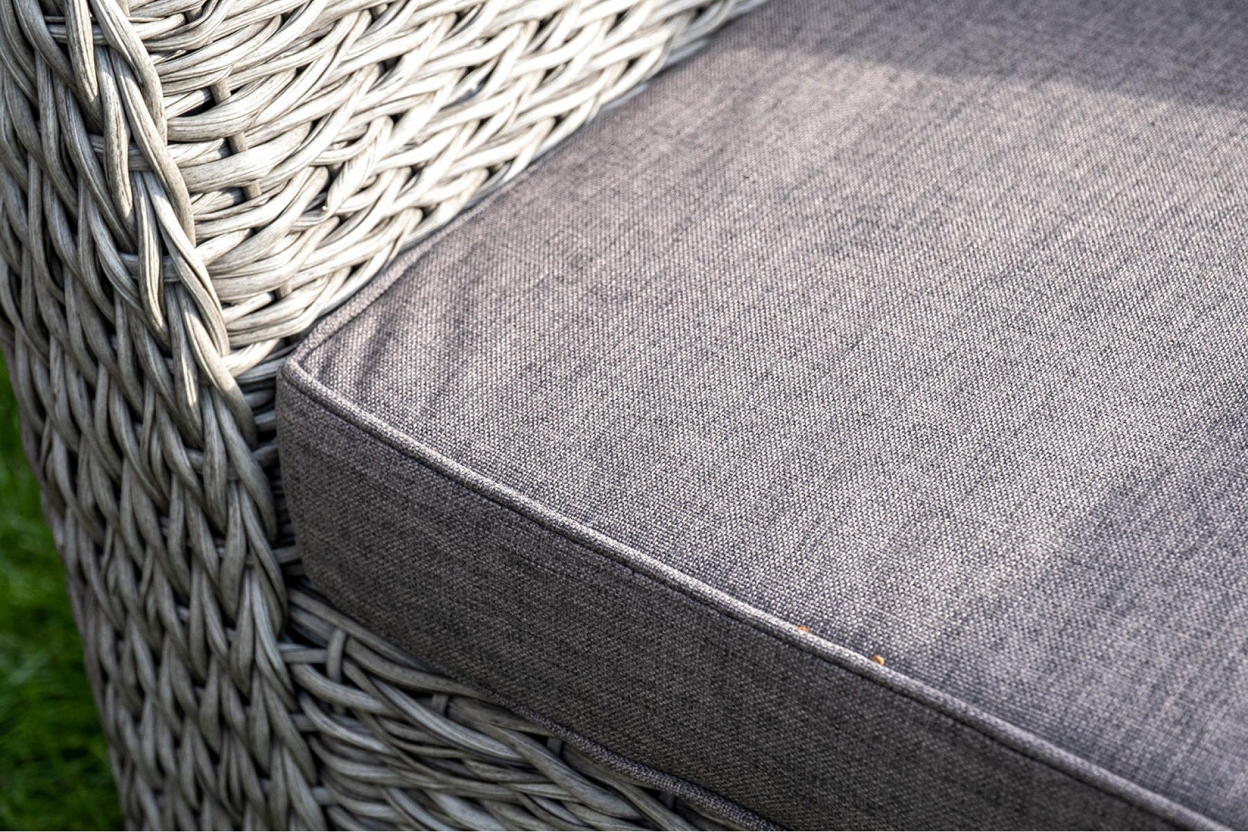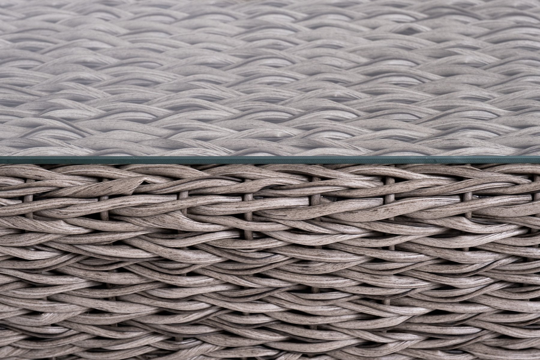 Прочный алюминиевый каркас усиливает устойчивость мебели. Его дополняет плетение в сером цвете, которое представлено из искусственного ротанга вида "гиацинт".