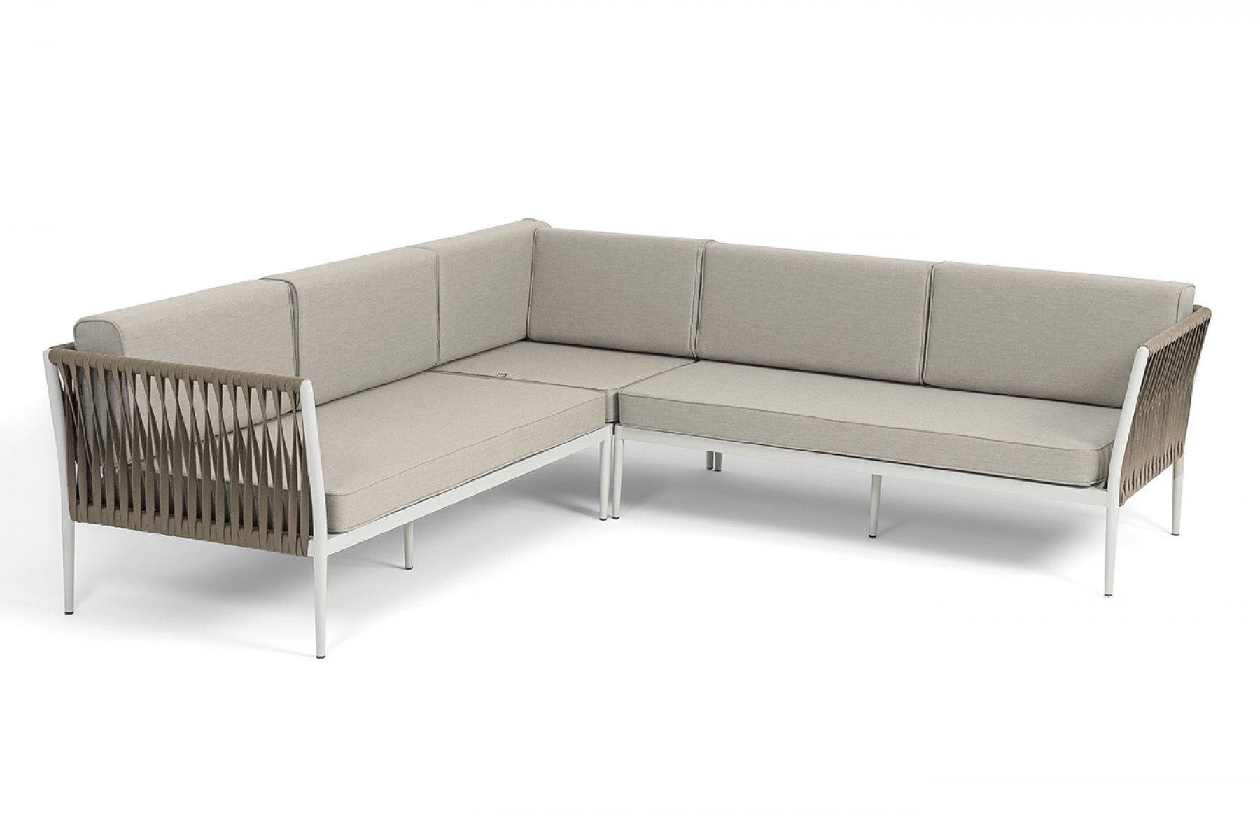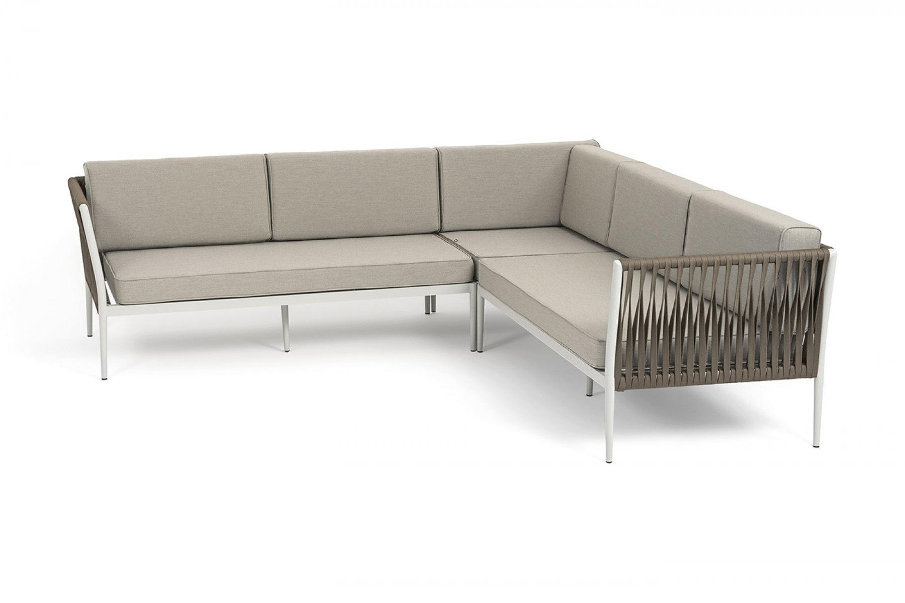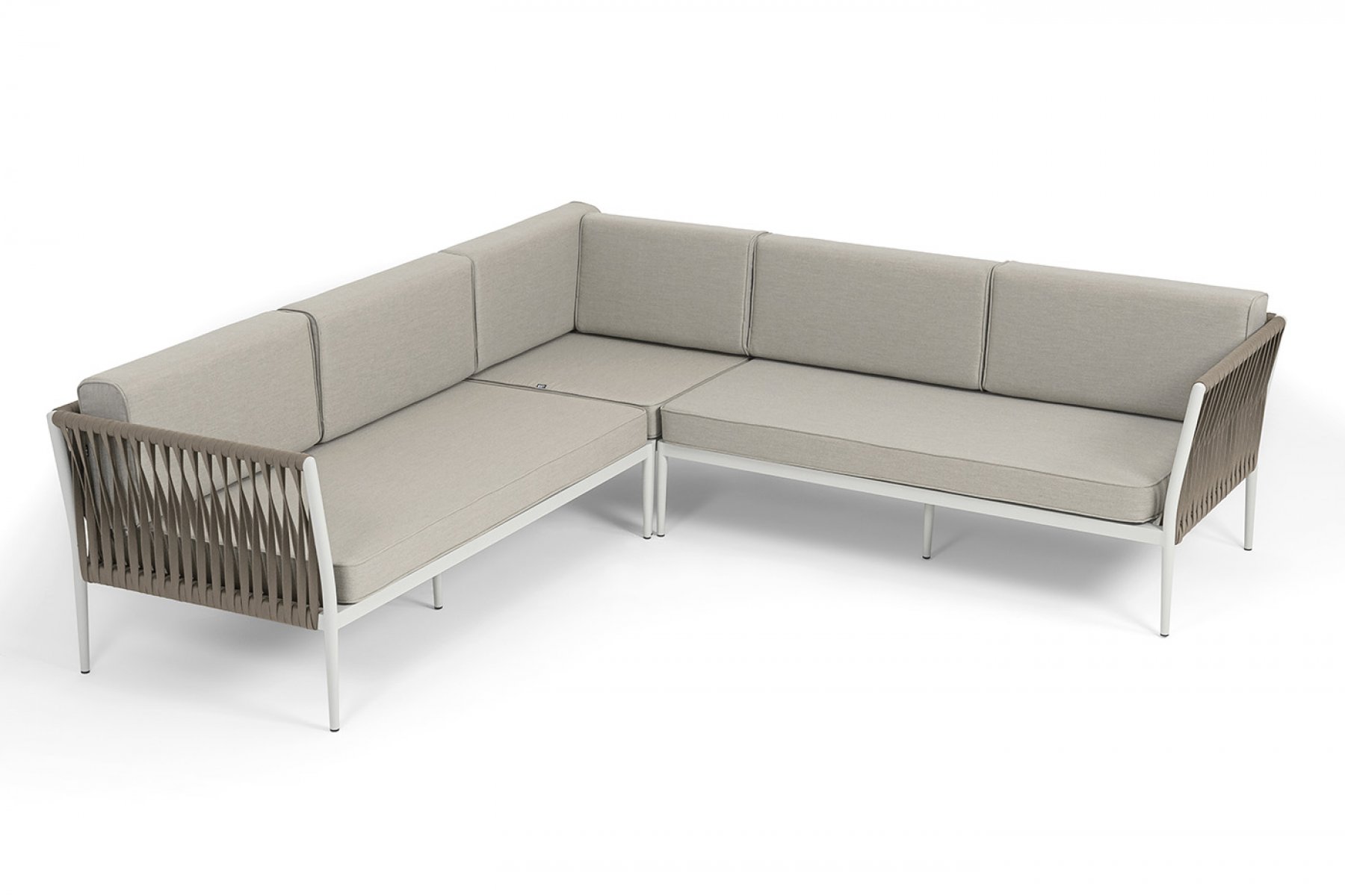 "Касабланка" диван модульный плетеный из роупа, каркас алюминий, роуп серо-коричневый 23мм, ткань бежевая 15052