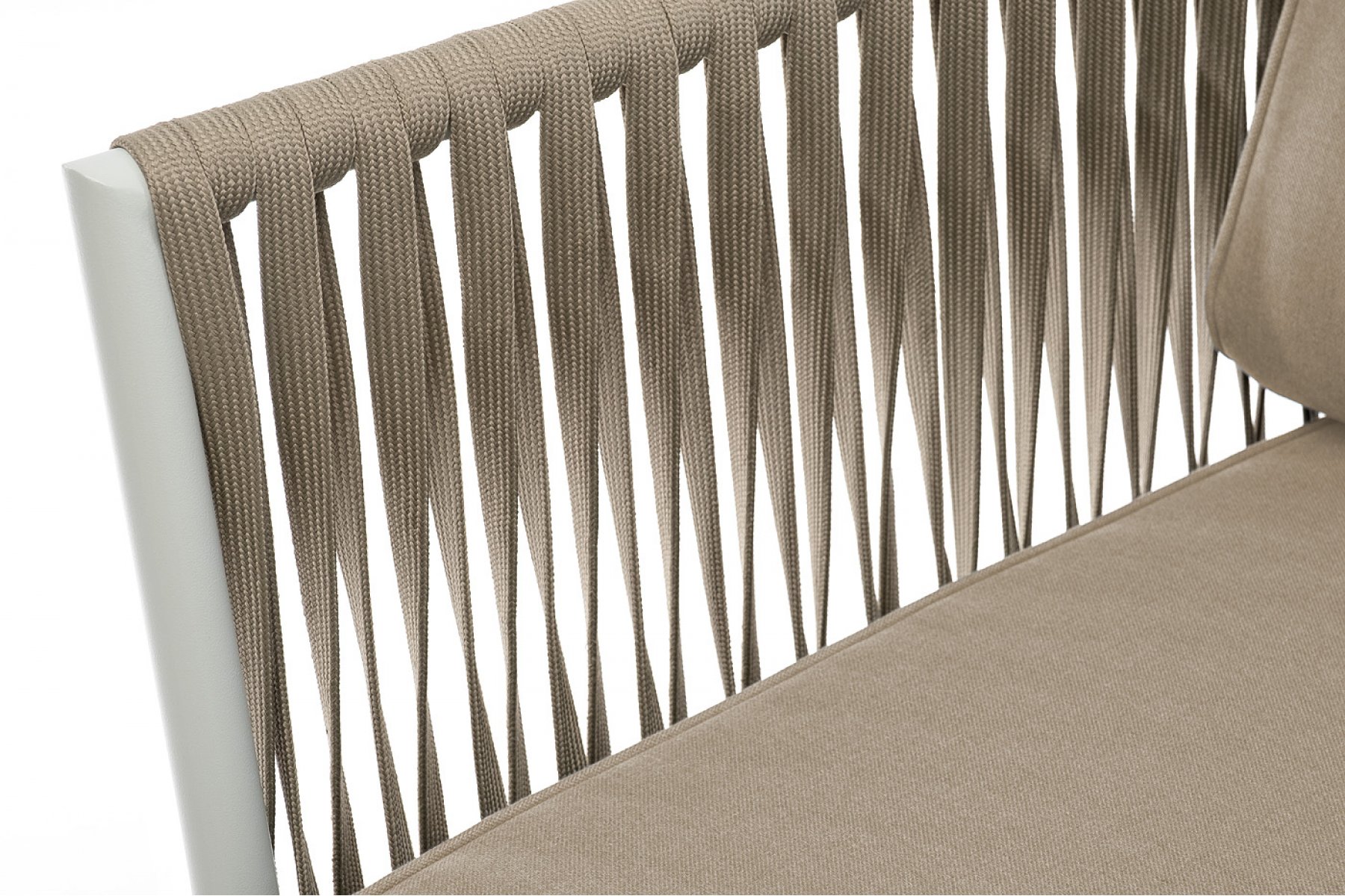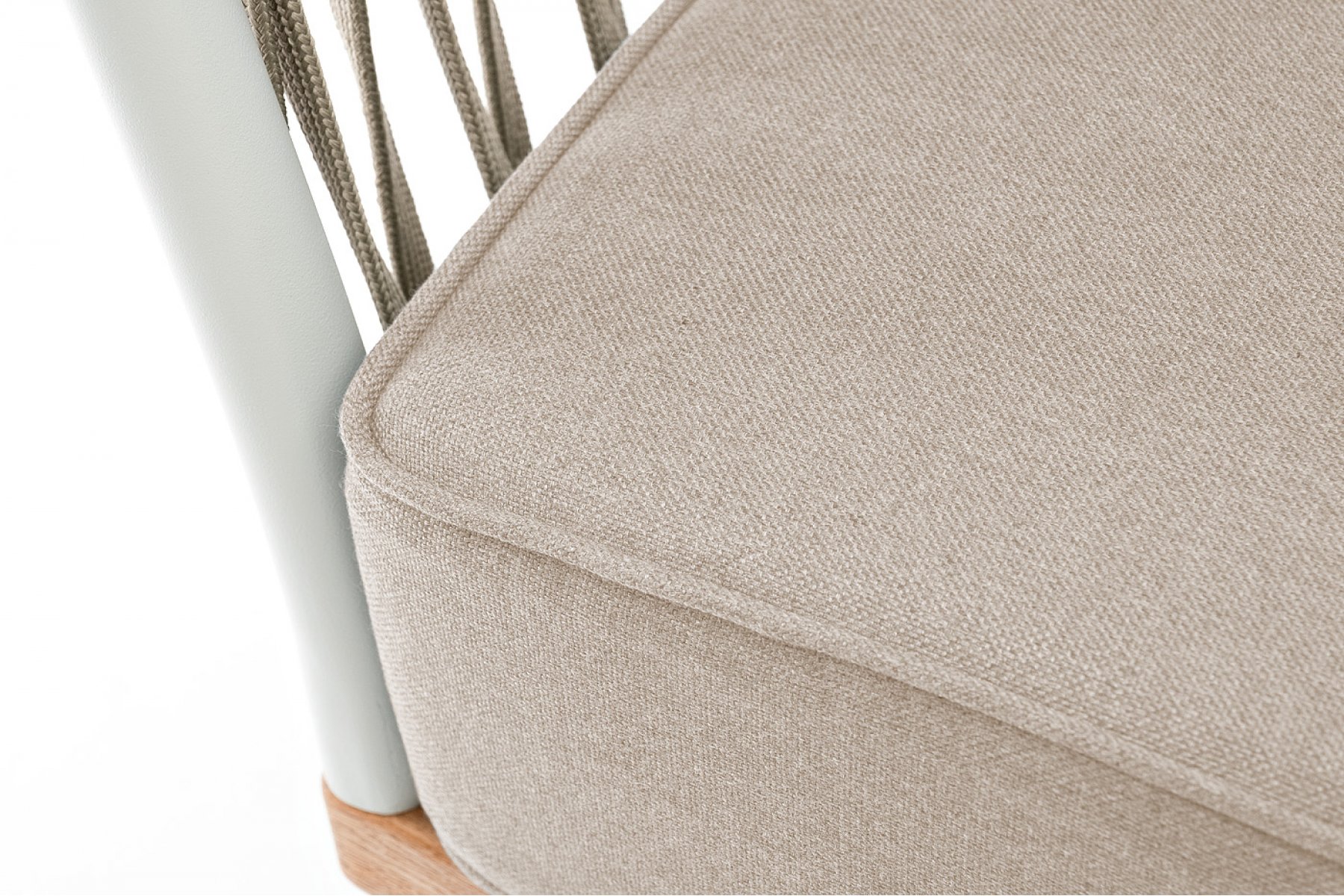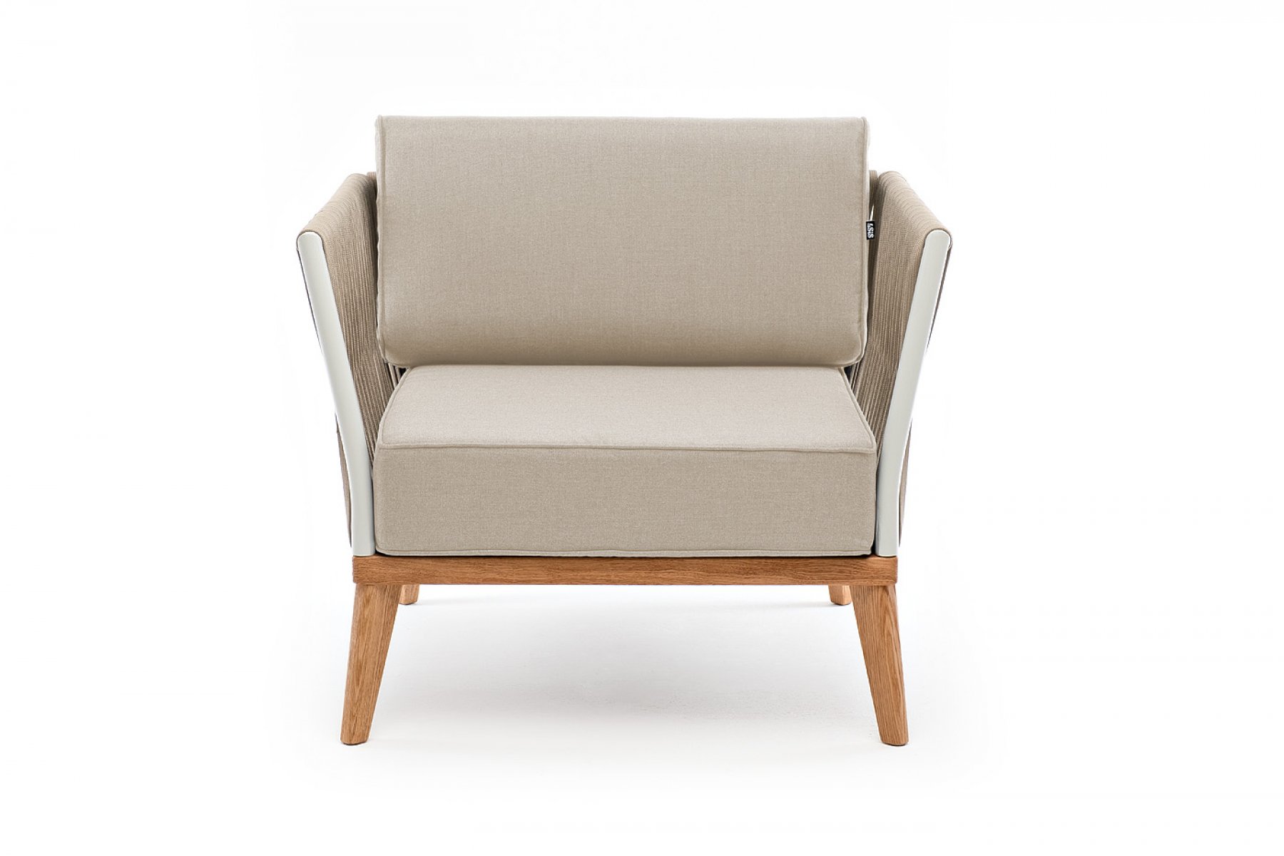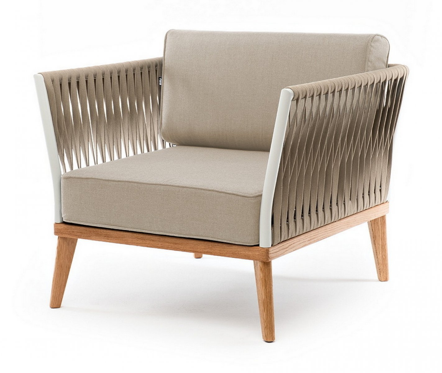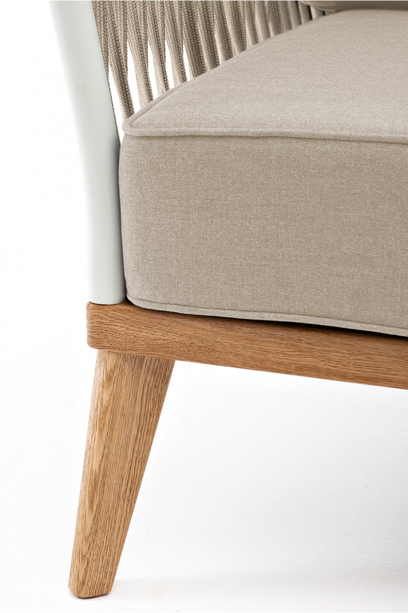 "Касабланка" кресло плетеное из роупа, основание дуб, каркас алюминий светло-серый (RAL7035) муар, роуп серо-коричневый 23мм, ткань бежевая 1