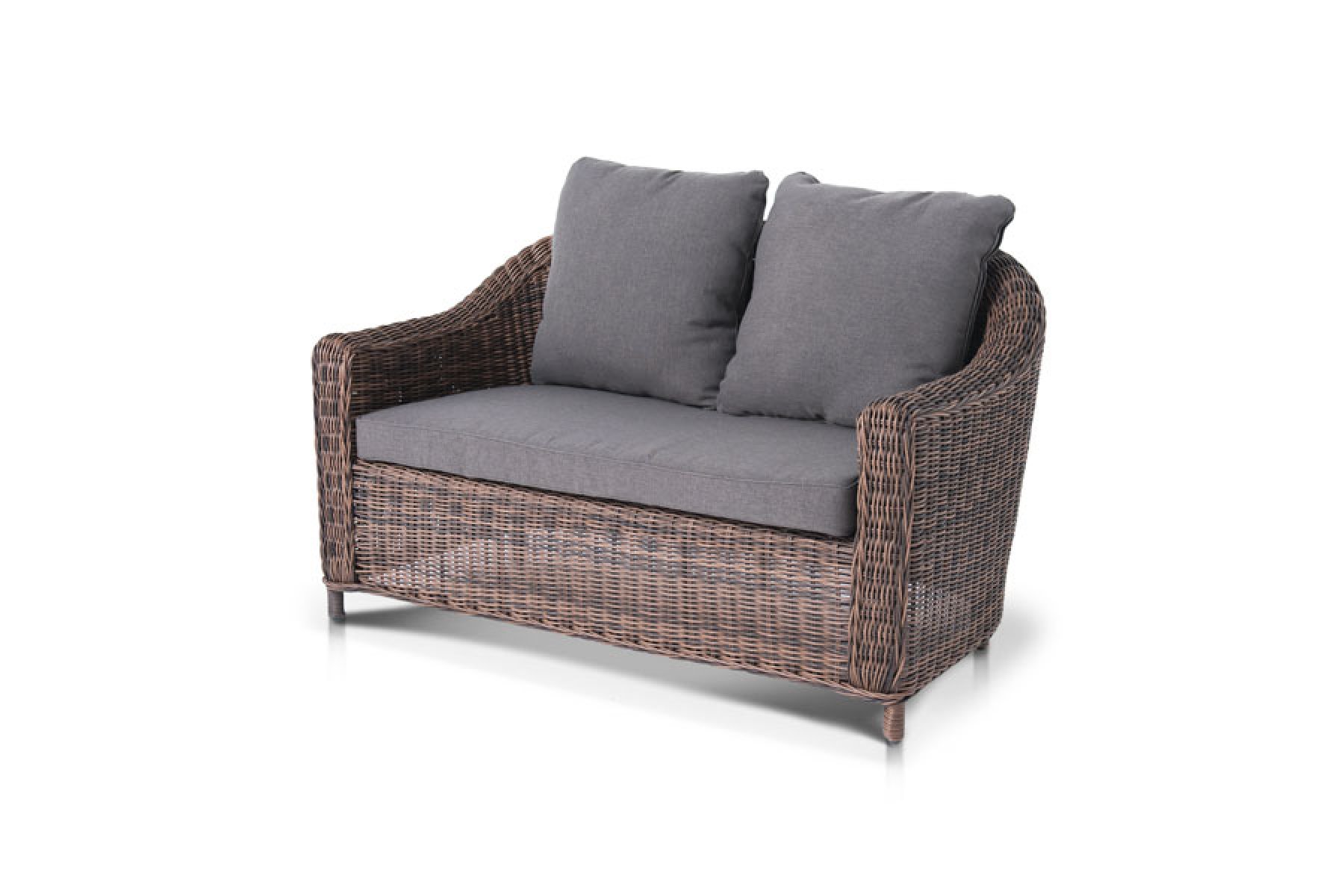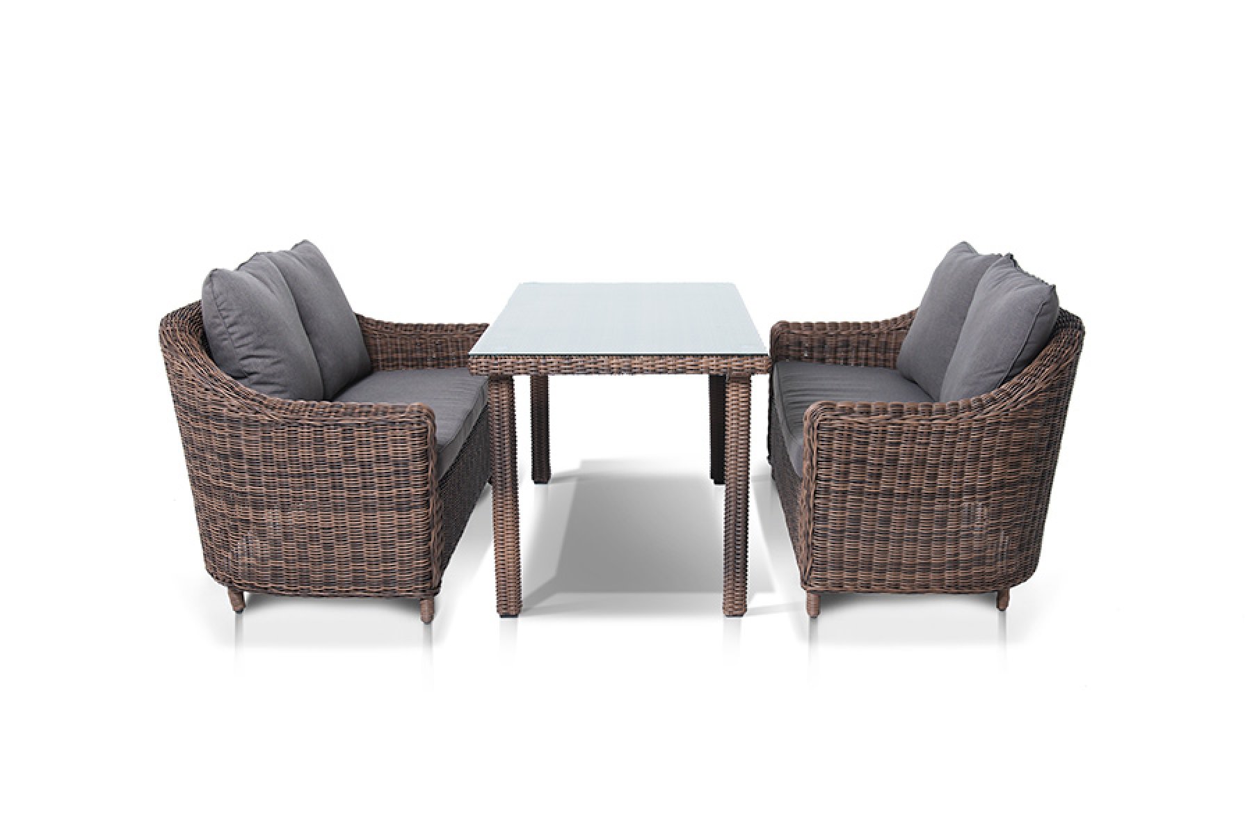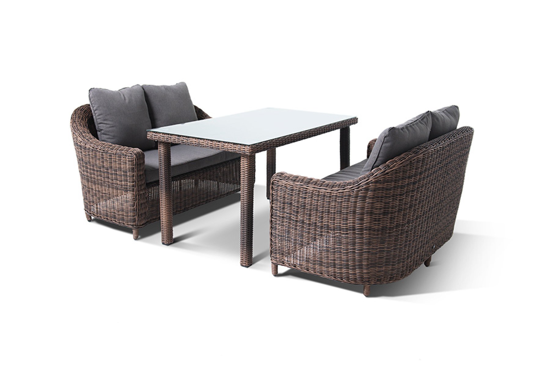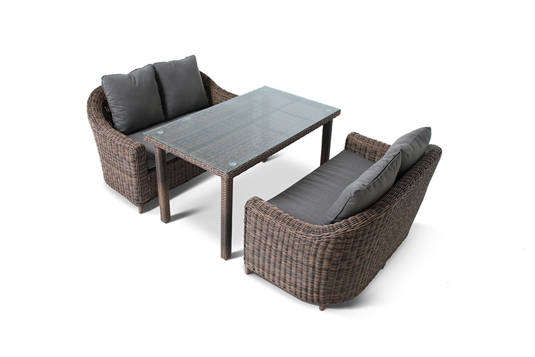 Обеденная группа Кон Панна Дабл из искусственного ротанга: 2 двухместных дивана, обеденный стол со стеклянной столешницей. Алюминиевый каркас, круглый искусственный ротанг, ручное плетение,съемные чехлы серого цвета. "Кон Панна", диван двухместный, коричневый 2шт. 1 370Х800Х800, "Макиато" стол, круглое плетение, коричневый 1шт. 1 400Х800Х750,