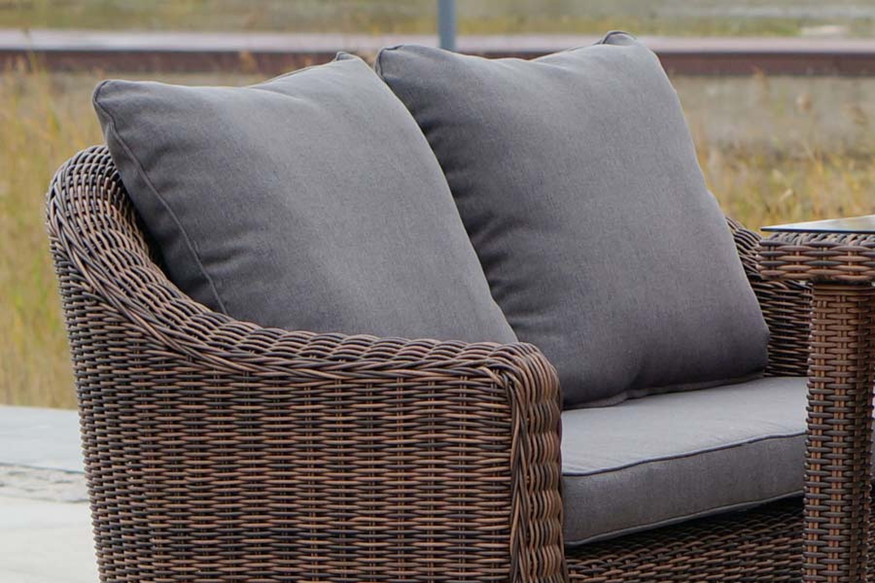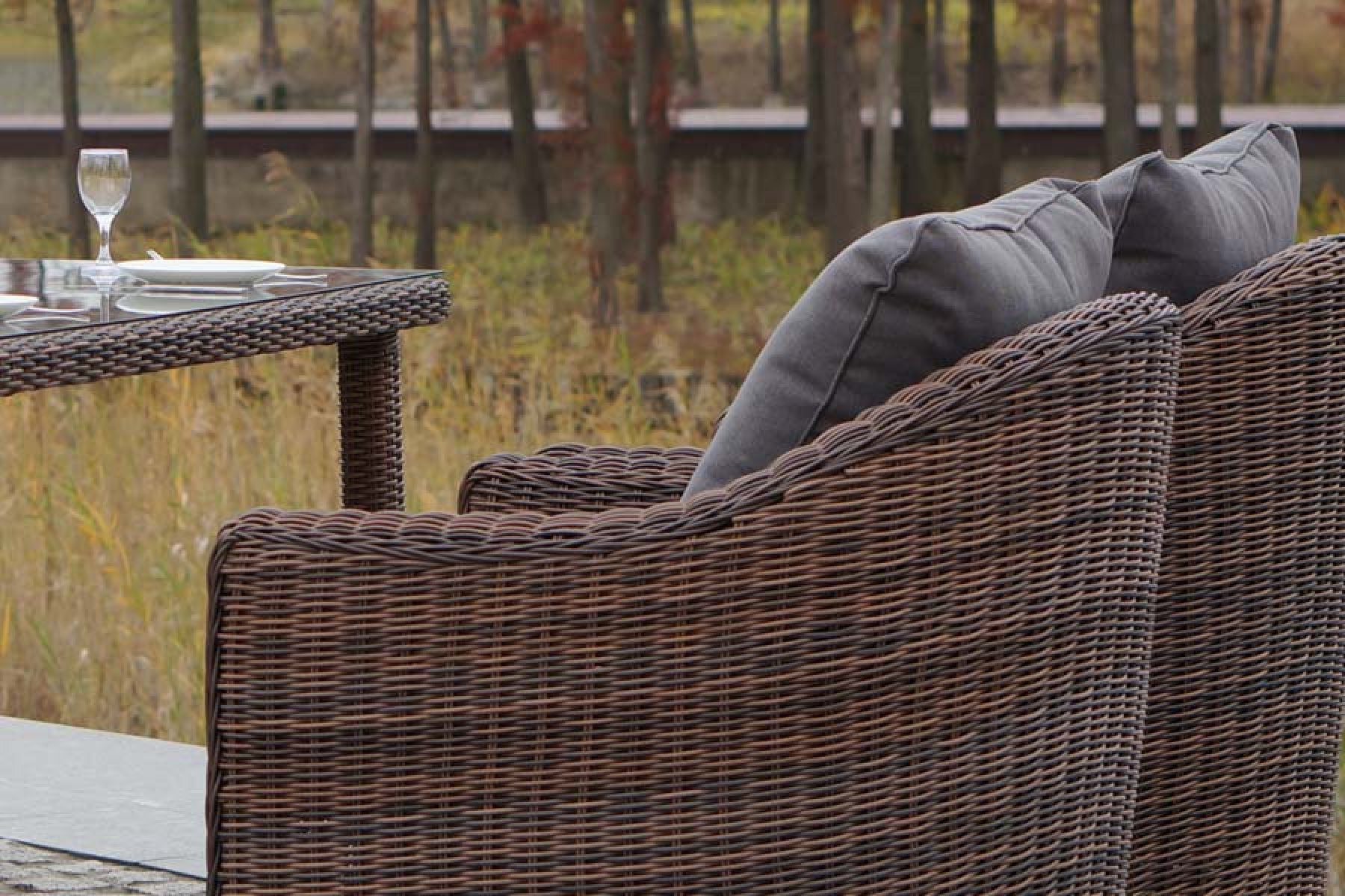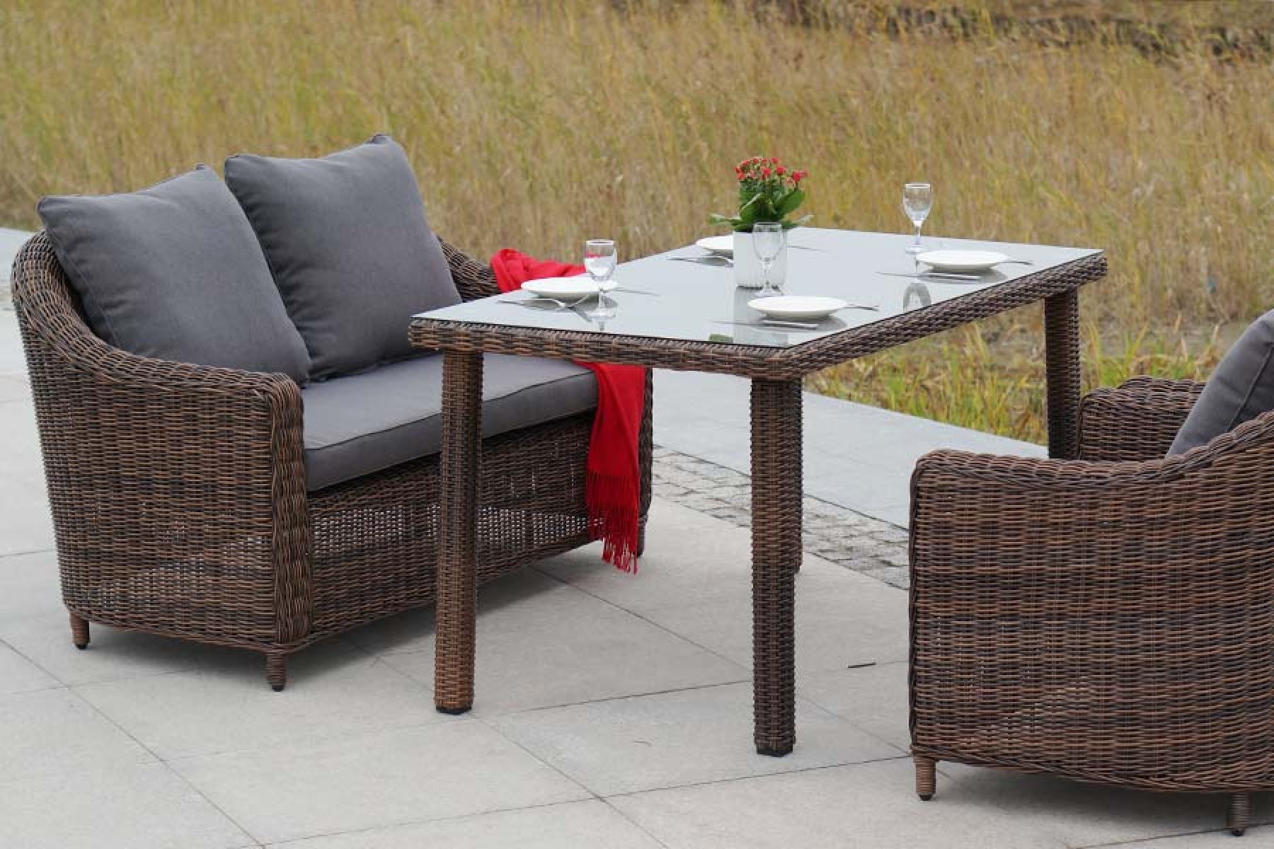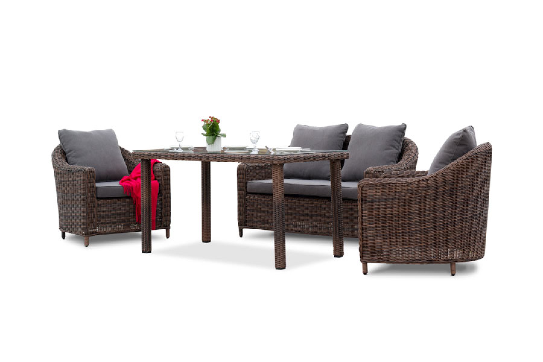 Обеденная группа из искусственного ротанга: 1 двухместный диван, 2 кресла и обеденный стол со стеклянной столешницей. Алюминиевый каркас, круглый искусственный ротанг, ручное плетение. Диван и кресла оснащены подушками со съемными чехлами. "Кон Панна", кресло, коричневоe 2шт. 780Х800Х800, "Кон Панна", диван двухместный, коричневый 1шт. 1 370Х800Х800, "Макиато" стол, круглое плетение, коричневый 1шт. 1 400Х800Х750,