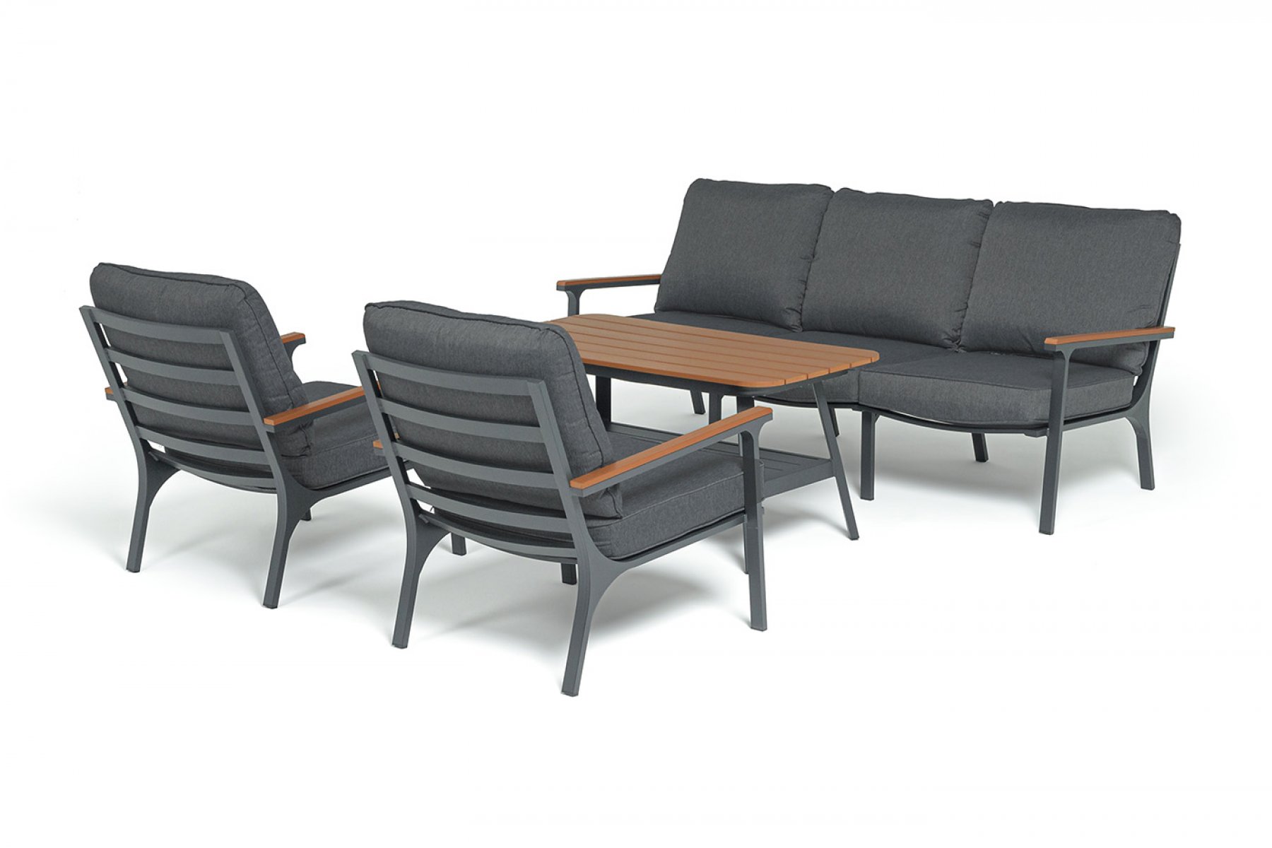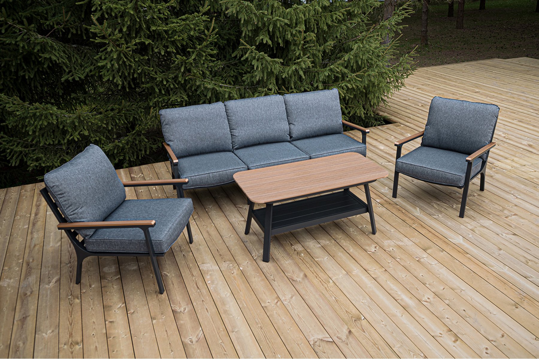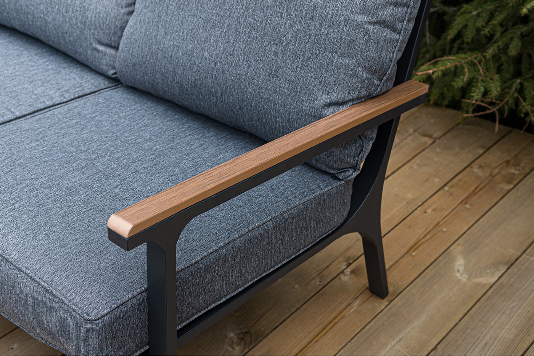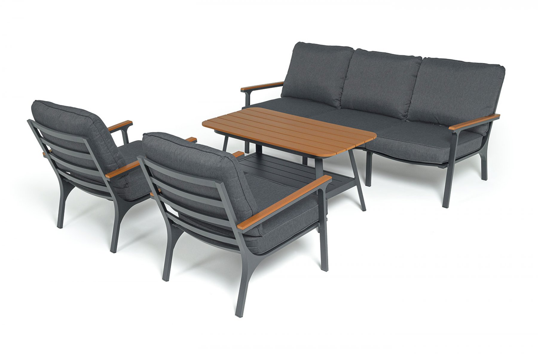 Каркас мебели выполнен из прочного алюминия темно-серого цвета. На подлокотниках дивана и двух кресел установлен облицовочный материал из древесно полимерного композита (ДПК) цвет «дерево». Крепление к каркасу осуществляется на болтах с пластиковыми заглушками темно-серого ц