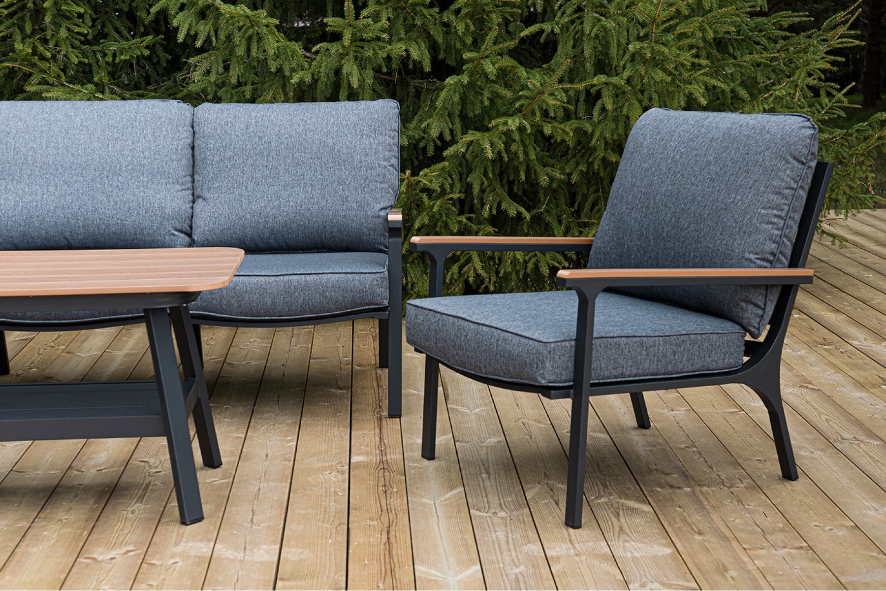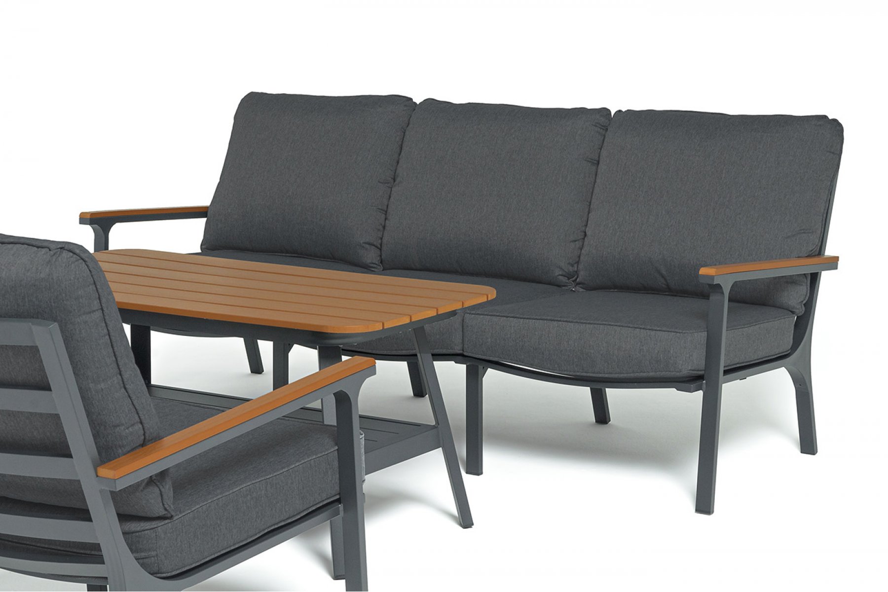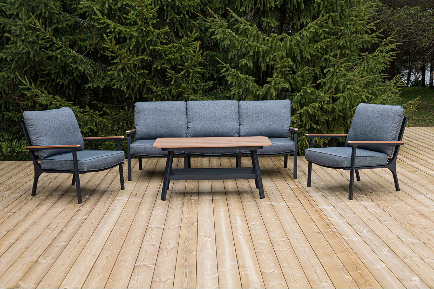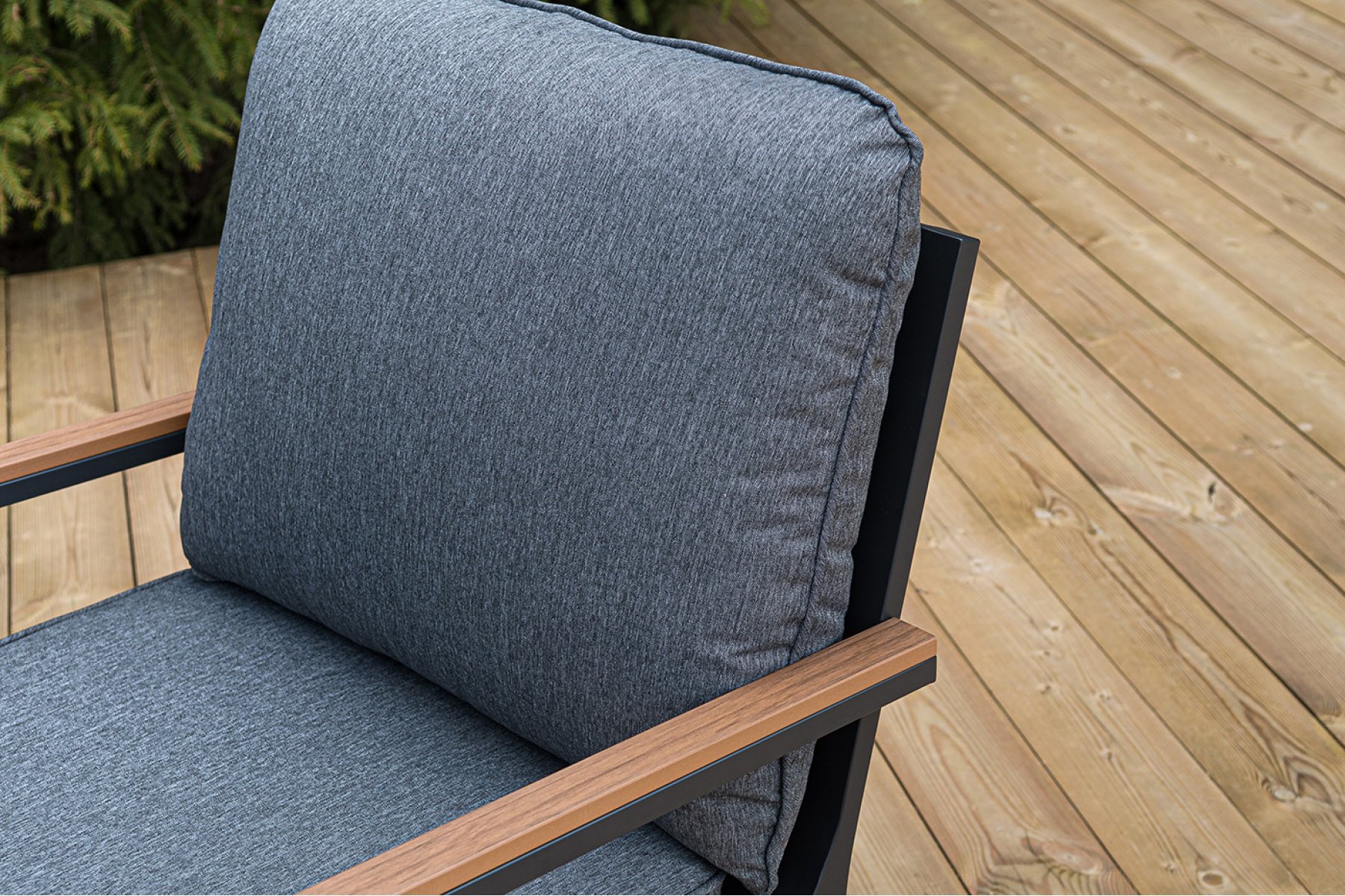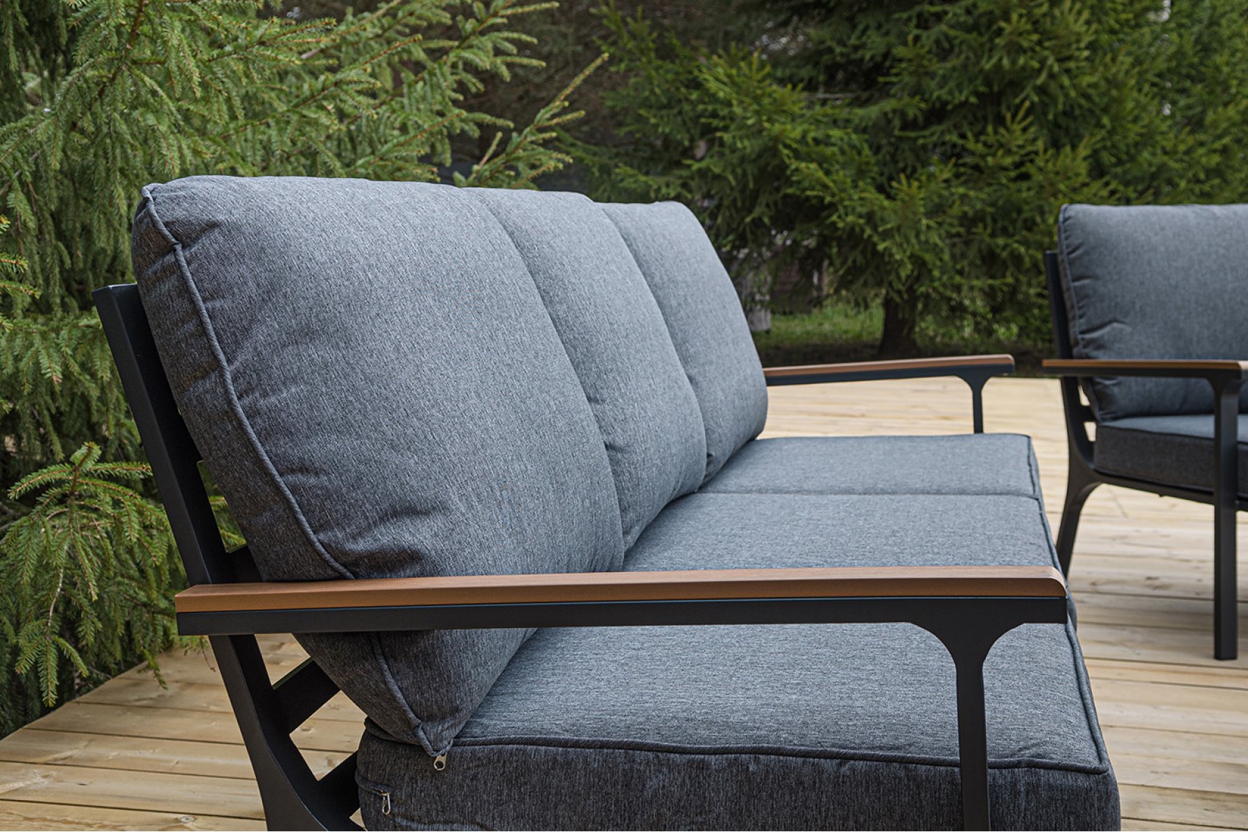 Каркас мебели выполнен из прочного алюминия темно-серого цвета. На подлокотниках дивана и двух кресел установлен облицовочный материал из древесно полимерного композита (ДПК) цвет «дерево». Крепление к каркасу осуществляется на болтах с пластиковыми заглушками темно-серого ц