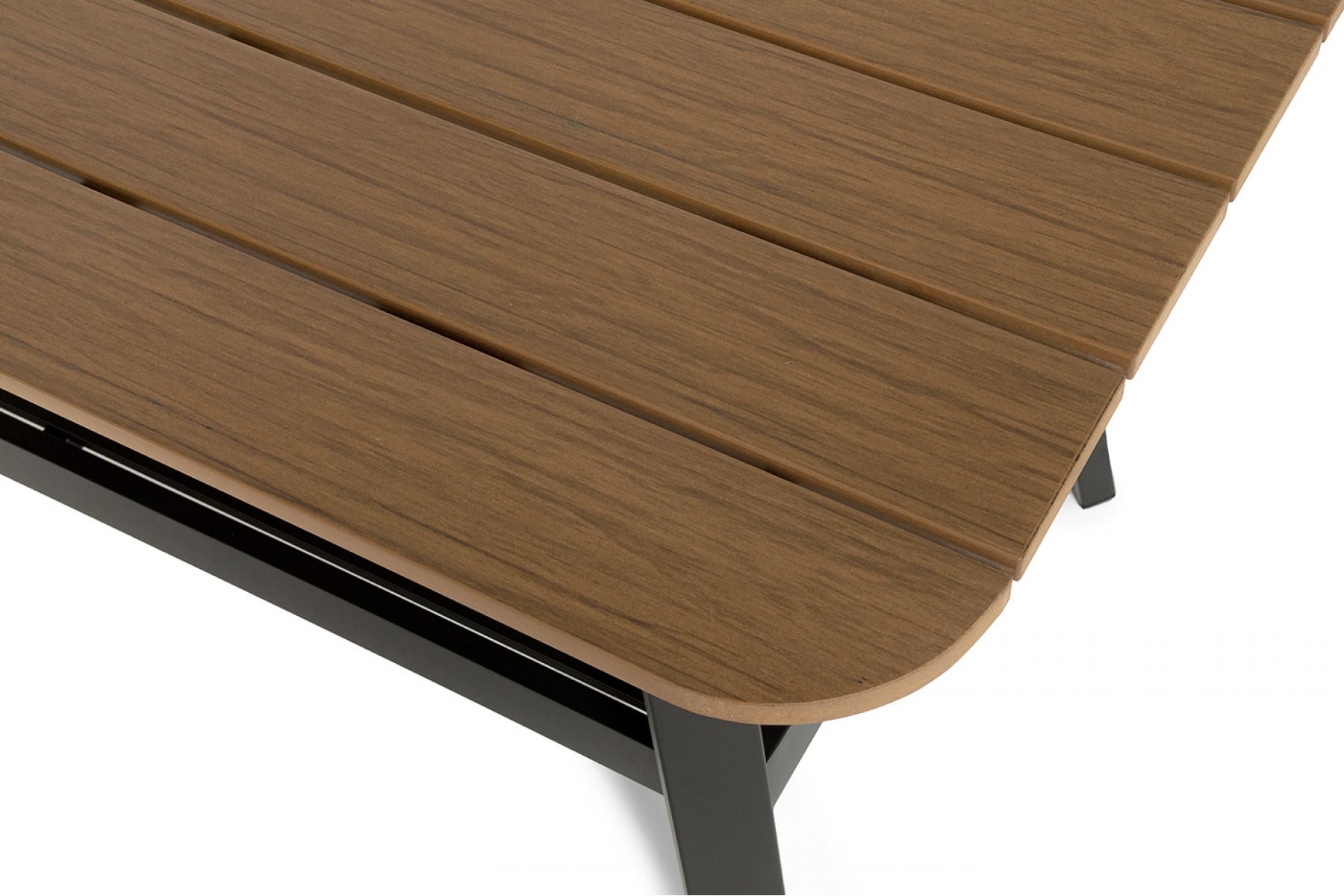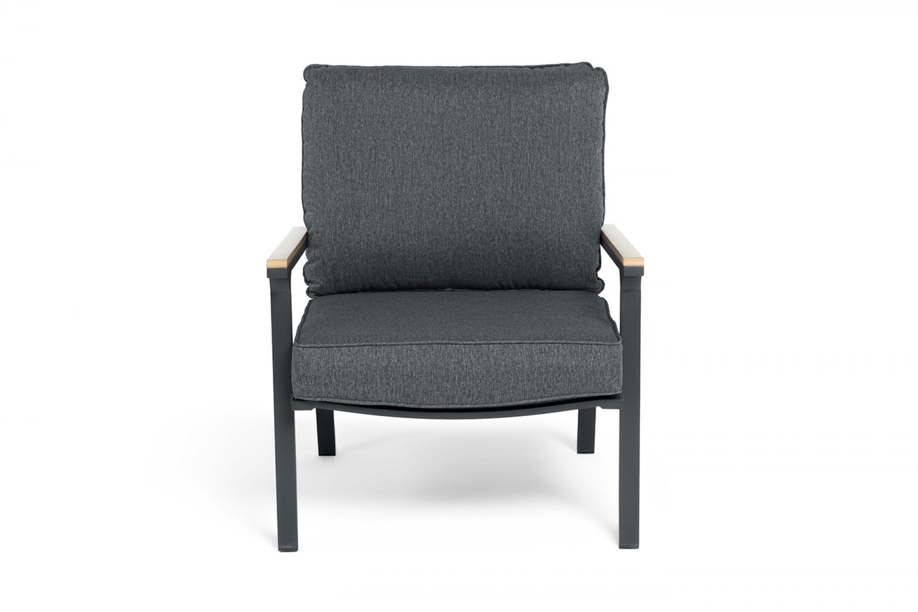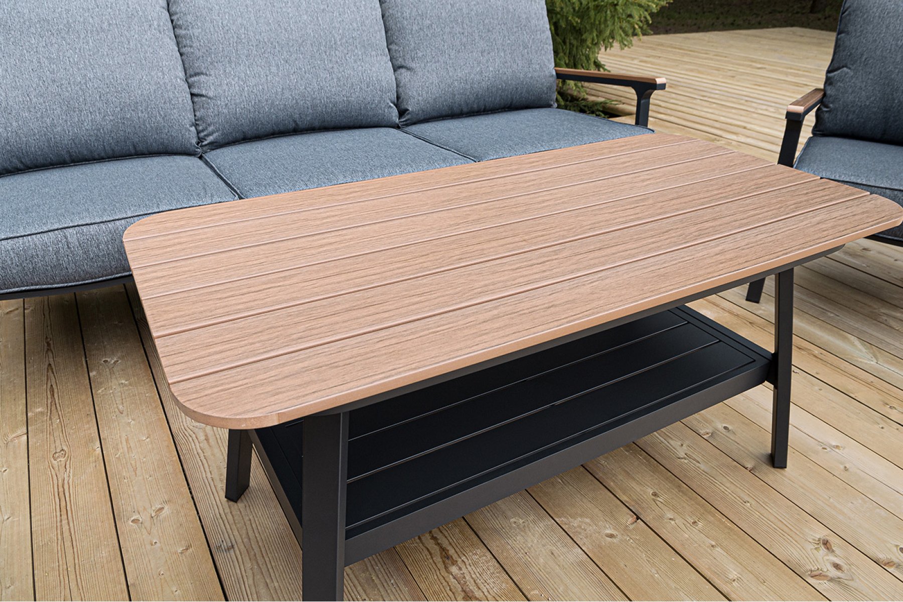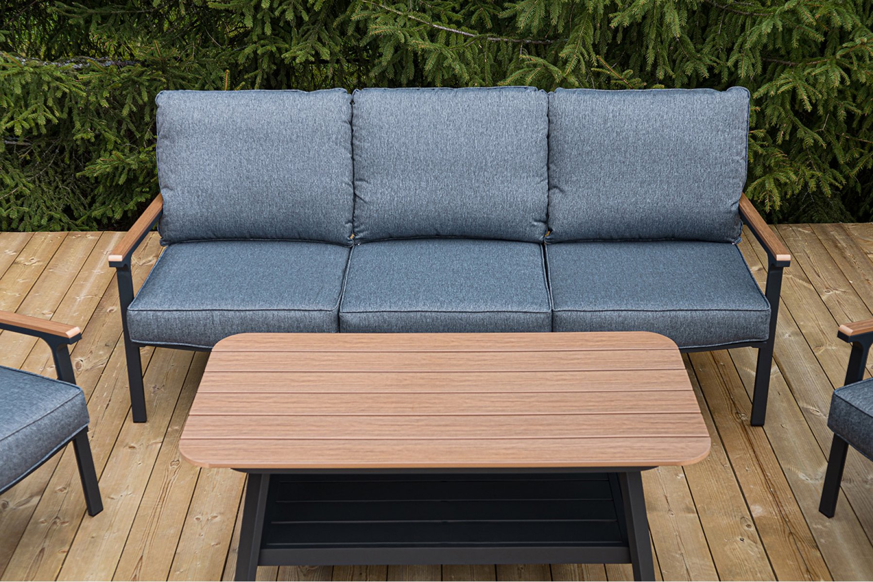Каркас мебели выполнен из прочного алюминия темно-серого цвета. На подлокотниках дивана и двух кресел установлен облицовочный материал из древесно полимерного композита (ДПК) цвет «дерево». Крепление к каркасу осуществляется на болтах с пластиковыми заглушками темно-серого ц