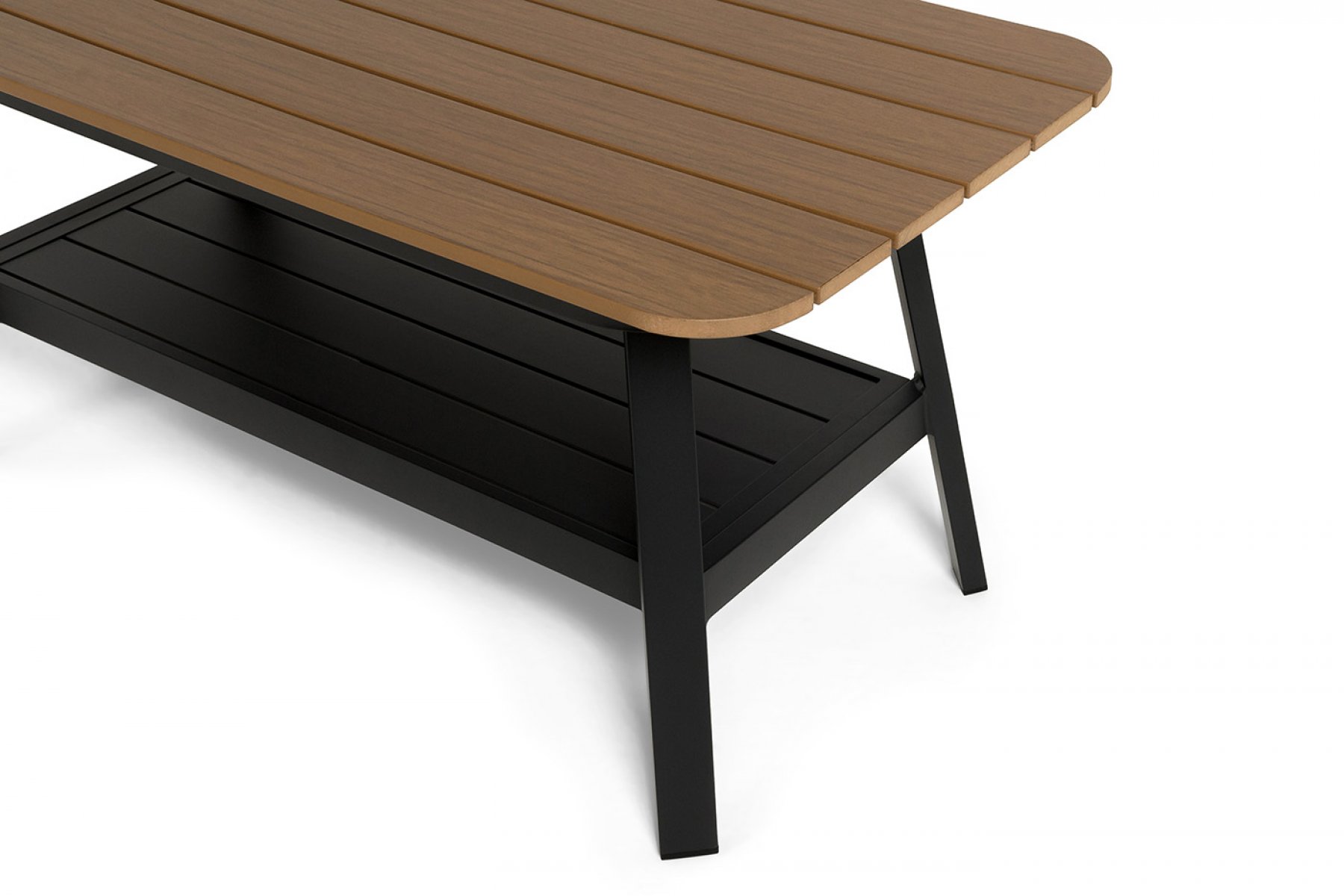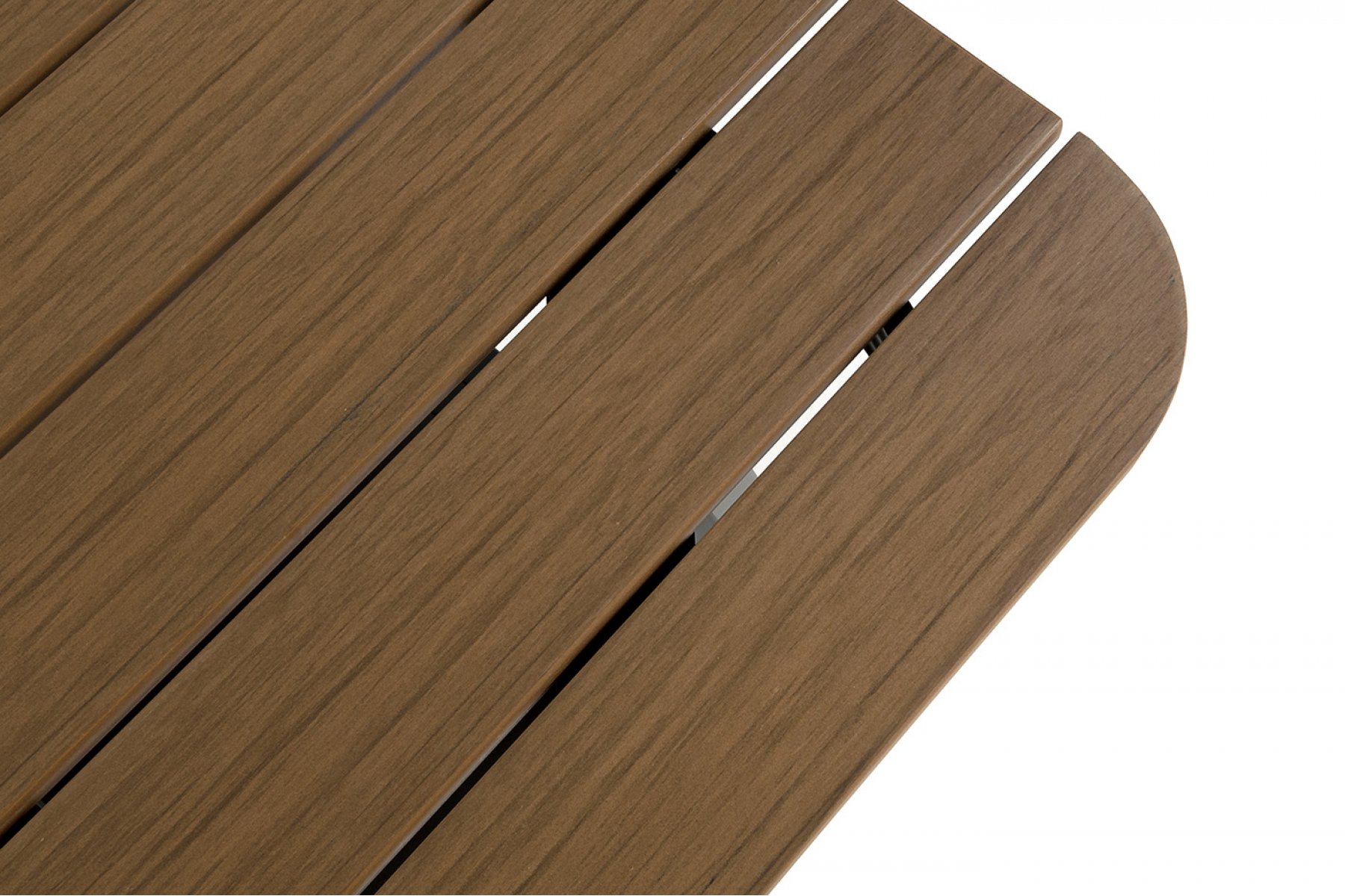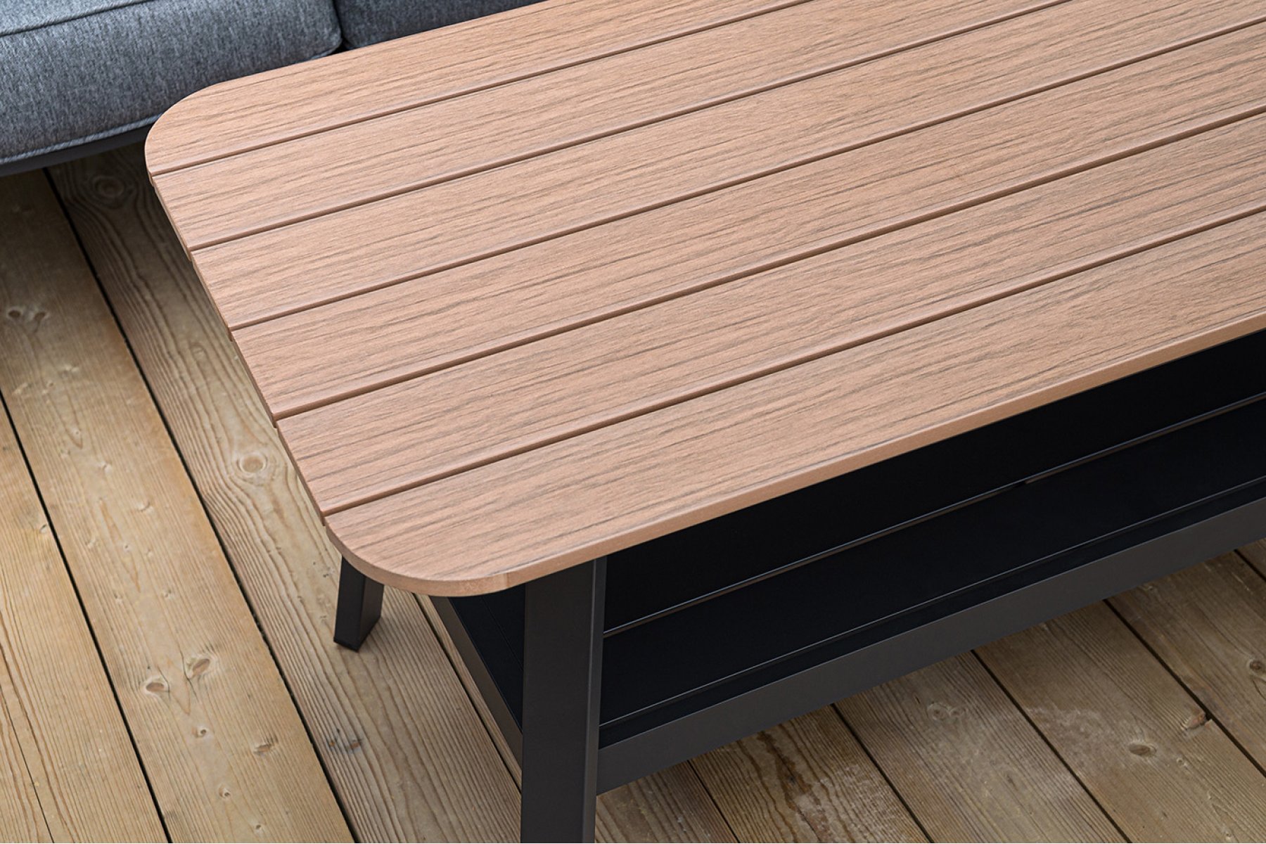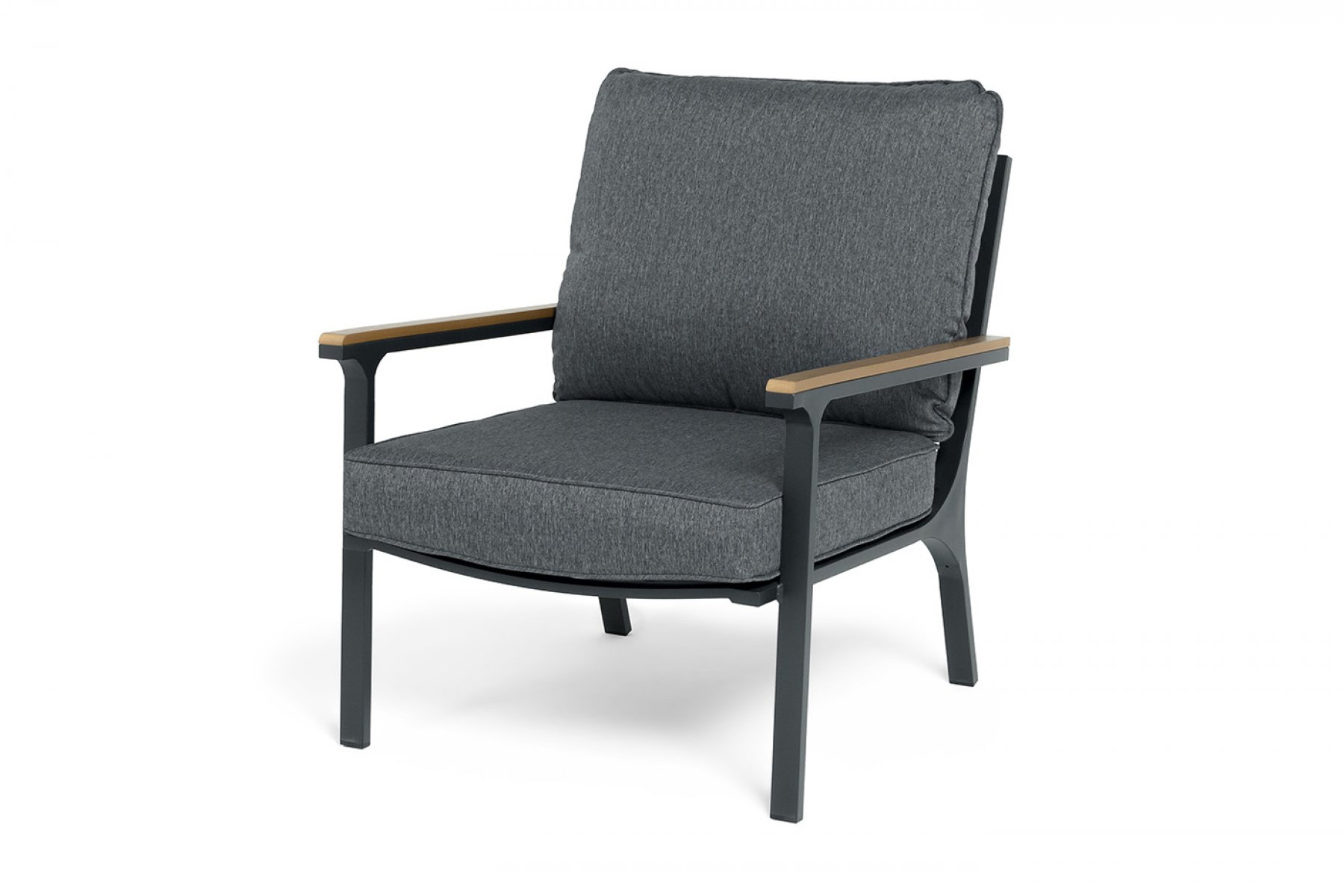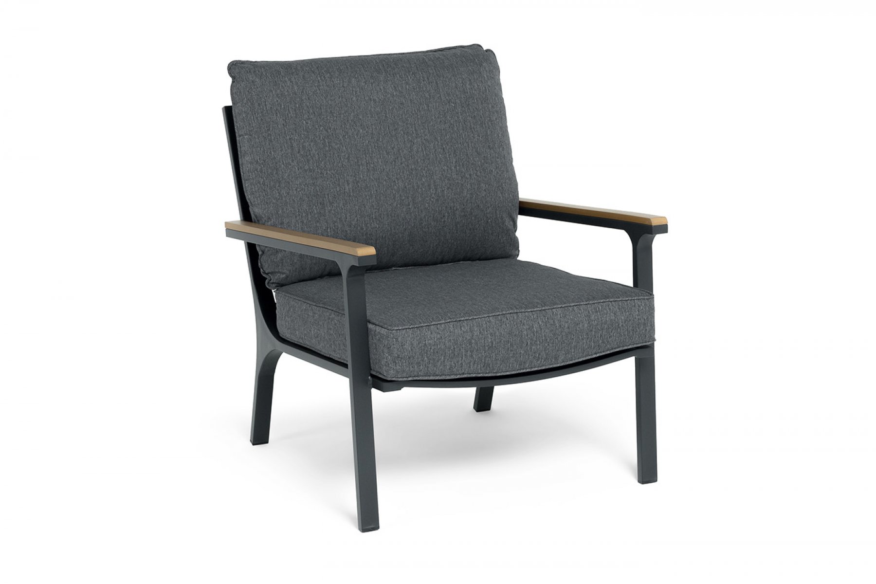 Каркас мебели выполнен из прочного алюминия темно-серого цвета. На подлокотниках дивана и двух кресел установлен облицовочный материал из древесно полимерного композита (ДПК) цвет «дерево». Крепление к каркасу осуществляется на болтах с пластиковыми заглушками темно-серого ц
