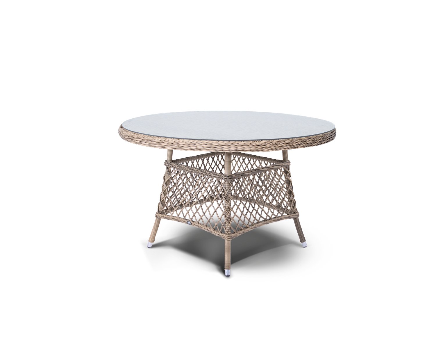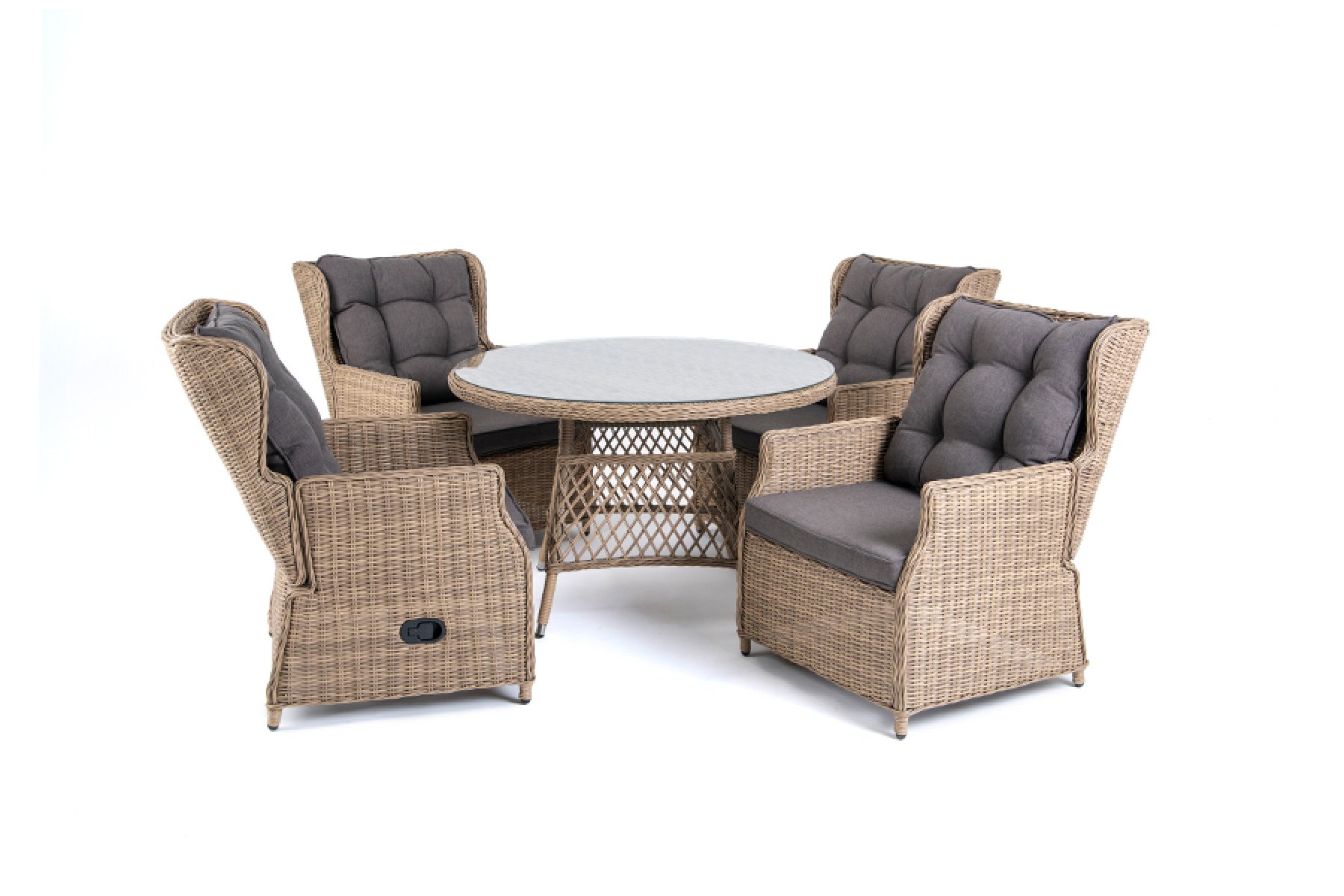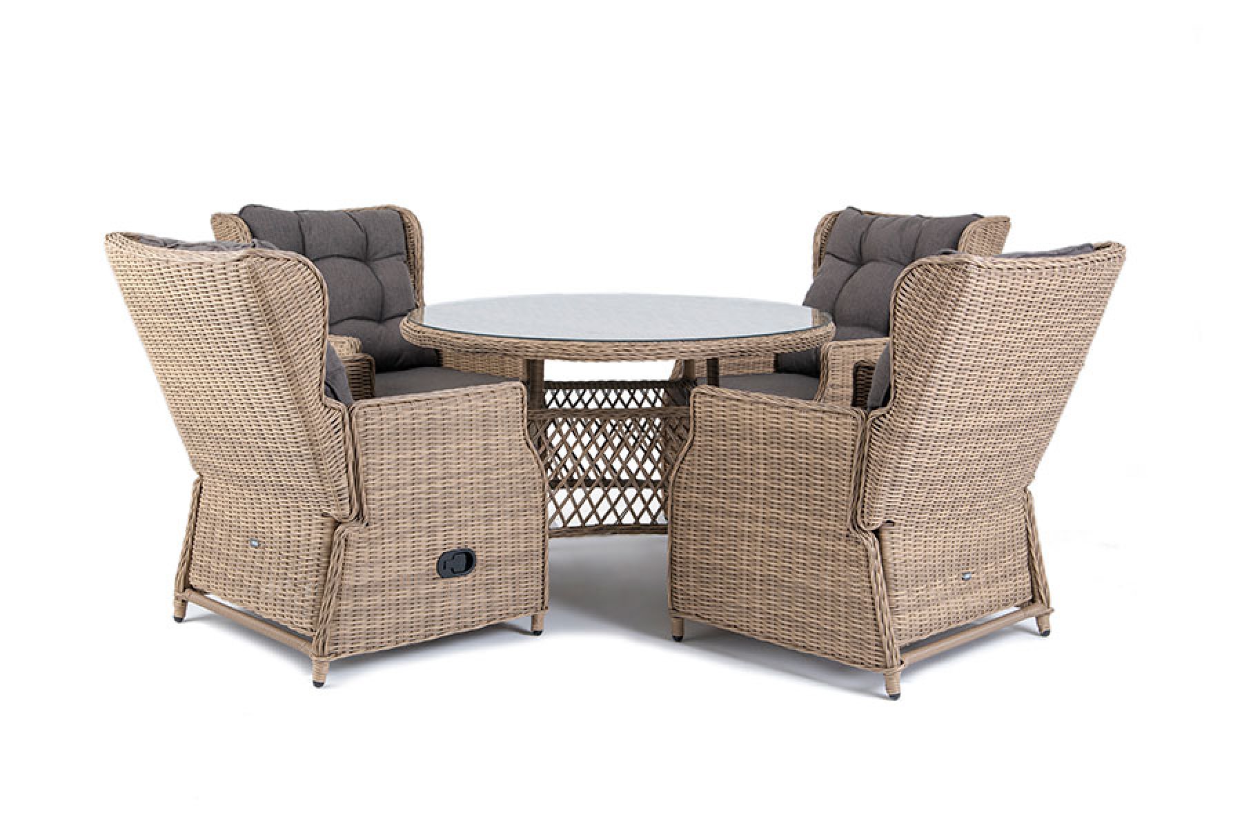 Обеденная группа из искусственного ротанга: 4 раскладывающихся кресла и обеденный стол со стеклянной столешницей. Алюминиевый каркас, круглый искусственный ротанг соломенного цвета, ручное плетение. Кресла оснащены подушками со съемными чехлами. "Форио" Кресло плетеное 4шт. 750Х870Х100, "Эспрессо", стол 1шт. 1 180Х1 180Х750,