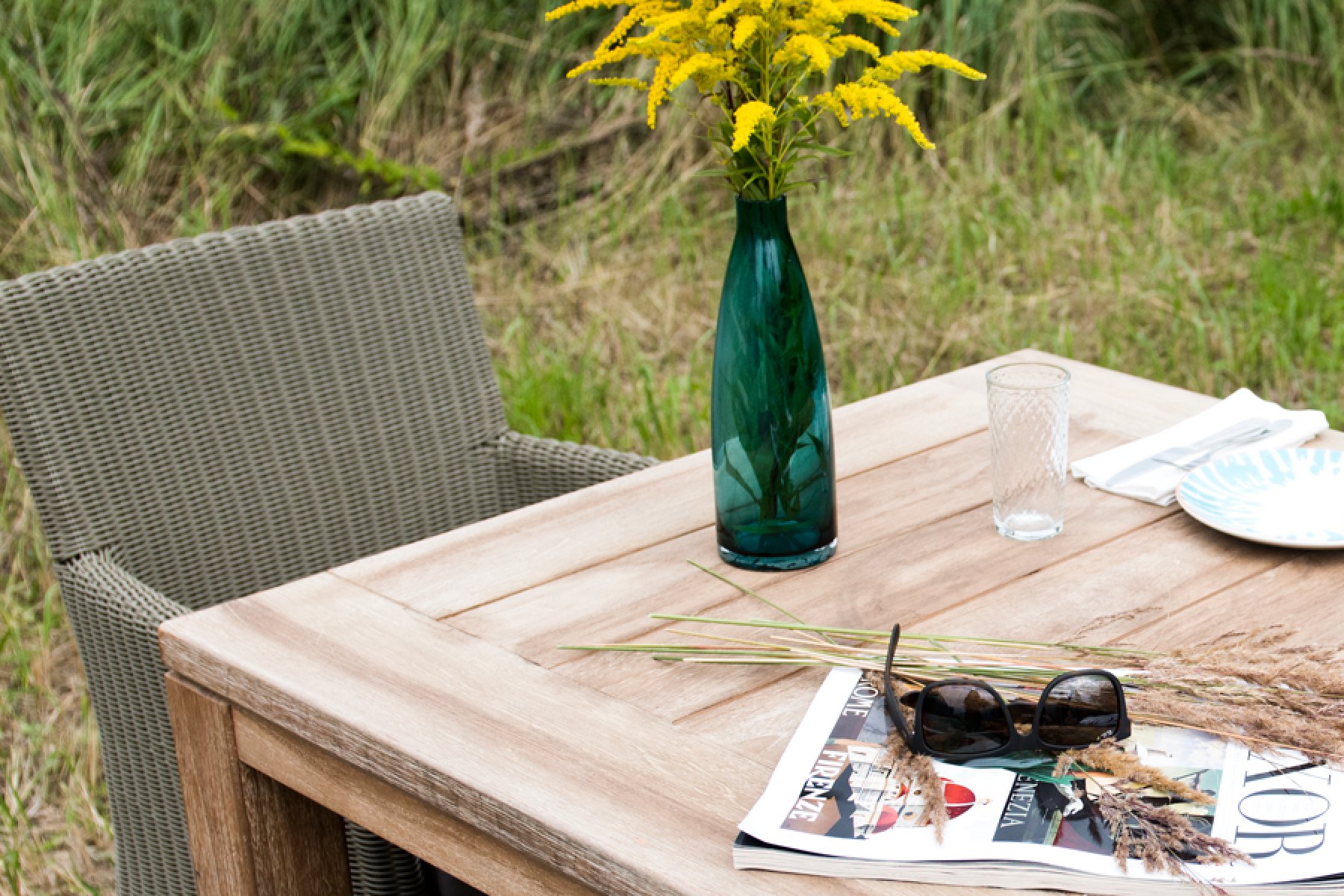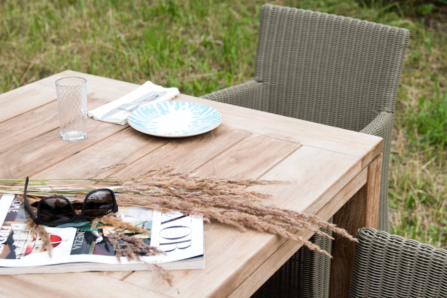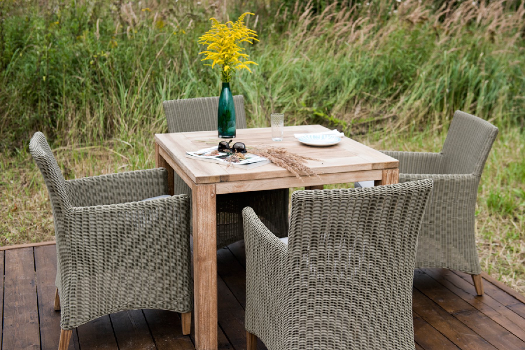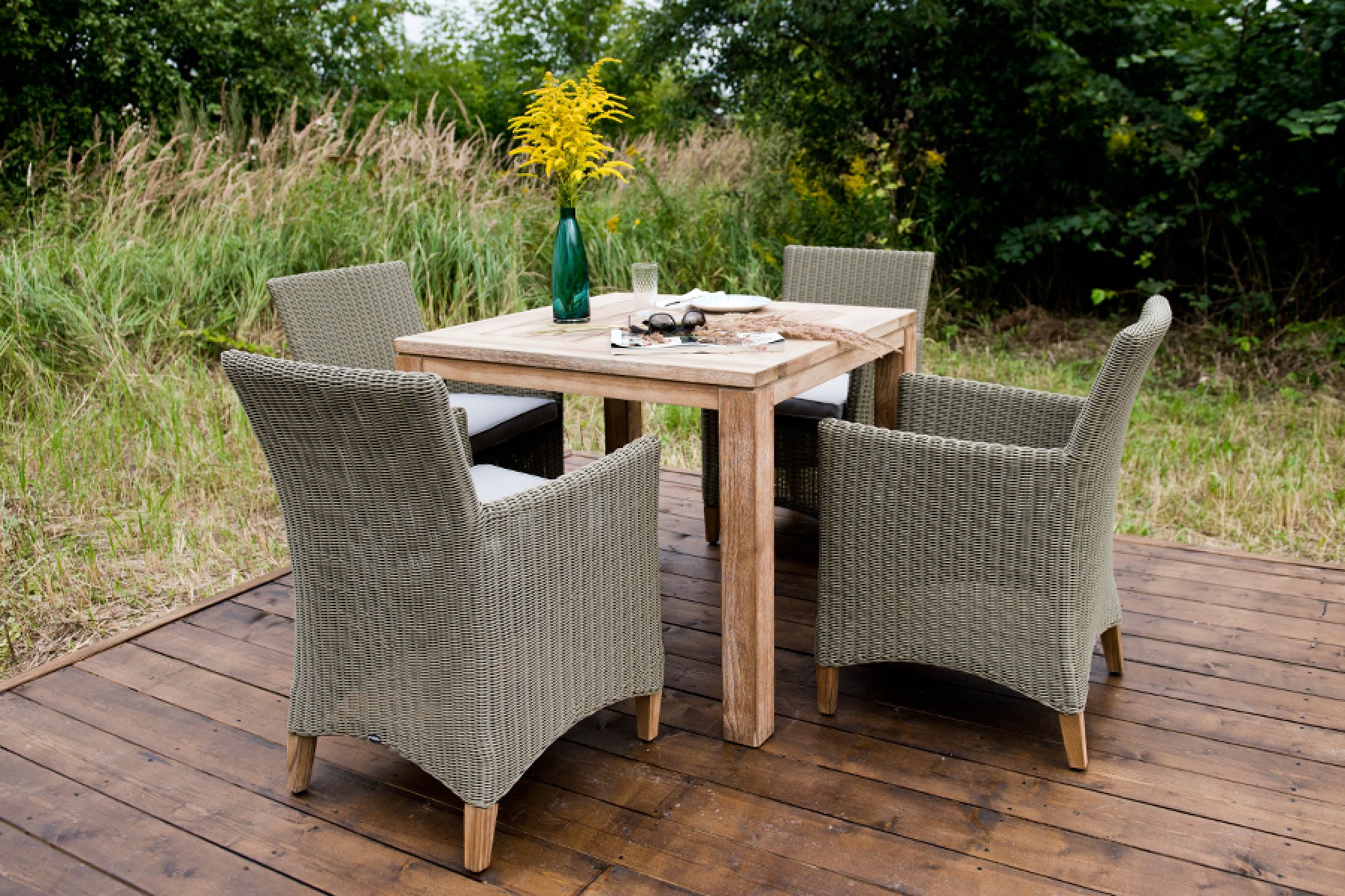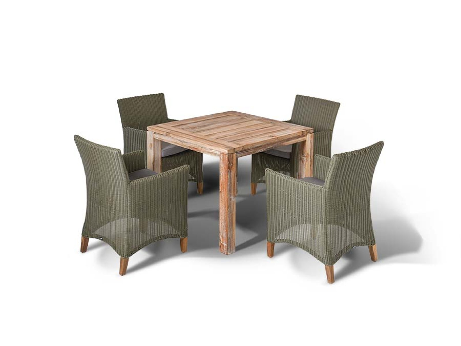 Обеденная группа на 4 персоны. Стол из тикового дерева. Все стулья с подлокотниками и подушками, алюминиевый каркас, искусственный ротанг. "Виченца" стол 1шт. 900Х900Х770, "Пестум" кресло светло-серое с серой подушкой 4шт. 610Х570Х850,