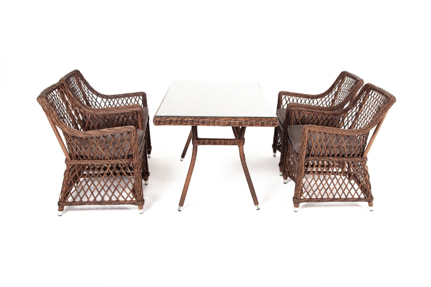 Комплект гармонично сочетает в себе алюминий, из которого выполнен каркас и декор из искусственного ротанга насыщенного шоколадного оттенка. Прекрасным дополнением мебели стали мягкие подушки из всепогодной ткани со съёмными чехлами.