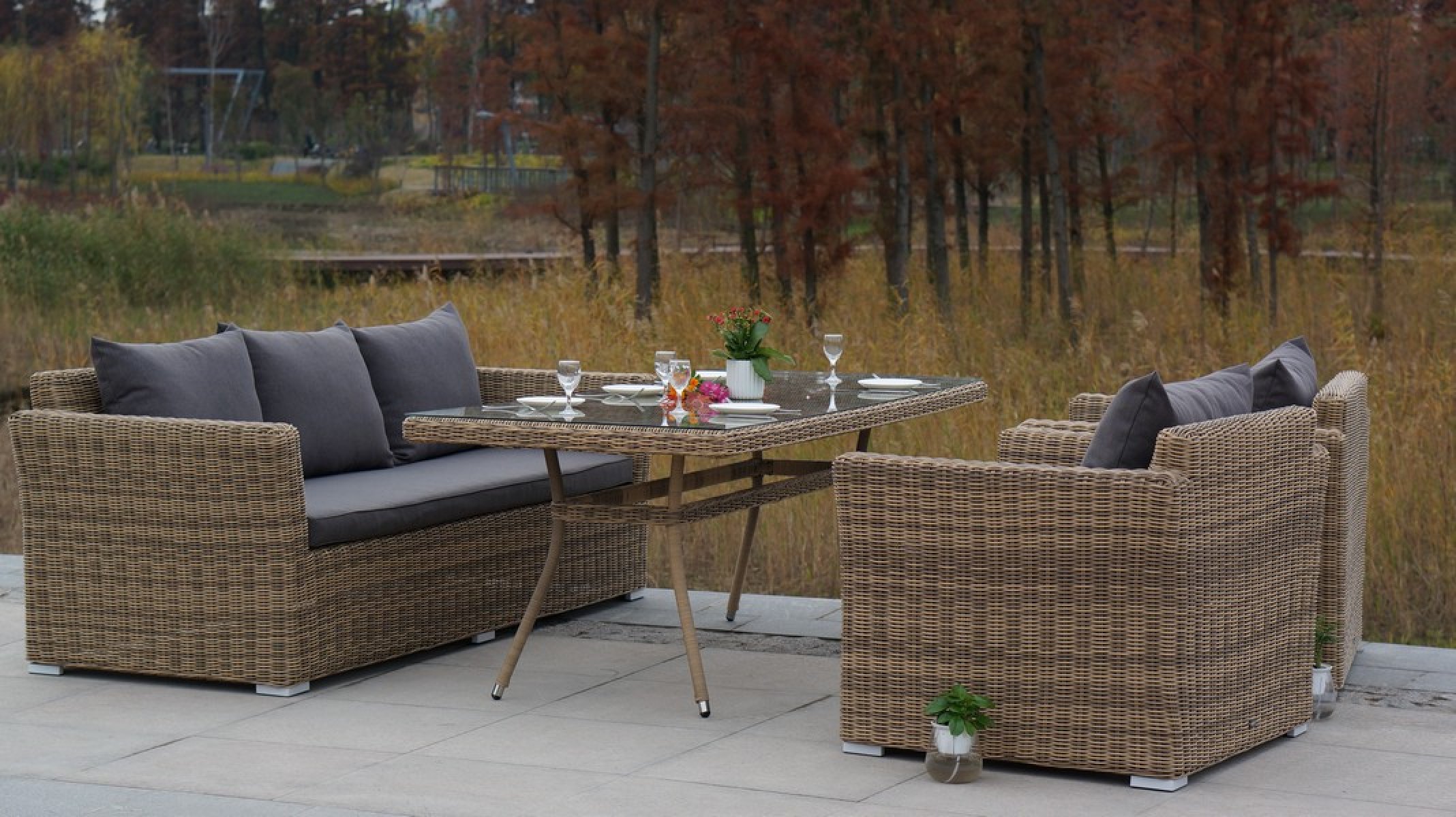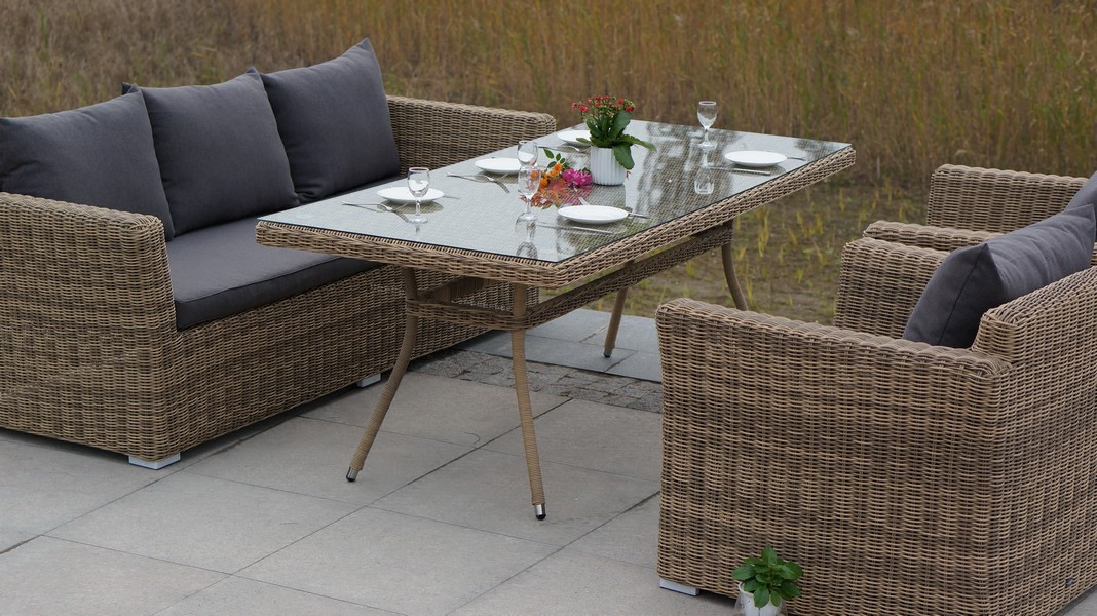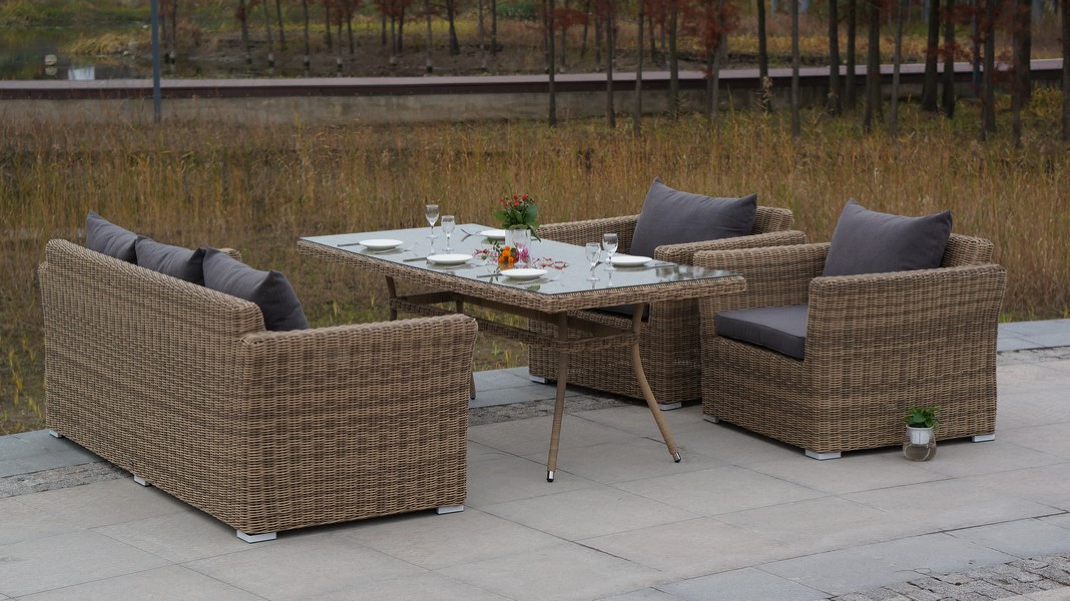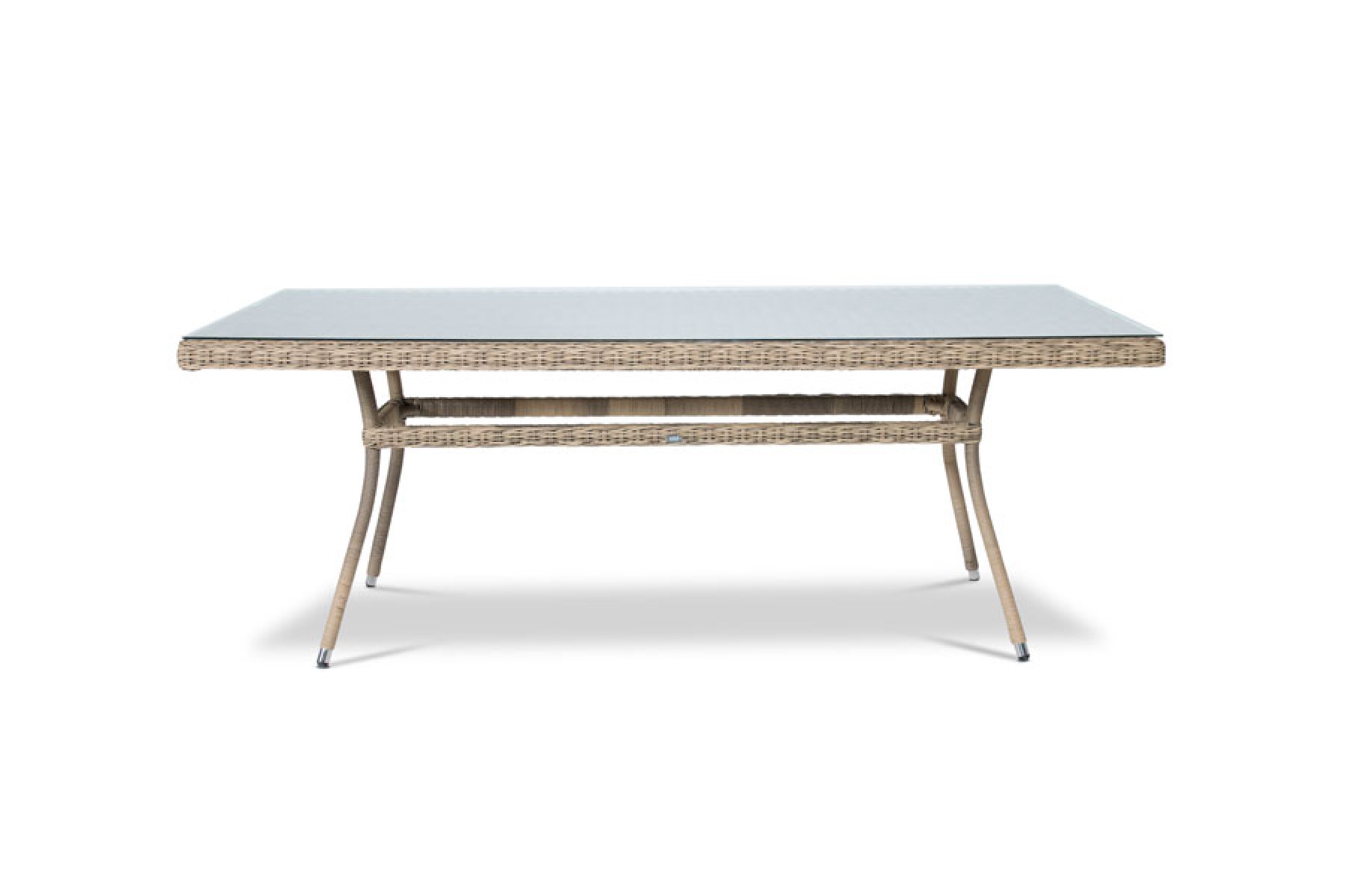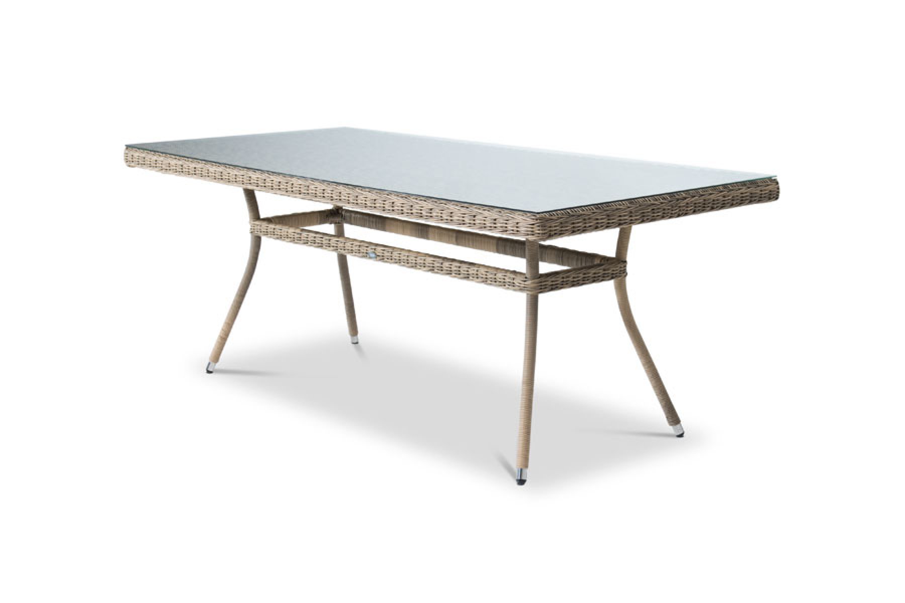 "Латте", стол со стеклянной столешницей толщиной 5мм, алюминиевый каркас, искусственный ротанг, ручное круглое плетение