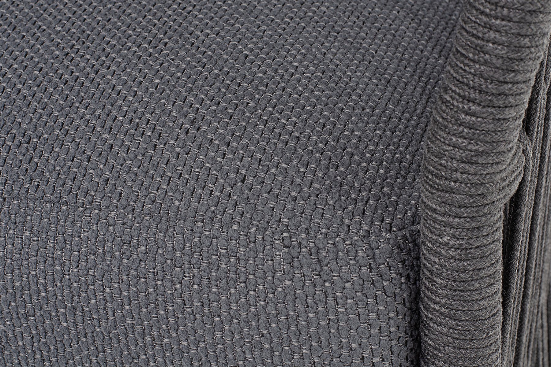 Диван имеет алюминиевый каркас, окрашенный порошковой краской в темно-серый (RAL7024) цвет. Боковины каркаса и спинка вручную оплетены роупом - эластичными синтетическими лентами, изготовленными из высокопрочных полиэфирных волокон. Цвет оплетки в тон каркасу - темно-серый.