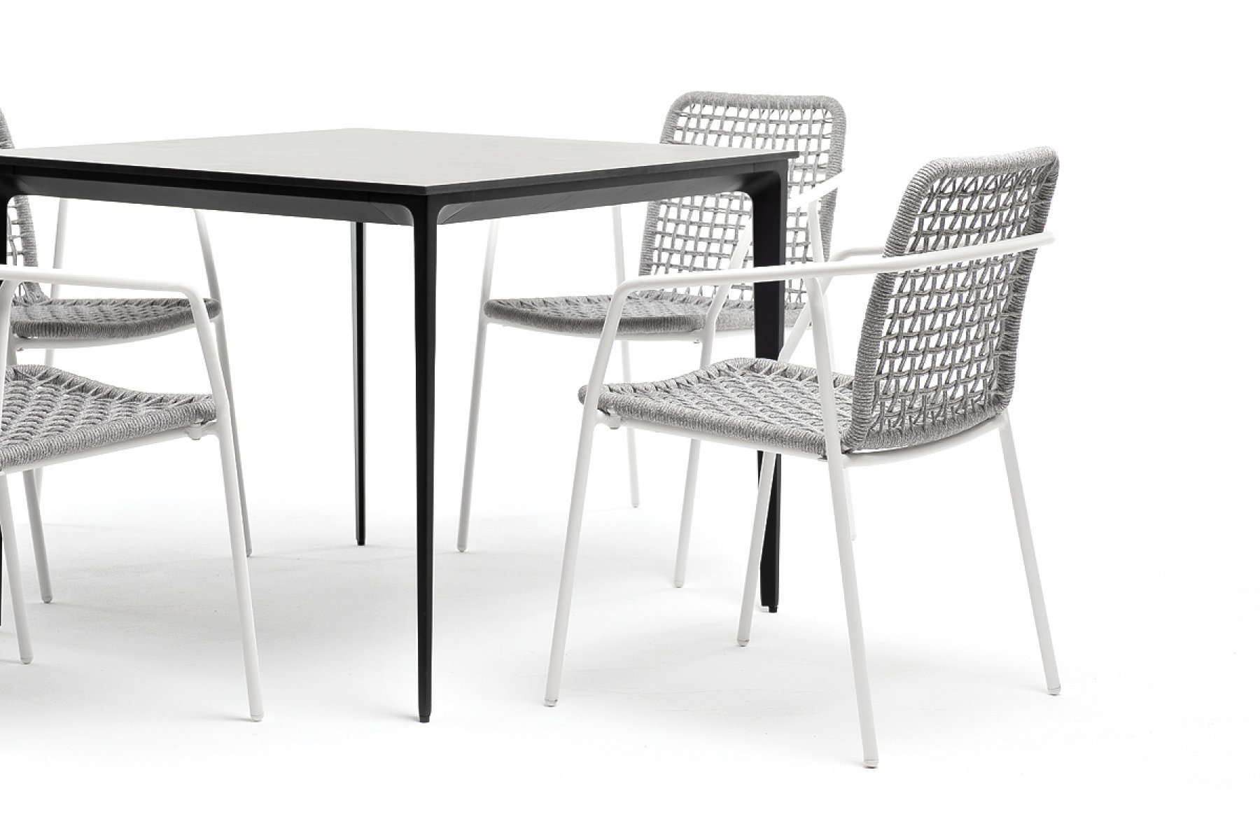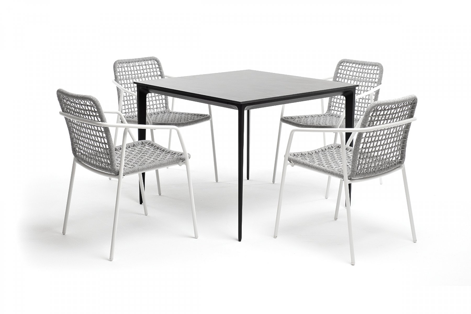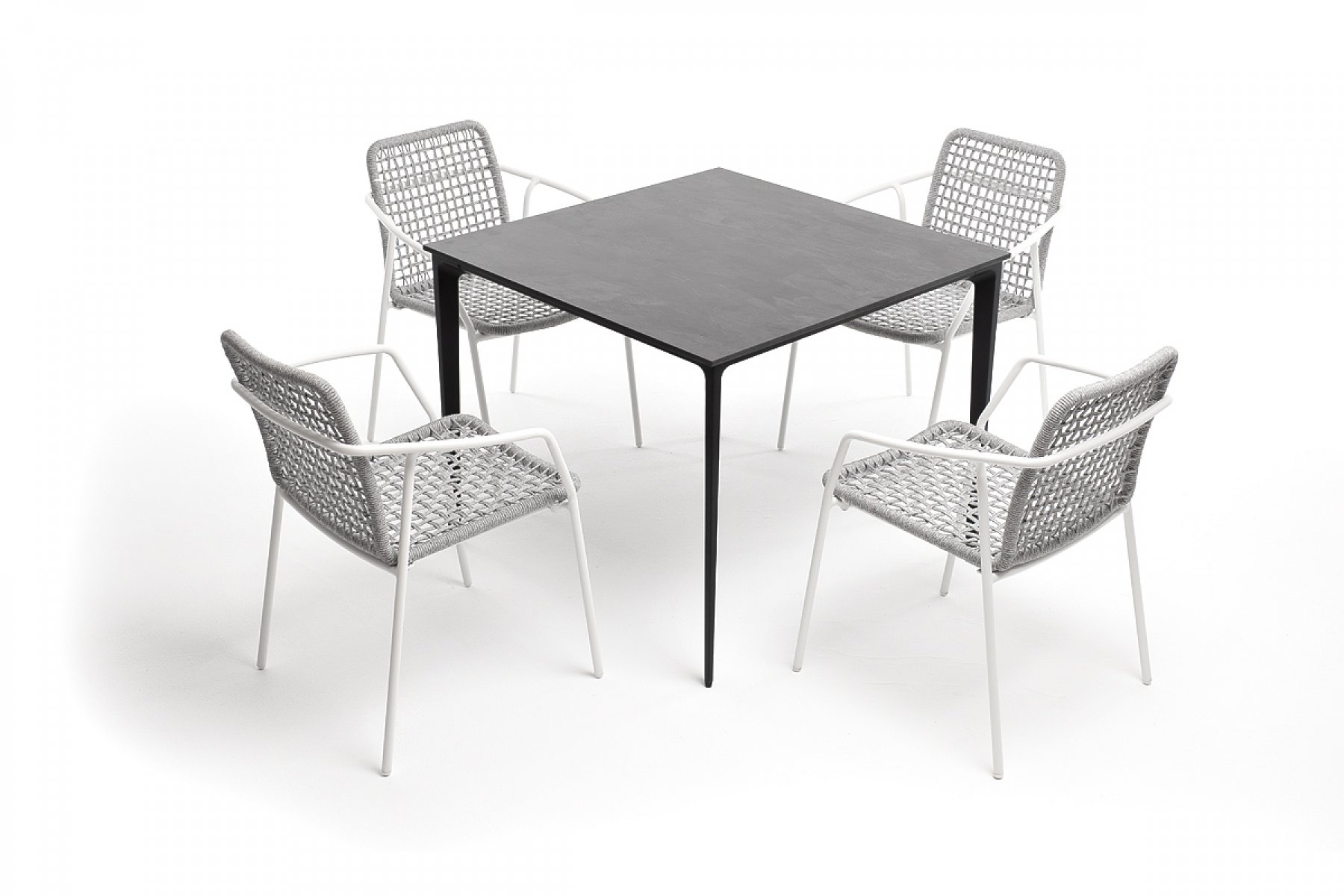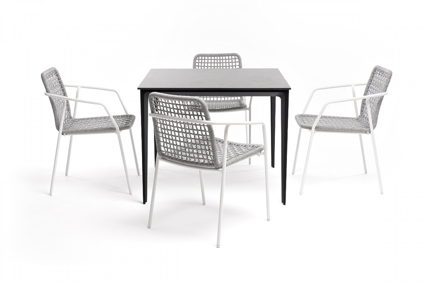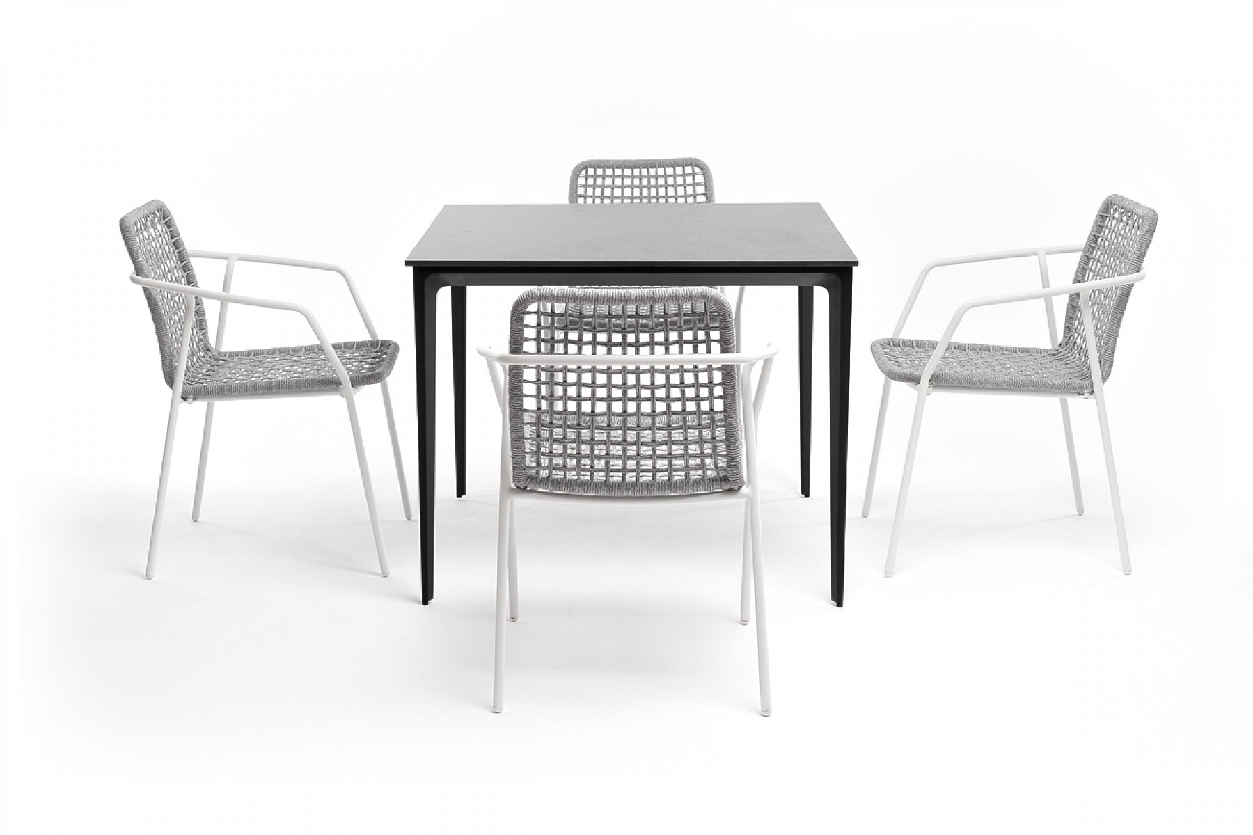- 4 плетеных стула «Тунис» из роупа, размером - 580×600×800 мм, цвет роупа - светло-серый, каркас - белый. "Малага" обеденный стол из HPL 90х90см, цвет "серый гранит", каркас черный 1шт. 900Х900Х750, "Тунис" стул плетеный из роупа, каркас алюминий белый, роуп светло-серый 4шт. 575Х600Х800,
