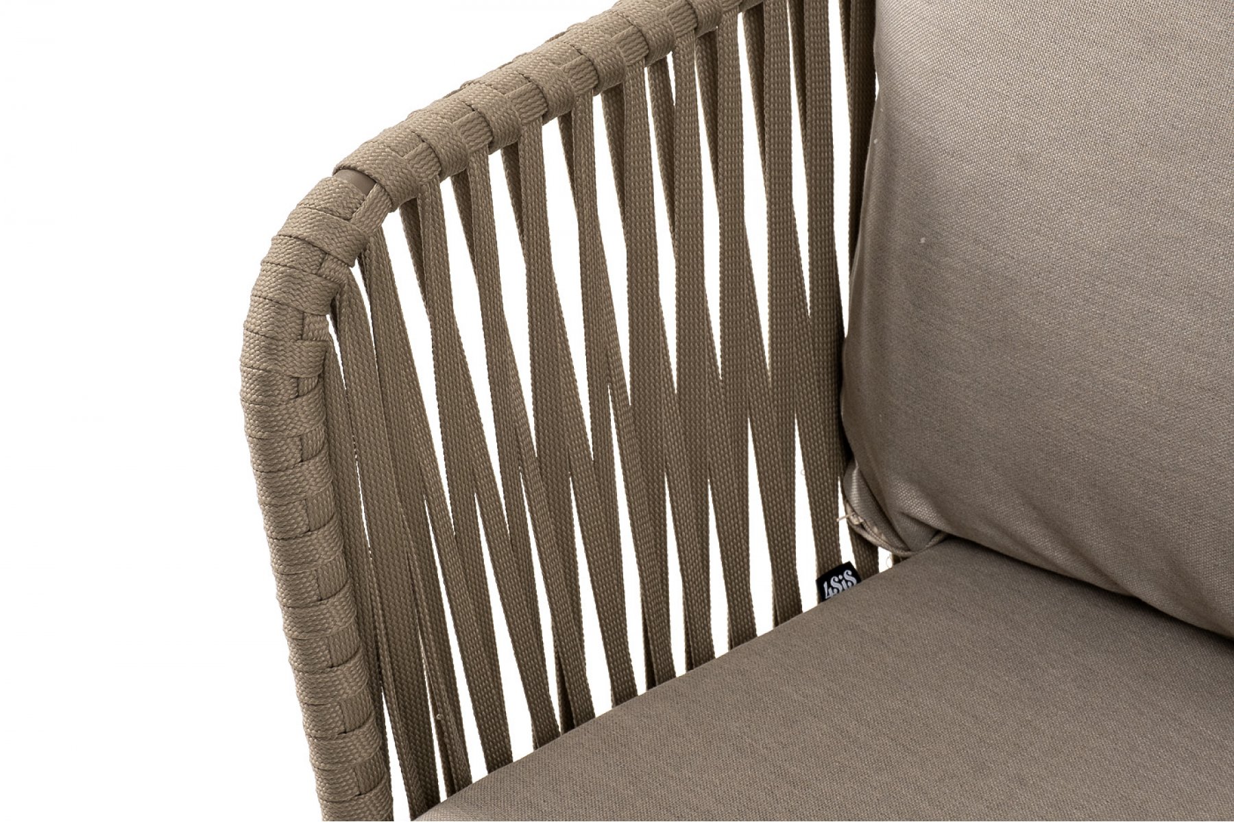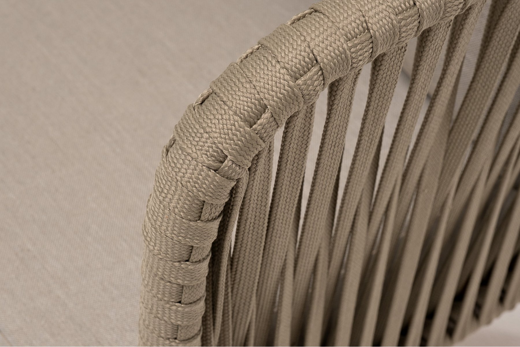 Боковины каркаса и спинка вручную оплетены роупом - эластичными синтетическими лентами, изготовленными из высокопрочных полиэфирных волокон. Цвет оплетки - серо-коричневый. Основание - дуб.