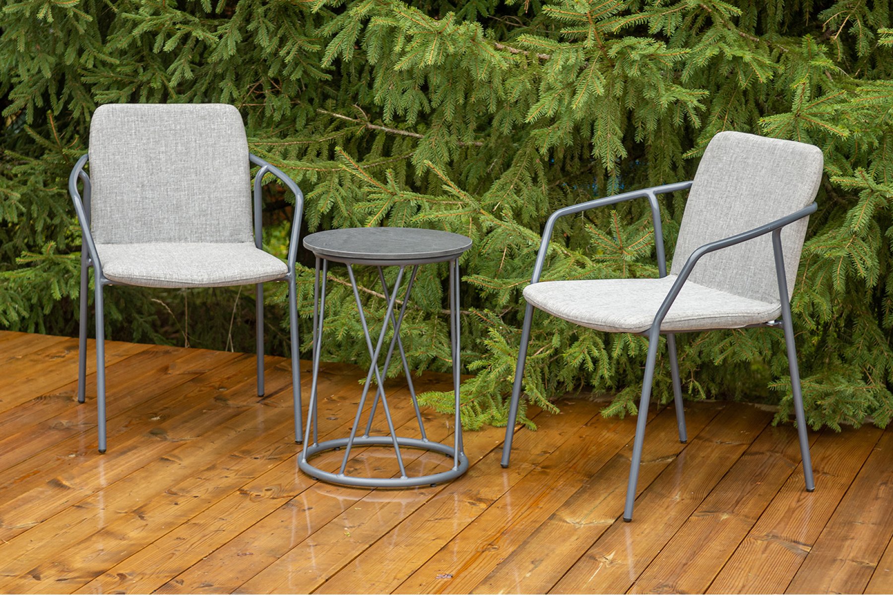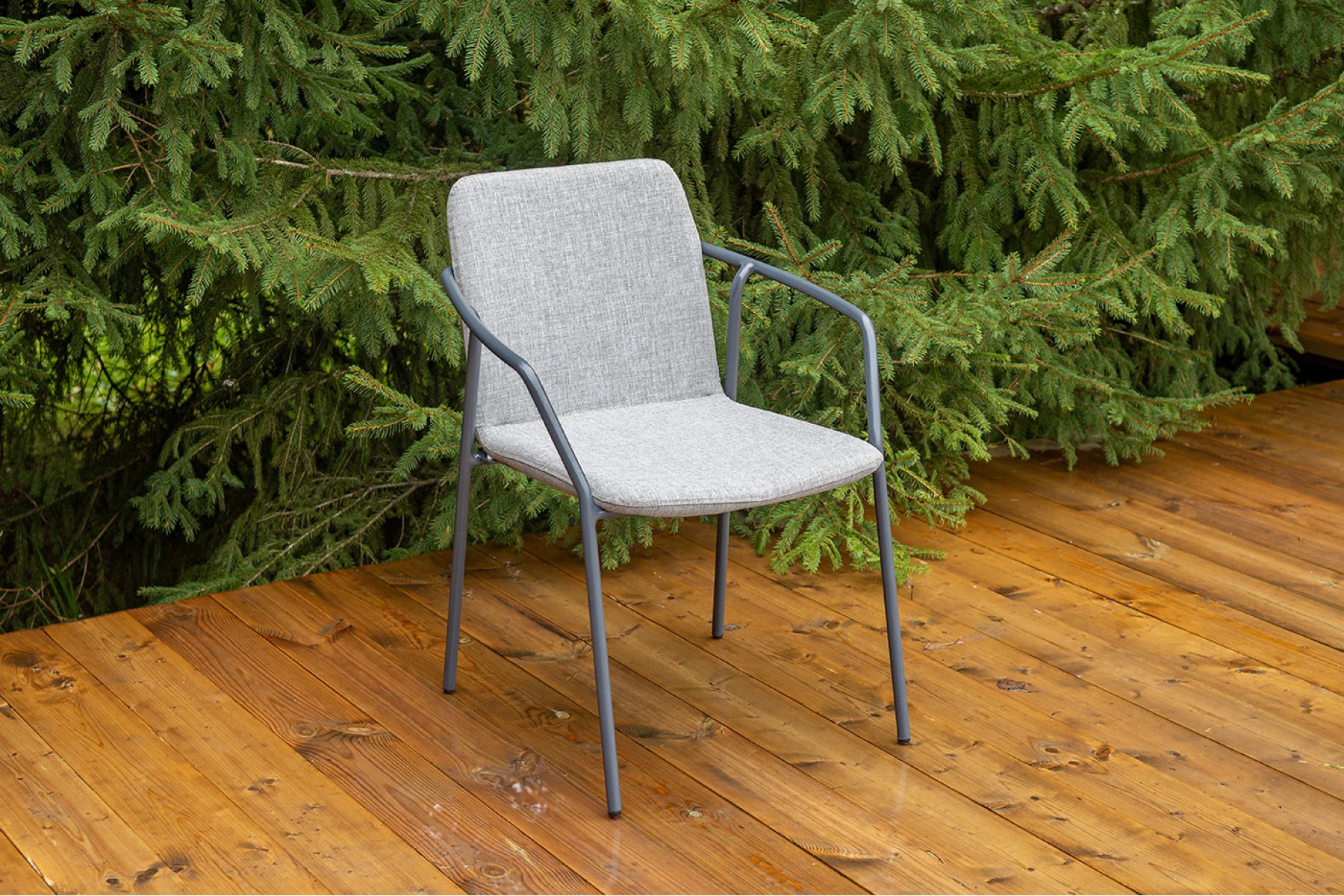 Стул «Марокко» изготовлен из современного материала — текстилена Nanotex. Каркас выполнен из алюминия, окрашенного в темно‑серый цвет (RAL 7024), что обеспечивает прочность и лёгкость конструкции. Размеры стула — 575×600×800 мм. Модель отличается износостойкостью, устойчивостью к влаге и ультрафиолету, проста в уходе и подходит для использования на террасе, веранде, в кафе или загородном доме.