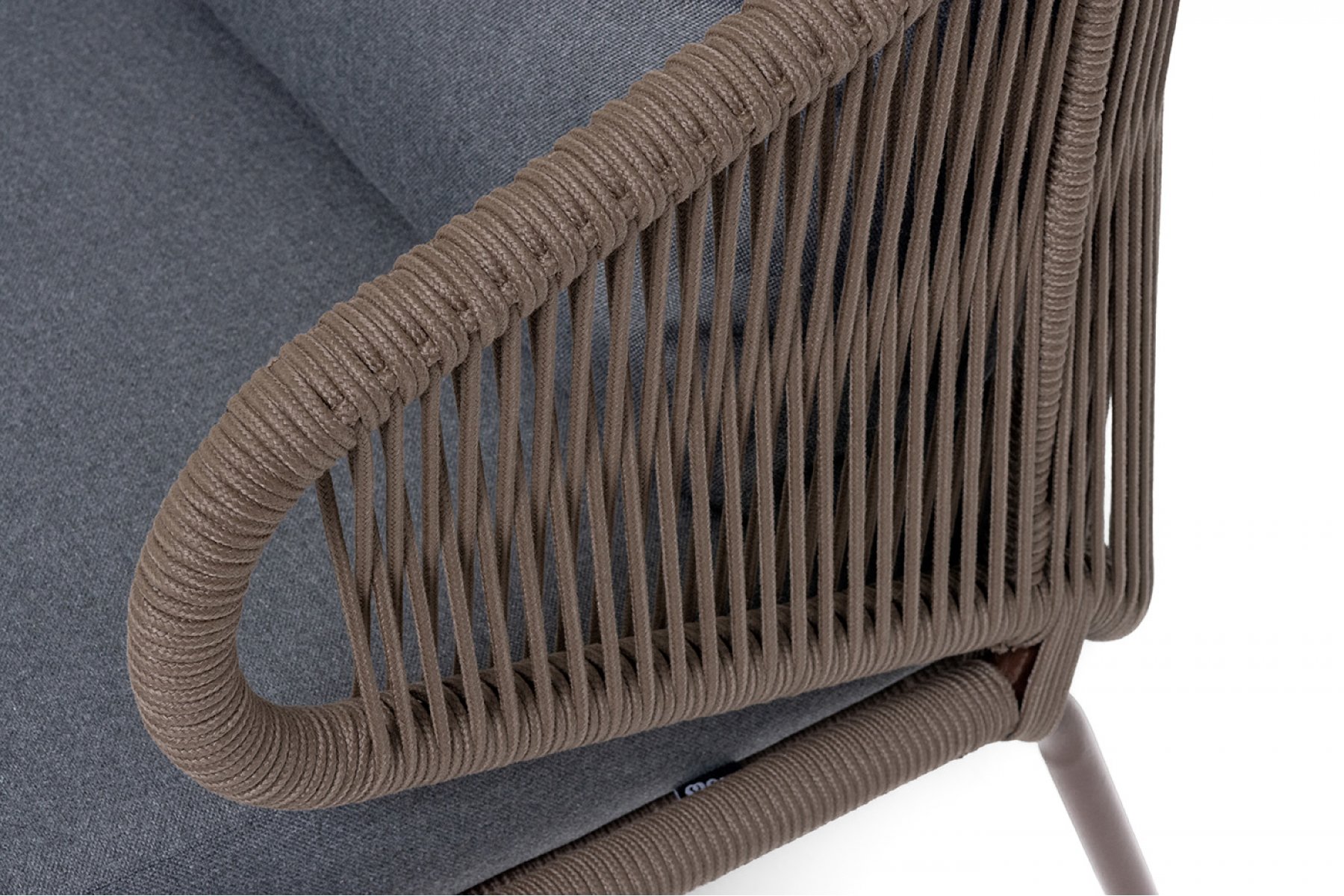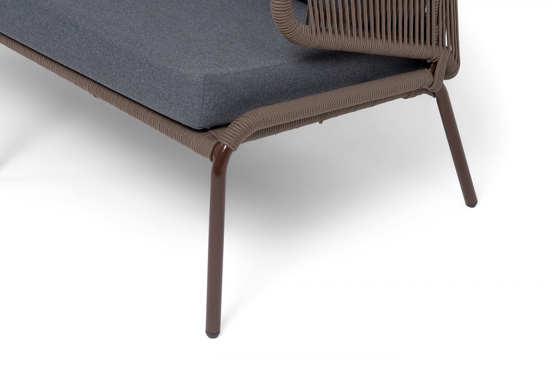 Диван имеет алюминиевый каркас, окрашенный порошковой краской в коричневый (RAL8016) цвет. Боковины каркаса и спинка вручную оплетены роупом - эластичными синтетическими лентами, изготовленными из высокопрочных полиэфирных волокон. Цвет оплетки – коричневый.