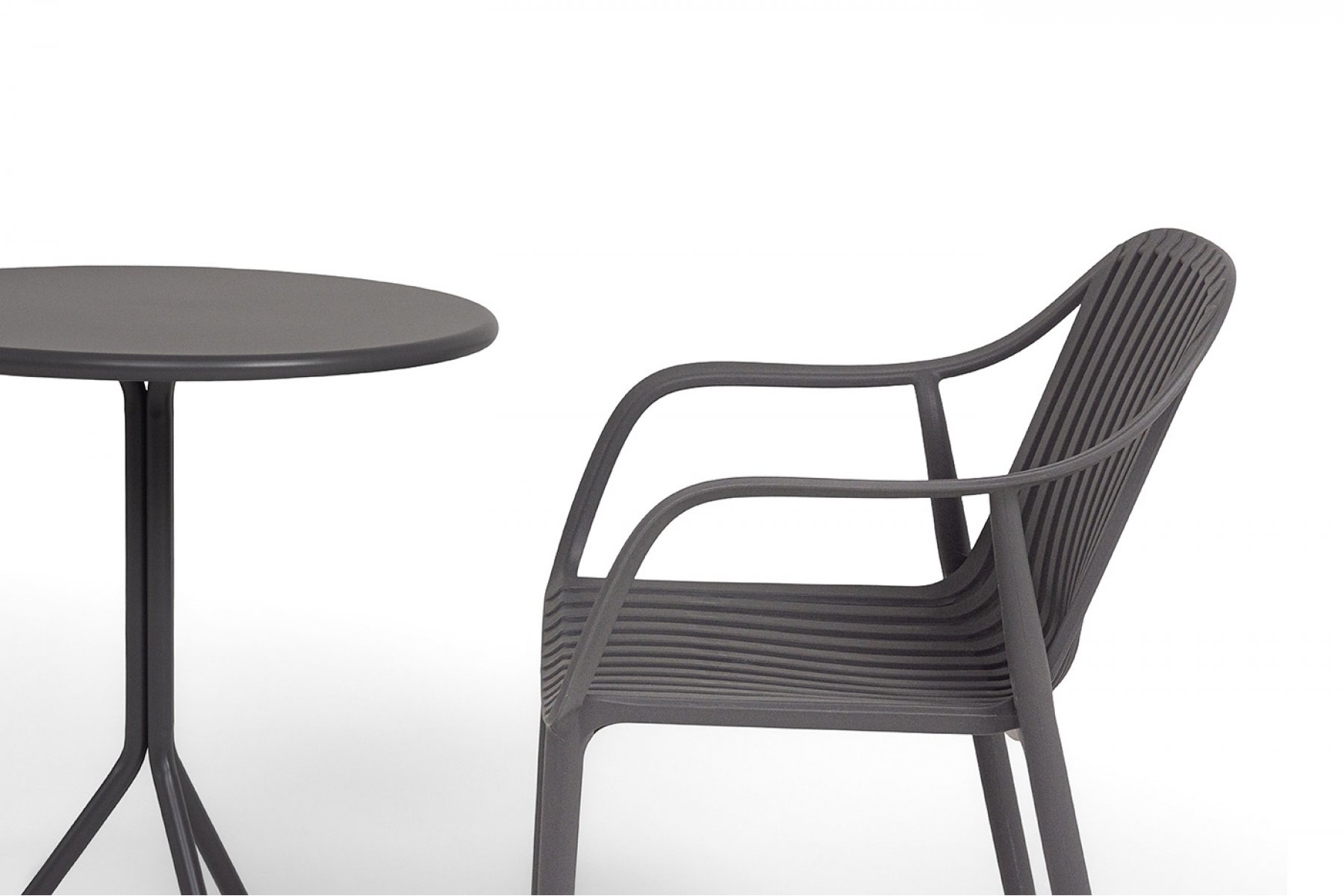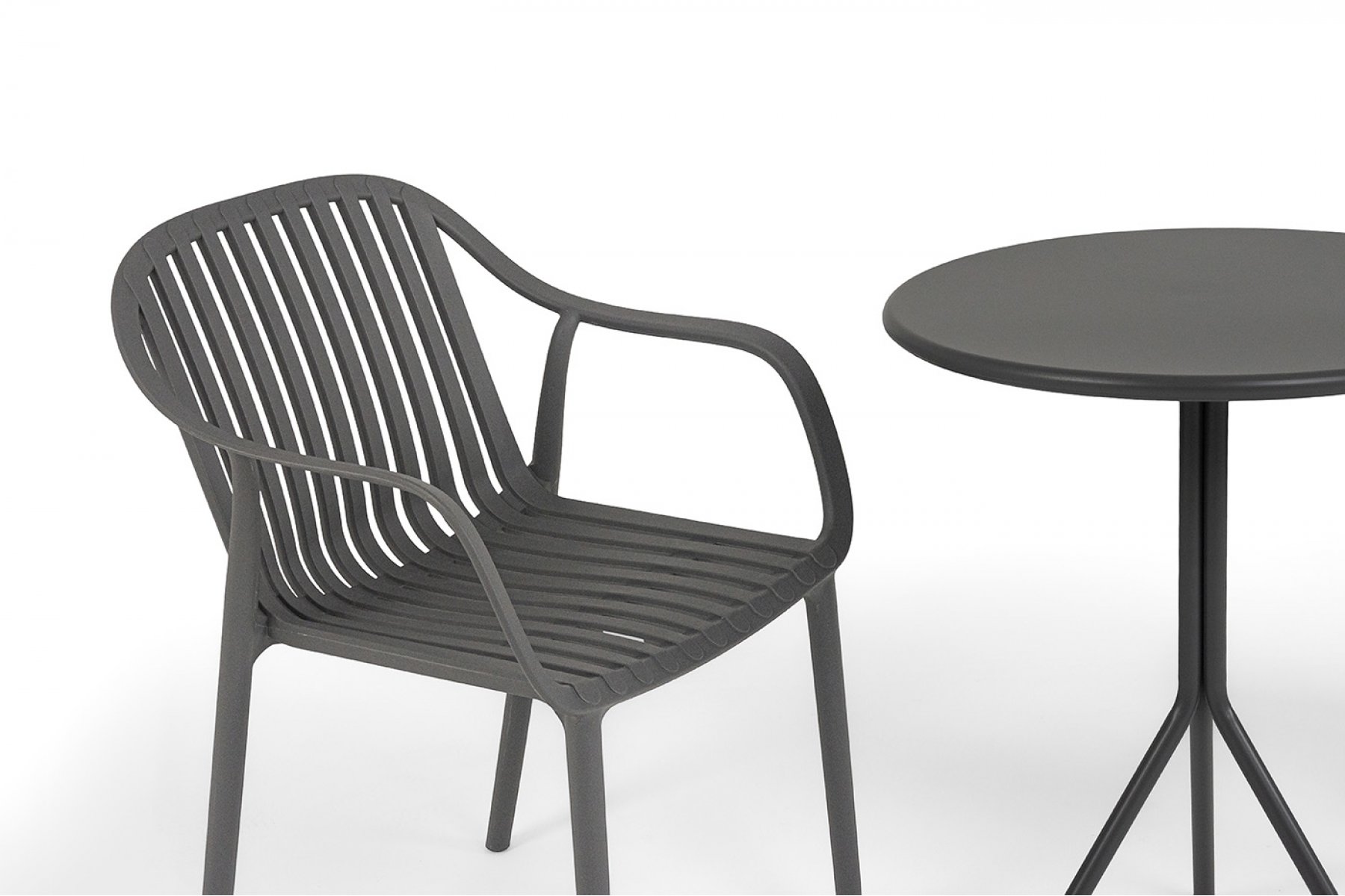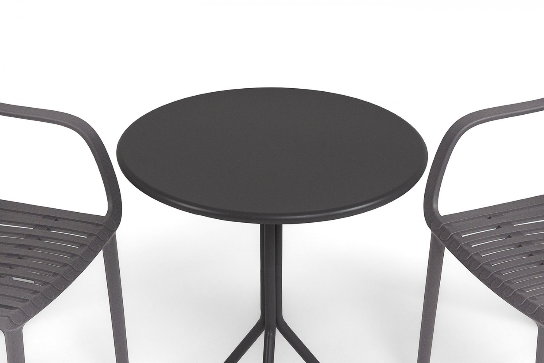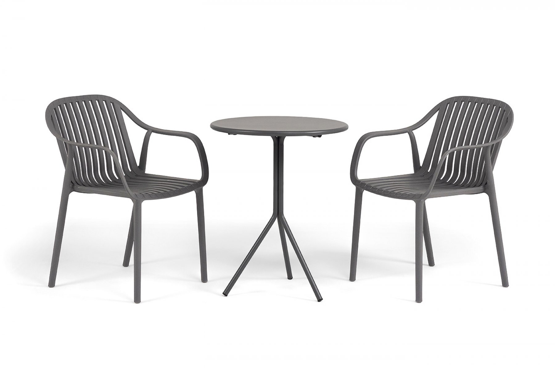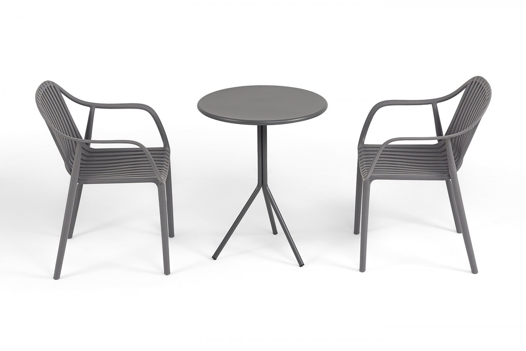 Стулья изготовлены из полипропилена, прочного и стойкого пластика, устойчивого к УФ-излучению, благодаря этому стул сохраняет свой первоначальный вид и не выцветает на солнце даже несмотря на активную эксплуатацию. Цвет - темно-серый. "Мохито" стальной круглый стол Ø60см, цвет темно-серый 1шт. 600Х600Х750, "Мохито" стул пластиковый, цвет темно-серый 2шт. 570Х580Х830,
