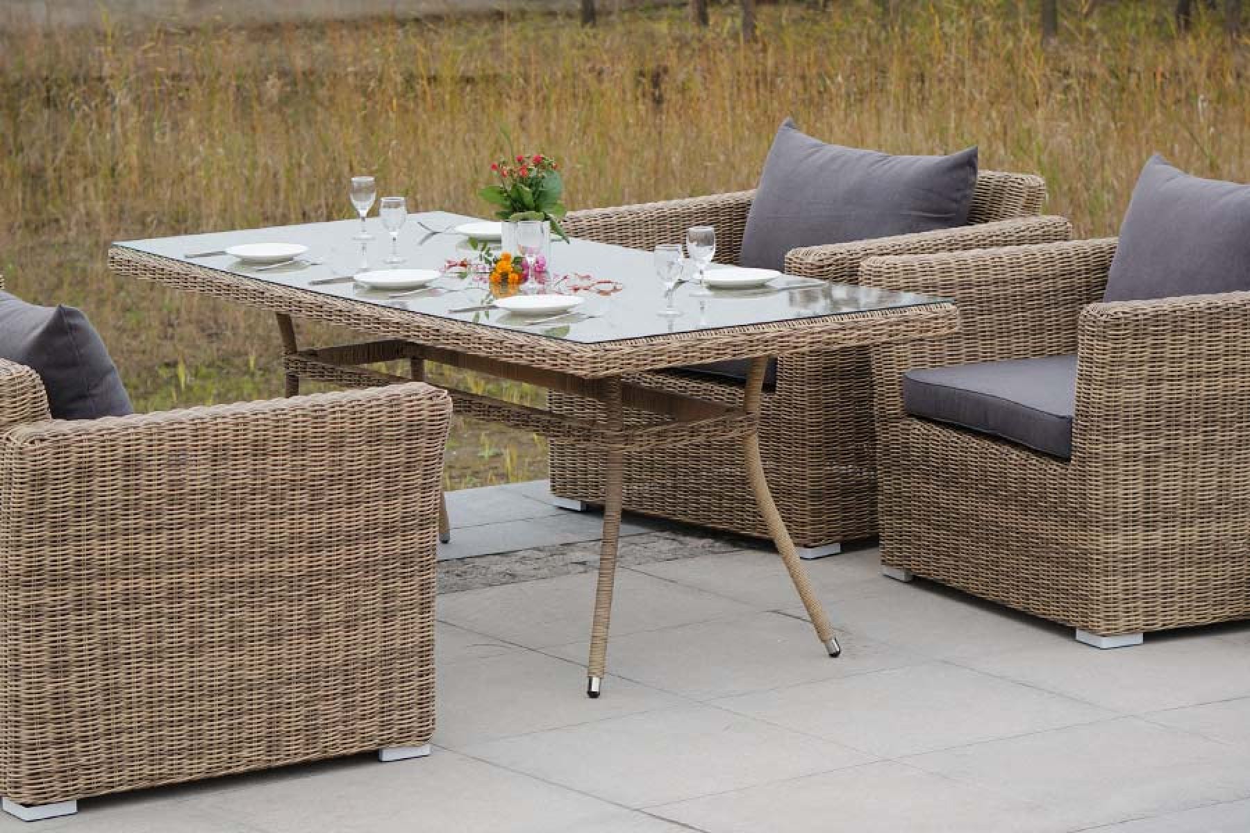 Обеденная группа из искусственного ротанга: 1 трехместный диван, 2 кресла и обеденный стол со стеклянной столешницей. Алюминиевый каркас, круглый искусственный ротанг, ручное плетение. Диван и кресла оснащены подушками со съемными чехлами. "Капучино" диван трехместный, соломенный 1шт. 2 200Х850Х810, "Капучино", кресло, соломенное 2шт. 1 050Х850Х810, "Латте", стол, соломенный 2000х900 1шт. 2 000Х900Х750,