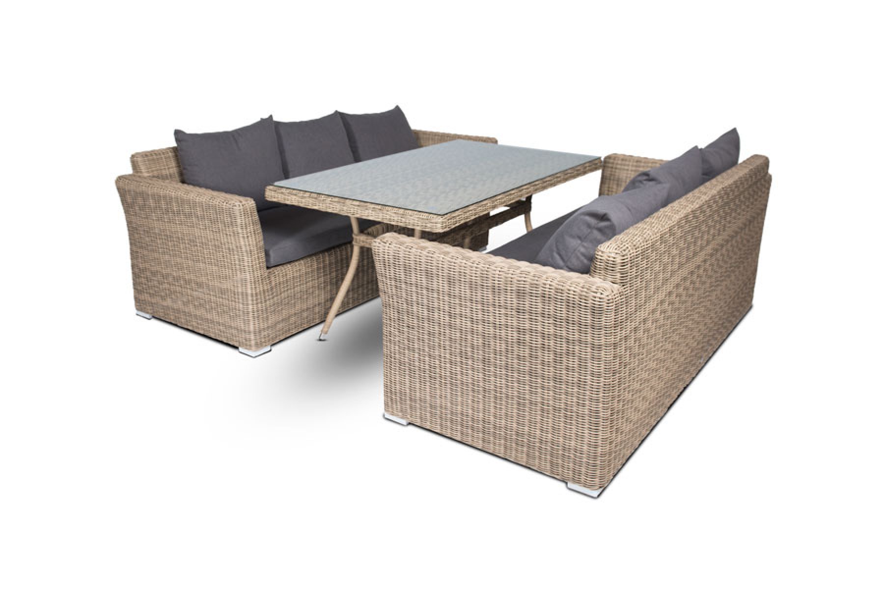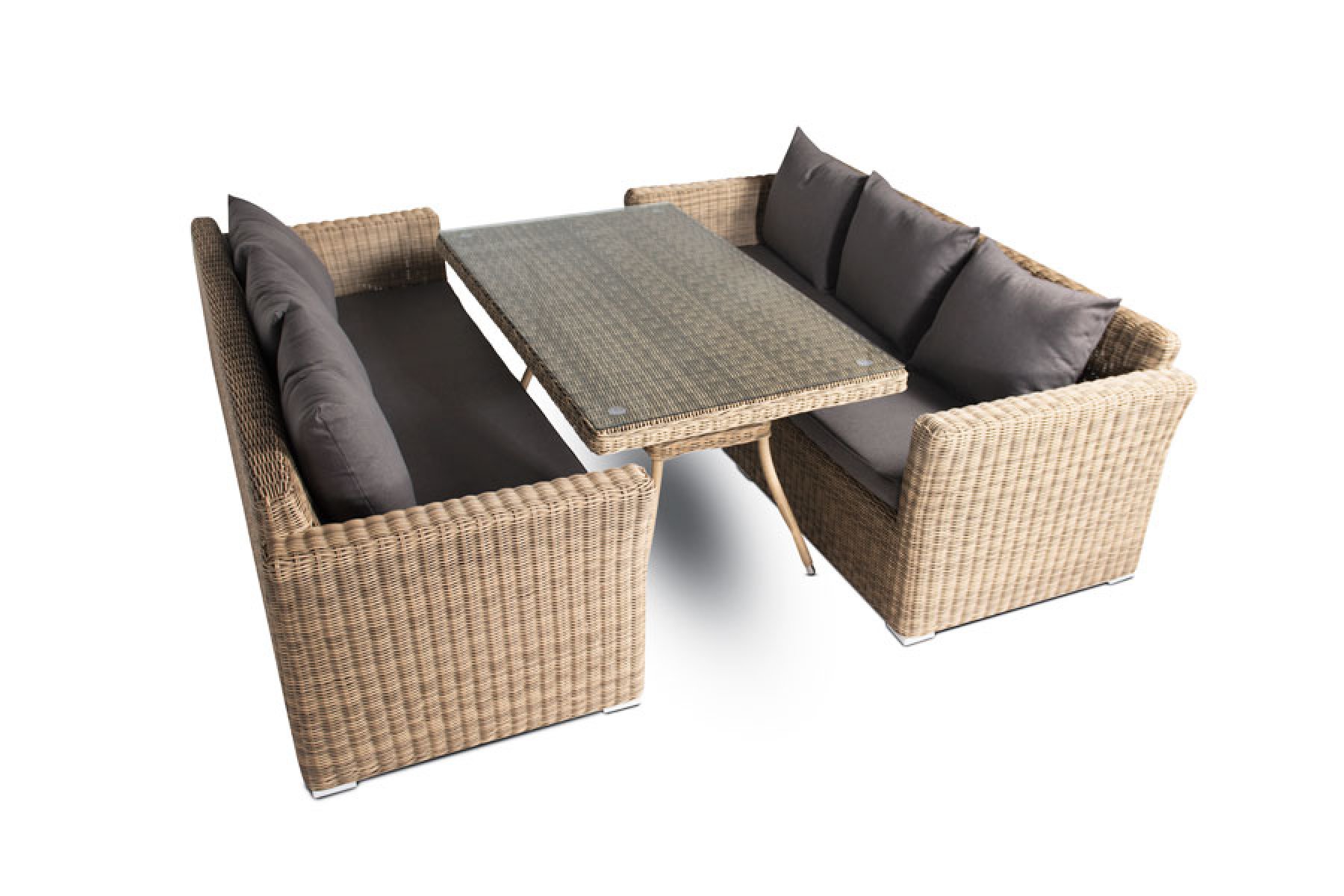 Обеденная группа Мокко Дабл из искусственного ротанга: 2 трехместных дивана и обеденный стол со стеклянной столешницей. Алюминиевый каркас, искусственный ротанг, круглое плетение,съемные чехлы серого цвета, ручная работа. "Капучино" диван трехместный, соломенный 2шт. 2 200Х850Х810, "Латте", стол, соломенный 2000х900 1шт. 2 000Х900Х750,