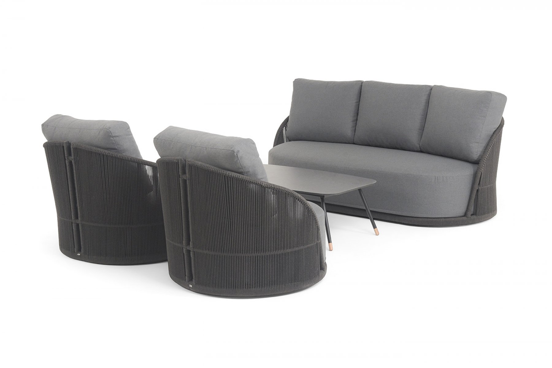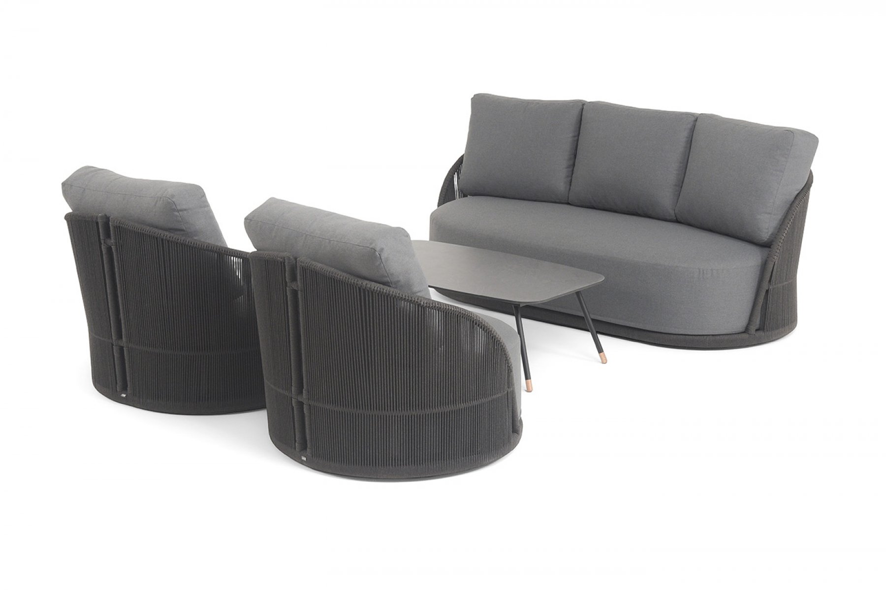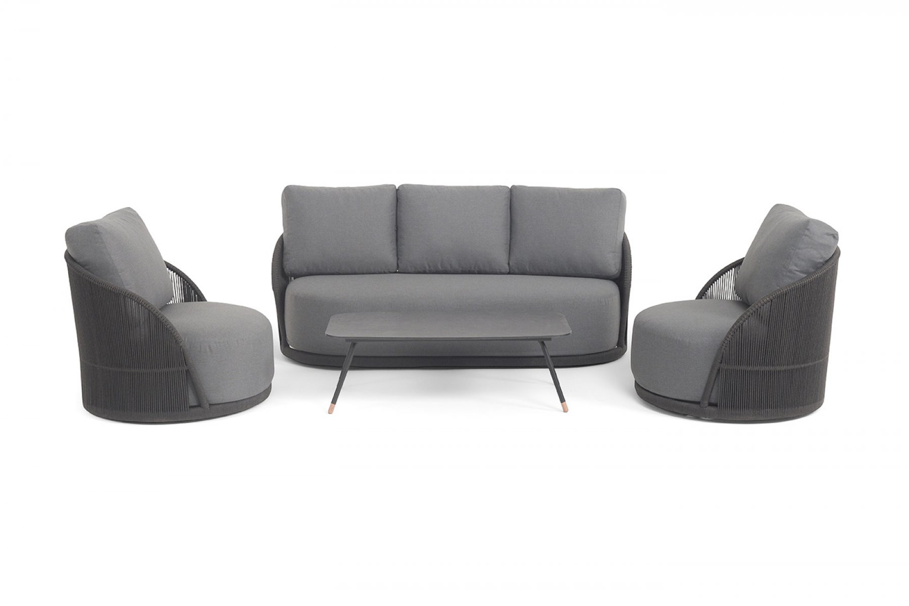 Кресла и диван идут в комплекте с мягкими подушками в чехлах "Монтелла" диван 3-местный плетеный из роупа, каркас алюминий темно-серый (RAL7024) муар, роуп темно-серый круглый, ткань темно-серая 027 1шт. 2 060Х925Х805, "Монтелла" кресло плетеное из роупа, каркас алюминий темно-серый (RAL7024) муар, роуп темно-серый круглый, ткань темно-серая 027 2шт. 1 040Х925Х81, "Верона" журнальный стол из HPL 120х65, H40, каркас темно-серый (RAL7024) муар, цвет столешницы "серый гранит" 1шт. 1 200Х650Х400,