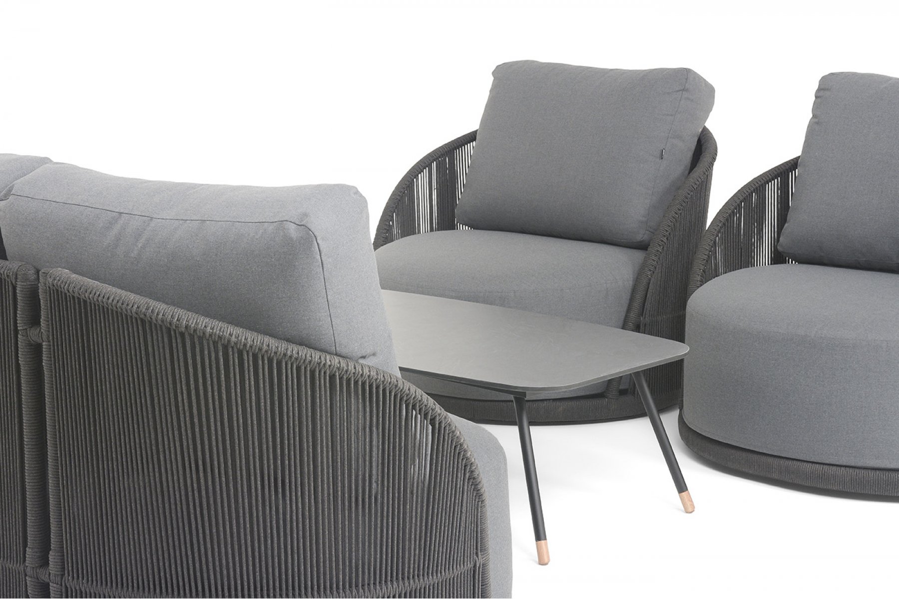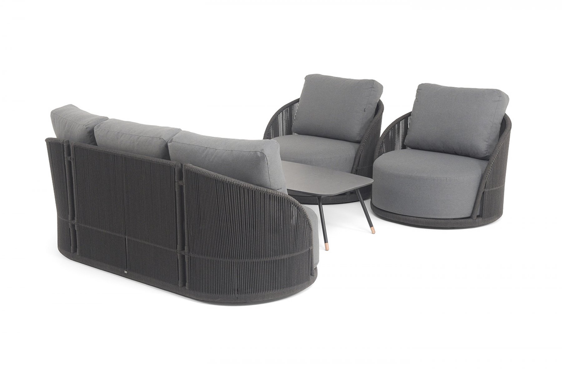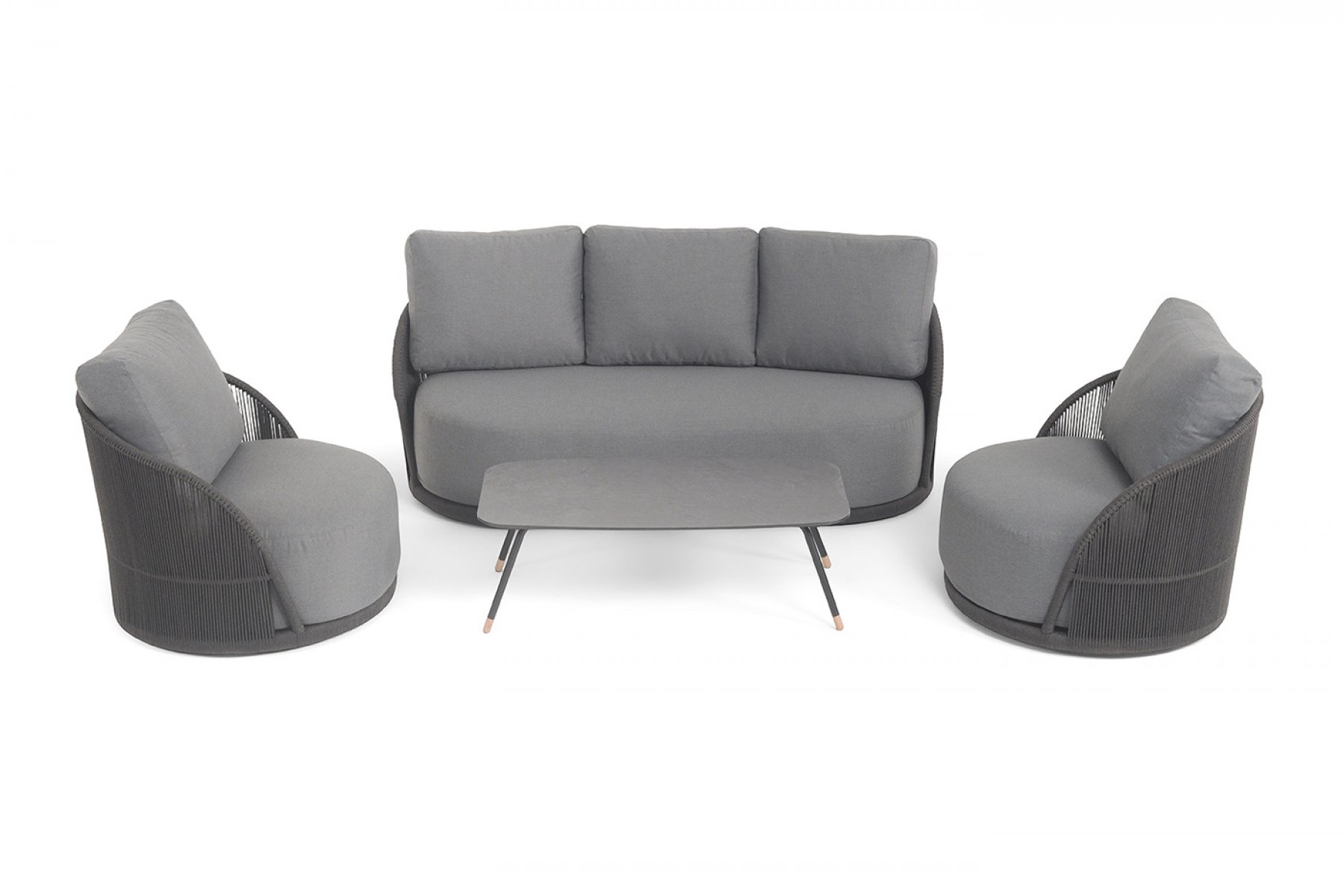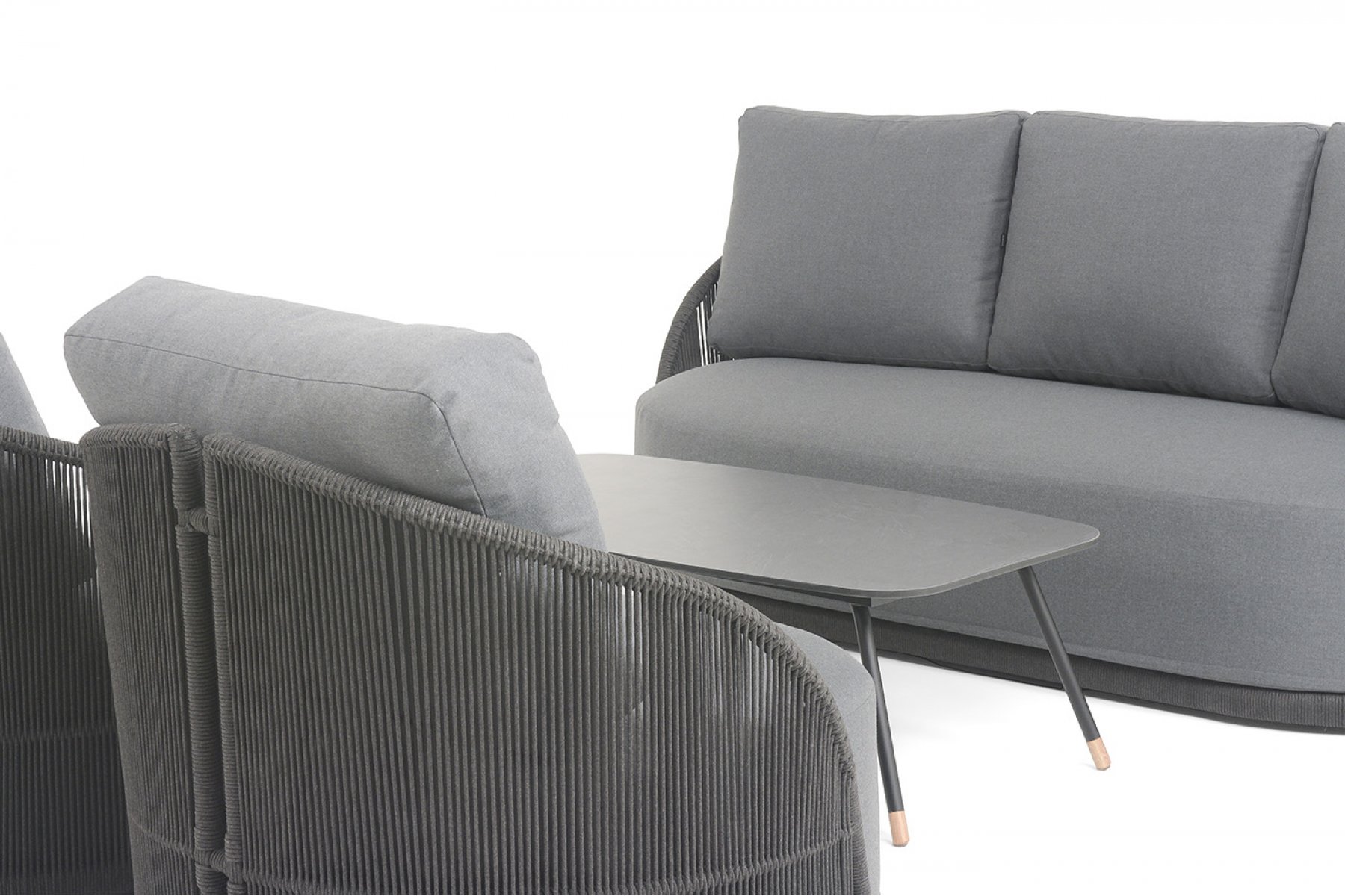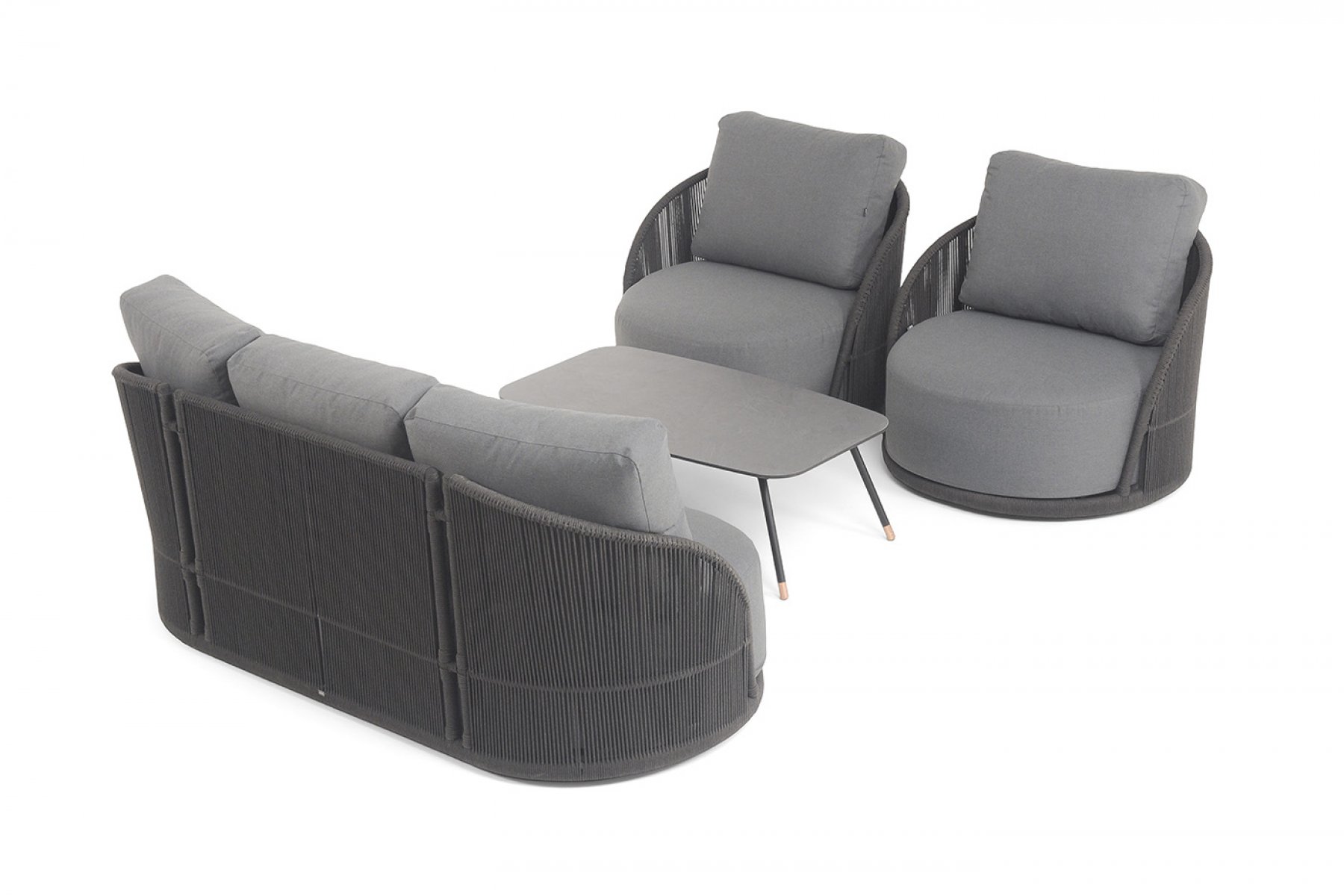 Каркас уличной мебели выполнен из износостойкого алюминия. Его дополняет темно-серая ручная оплетка, изготовленная на основе эластичных синтетических лент из полиэфирных волокон высокой прочности (роупа).