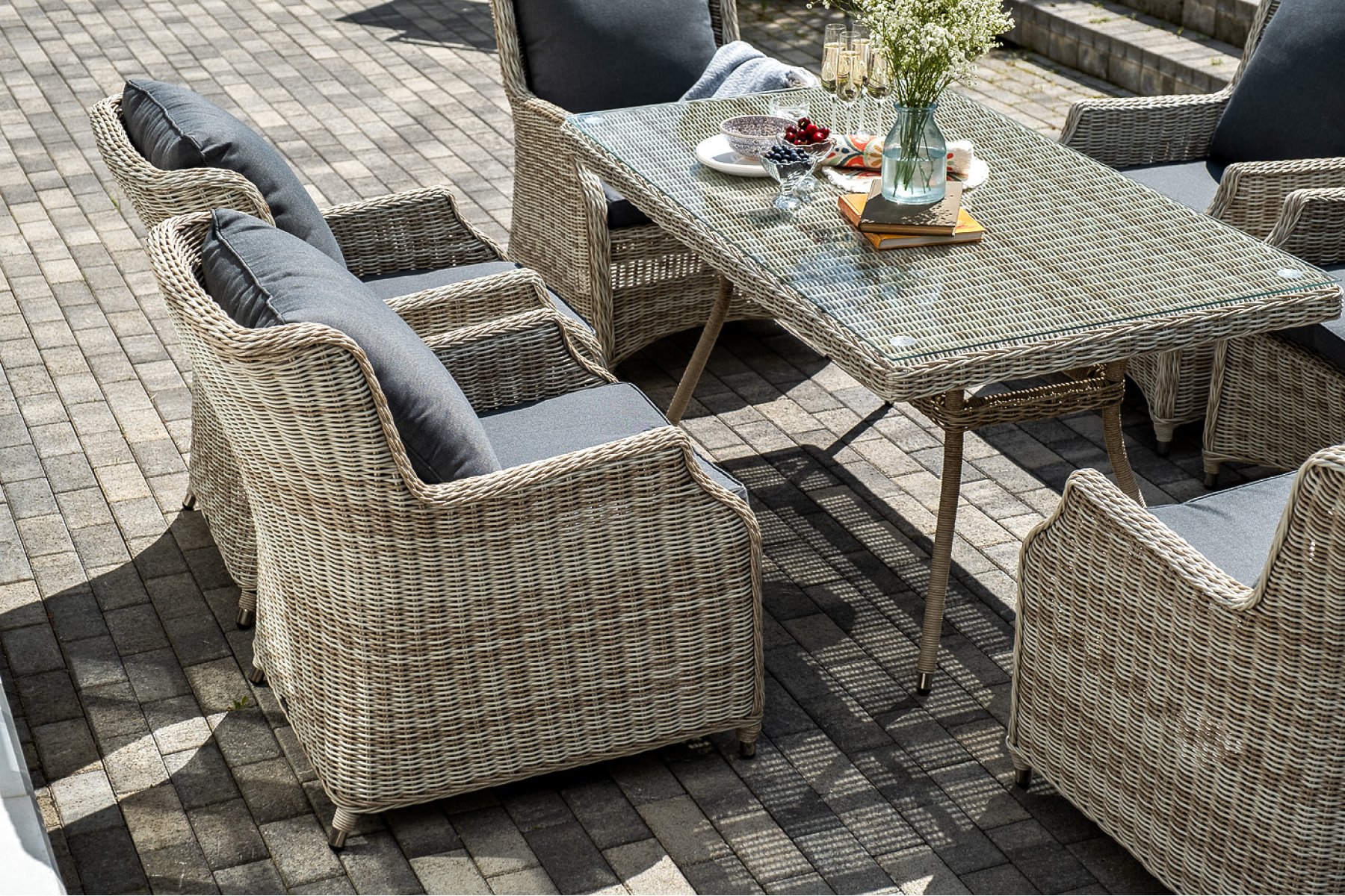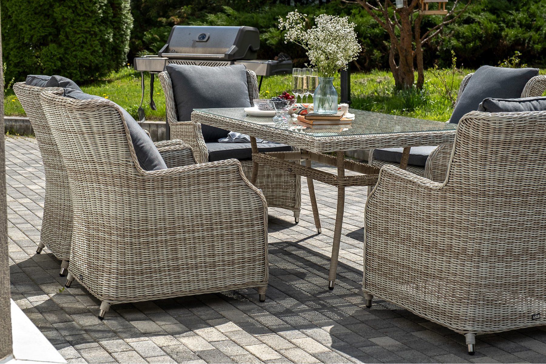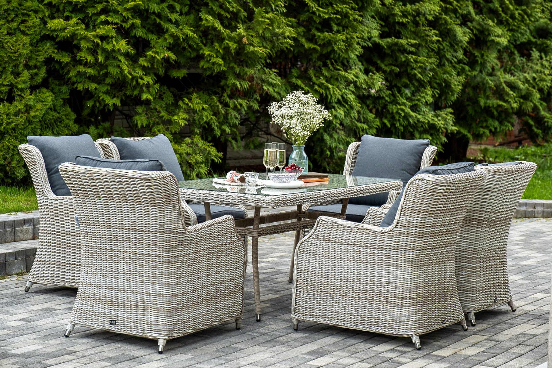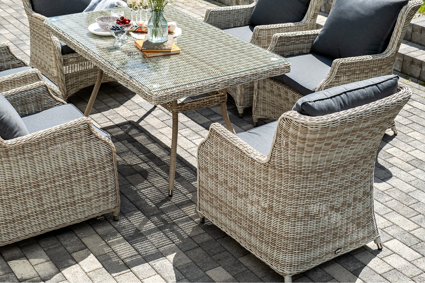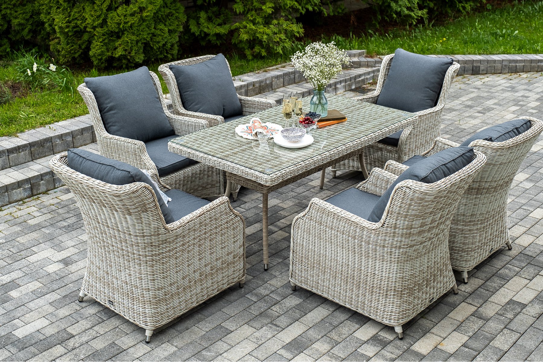 Столешница укомплектована ударопрочным стеклом, толщиной 5 мм. Данное стекло крепится к столу при помощи четырех вакуумных силиконовых присосок и поставляется в собранном виде. Плетеные стулья для удобства использования оснащены "Латте" плетеный стол из искусственного ротанга 160х90см, цвет бежевый 1шт. 1 600Х900Х750, "Неаполь" плетеный стул из искусственного ротанга, цвет бежевый 6шт. 650Х900Х920,