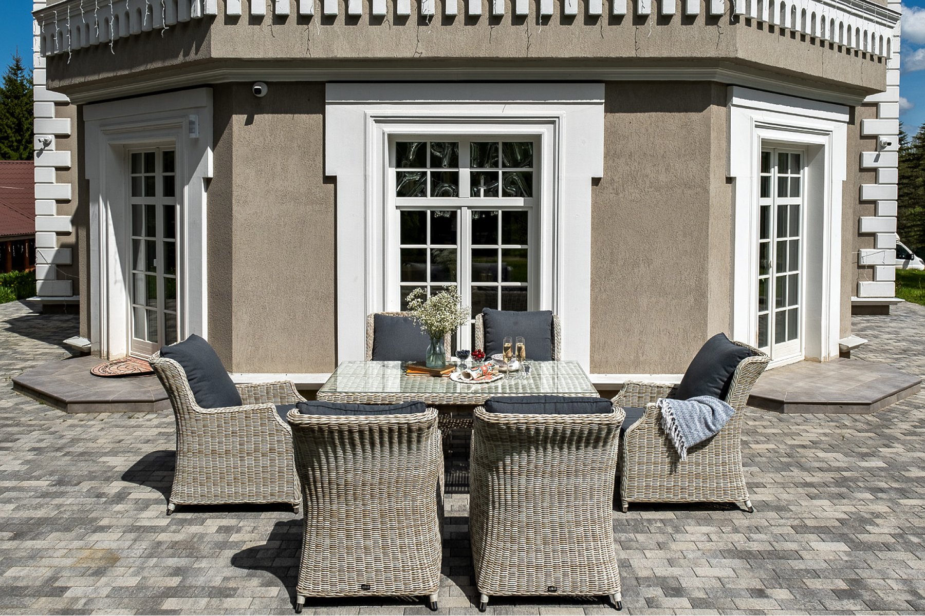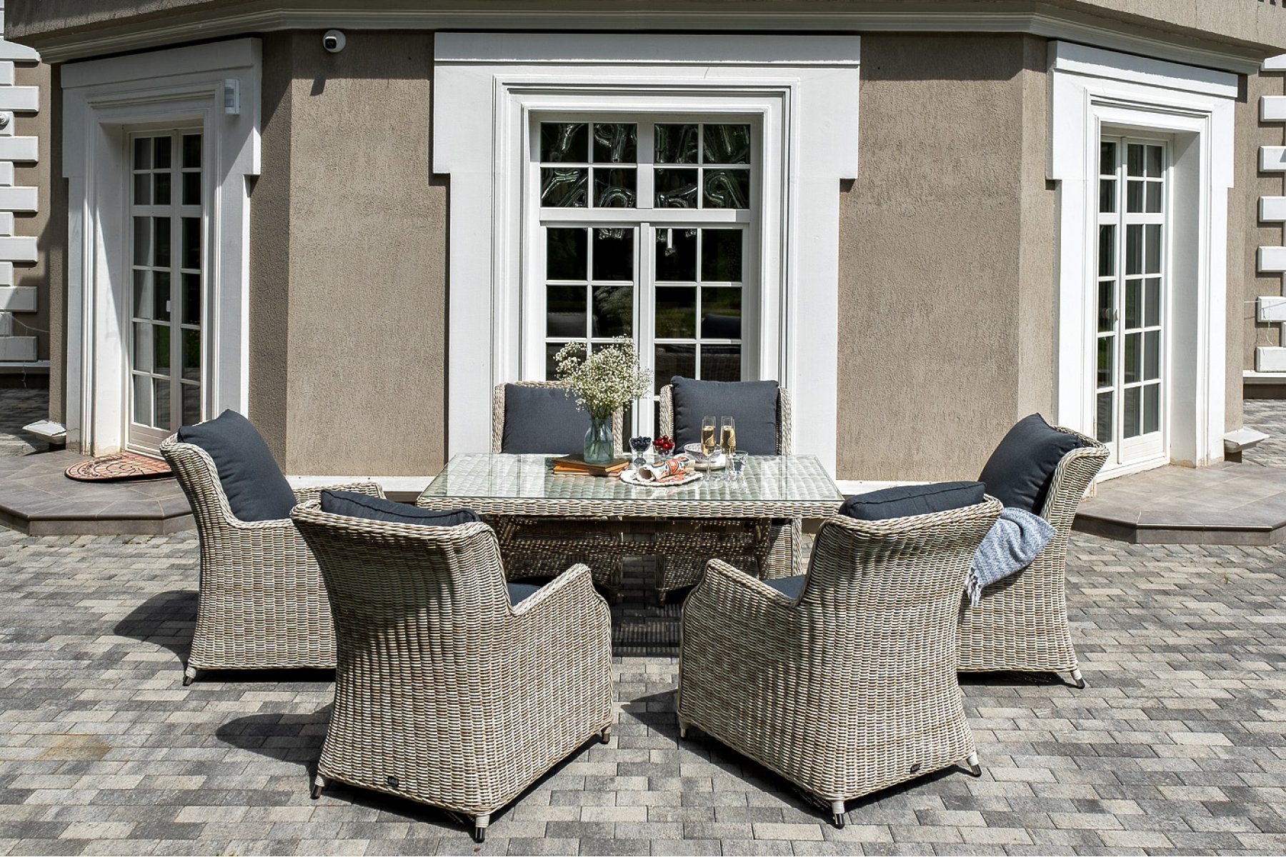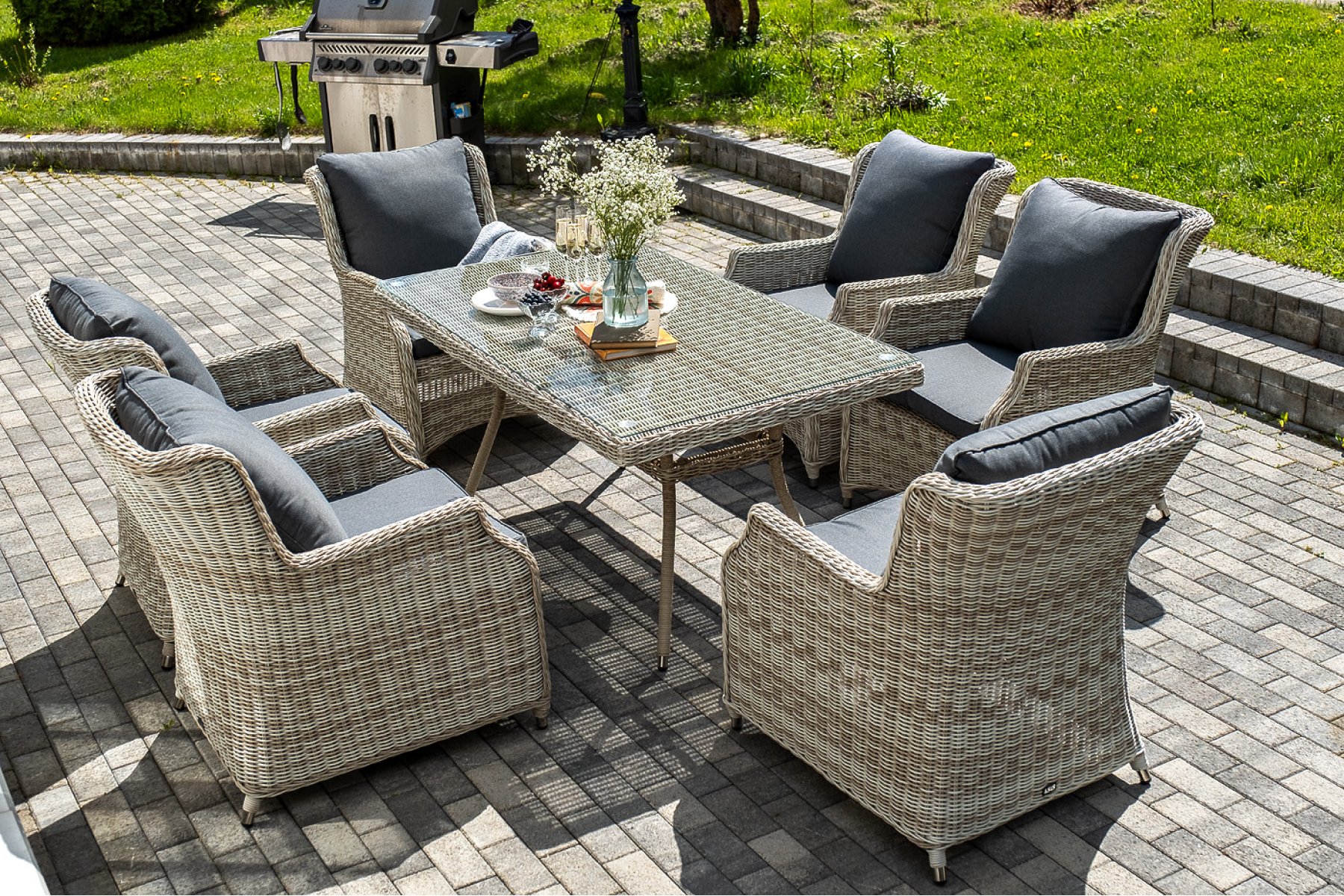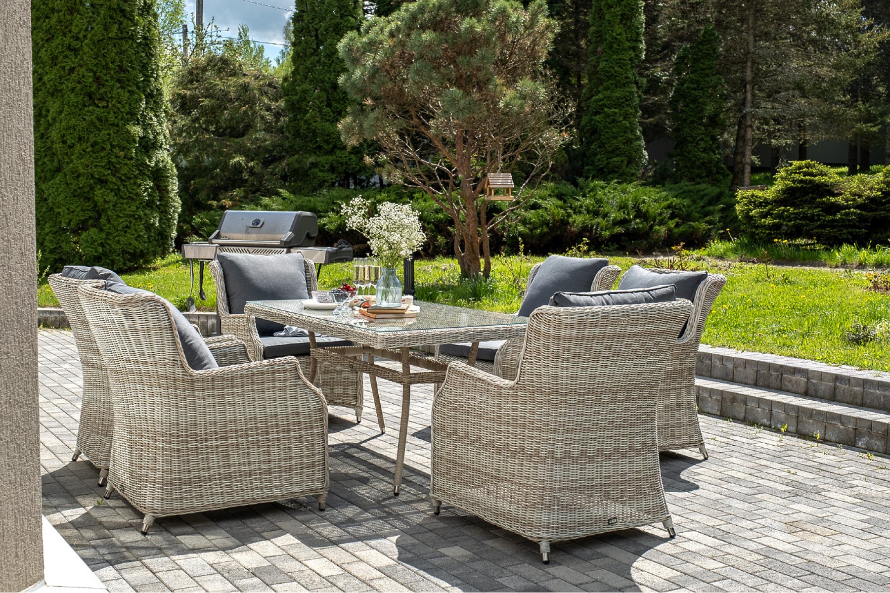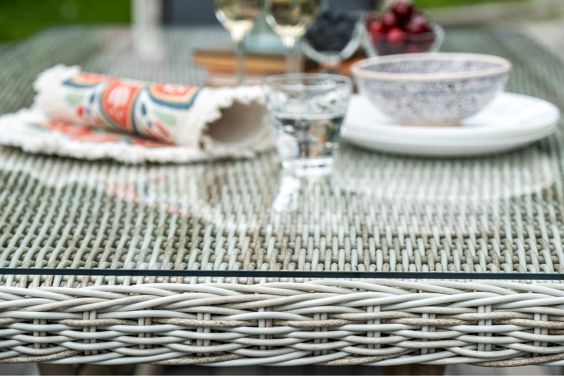 Столешница укомплектована ударопрочным стеклом, толщиной 5 мм. Данное стекло крепится к столу при помощи четырех вакуумных силиконовых присосок и поставляется в собранном виде. Плетеные стулья для удобства использования оснащены "Латте" плетеный стол из искусственного ротанга 160х90см, цвет бежевый 1шт. 1 600Х900Х750, "Неаполь" плетеный стул из искусственного ротанга, цвет бежевый 6шт. 650Х900Х920,