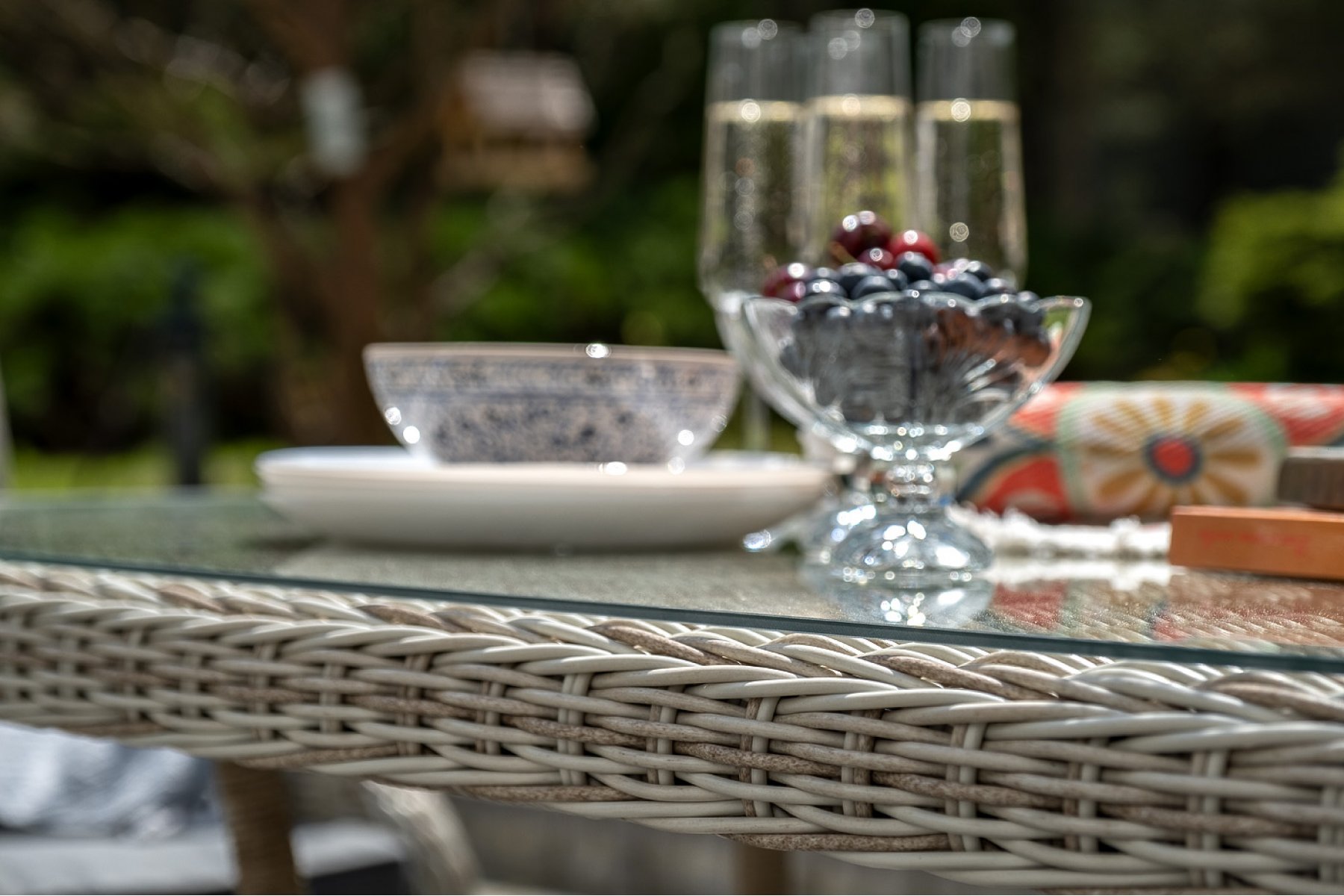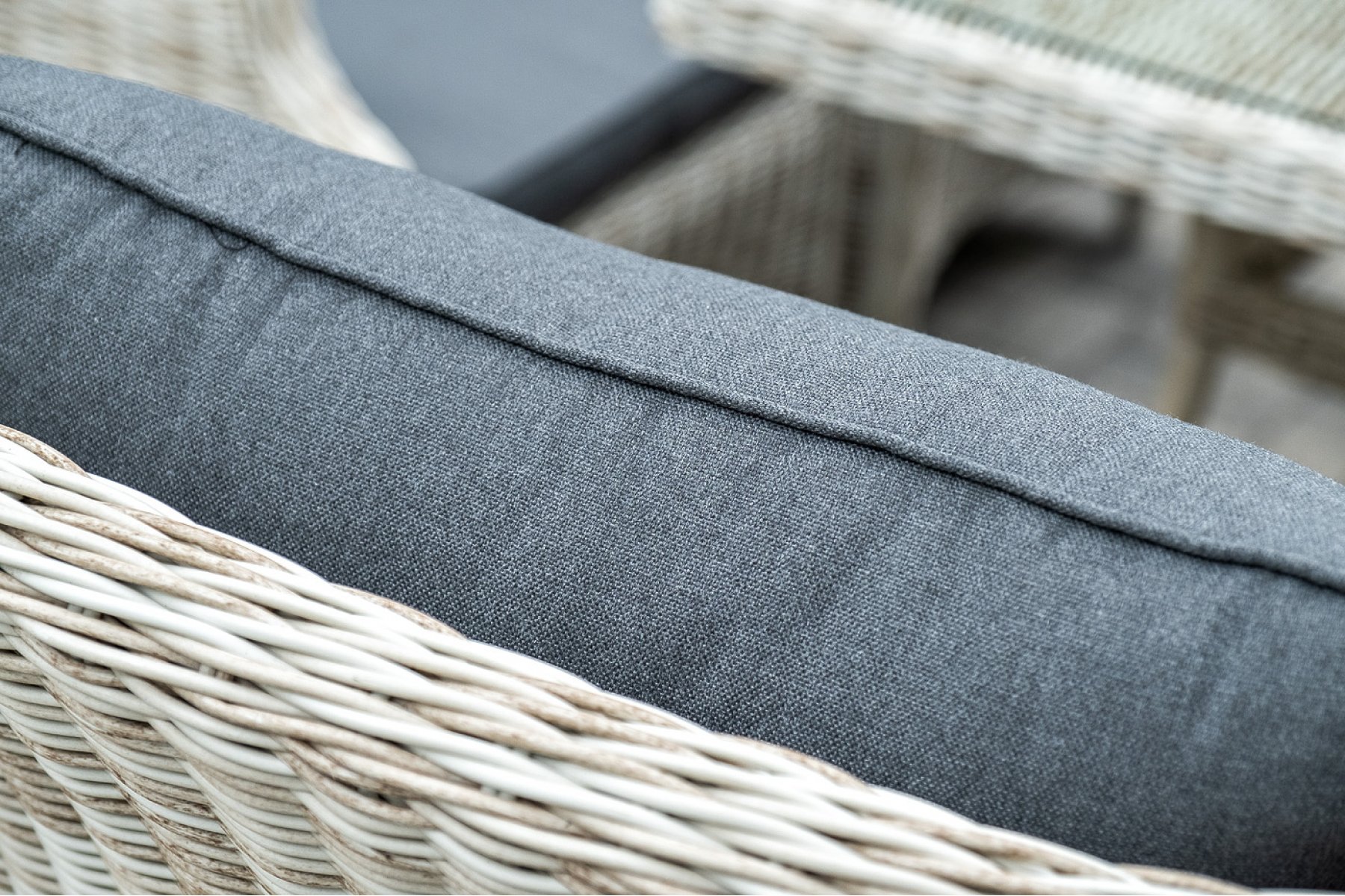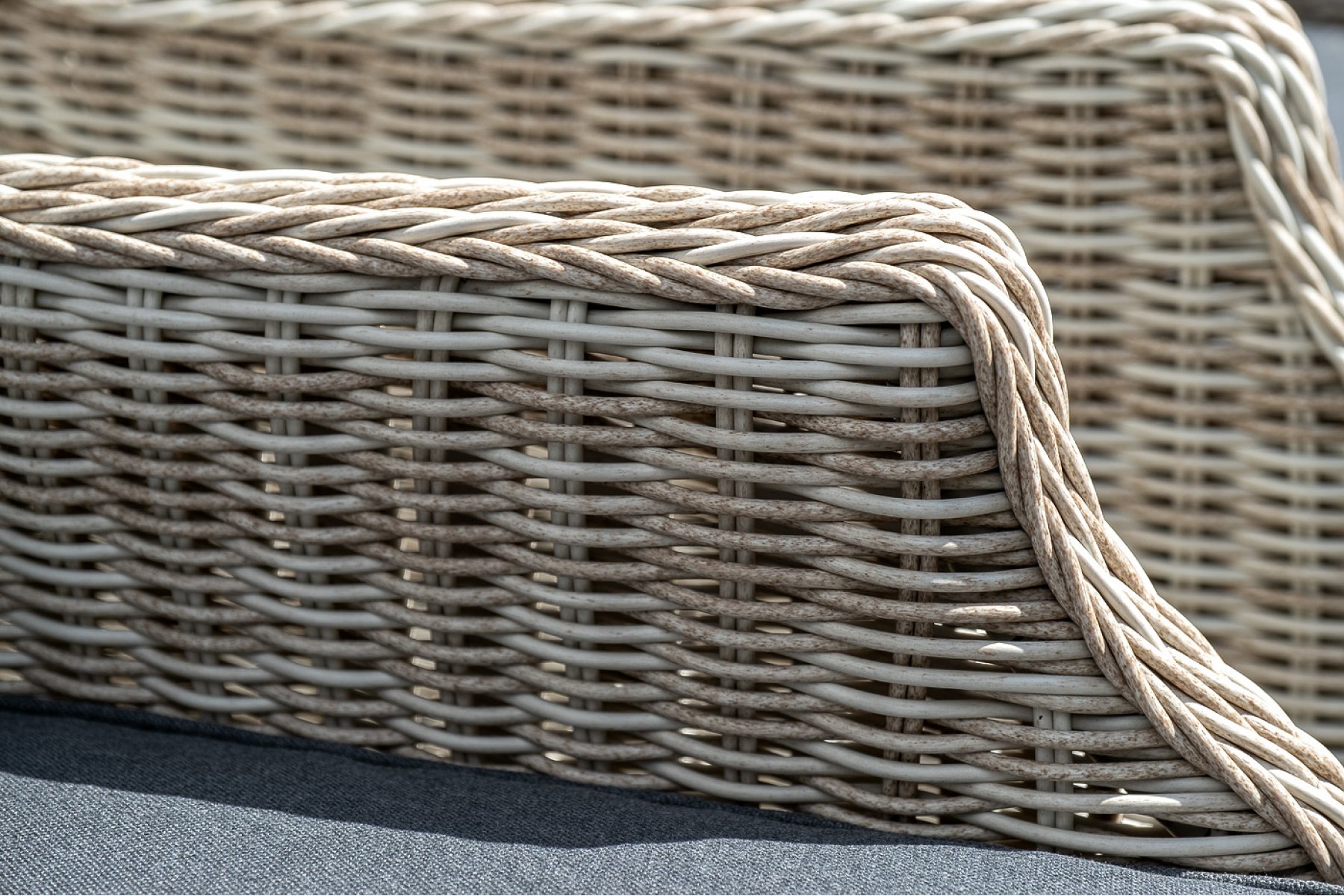 Каркас всех изделий выполнен из легкого и долговечного алюминия, оплетенного вручную круглым искусственным ротангом натурального бежевом цвета.