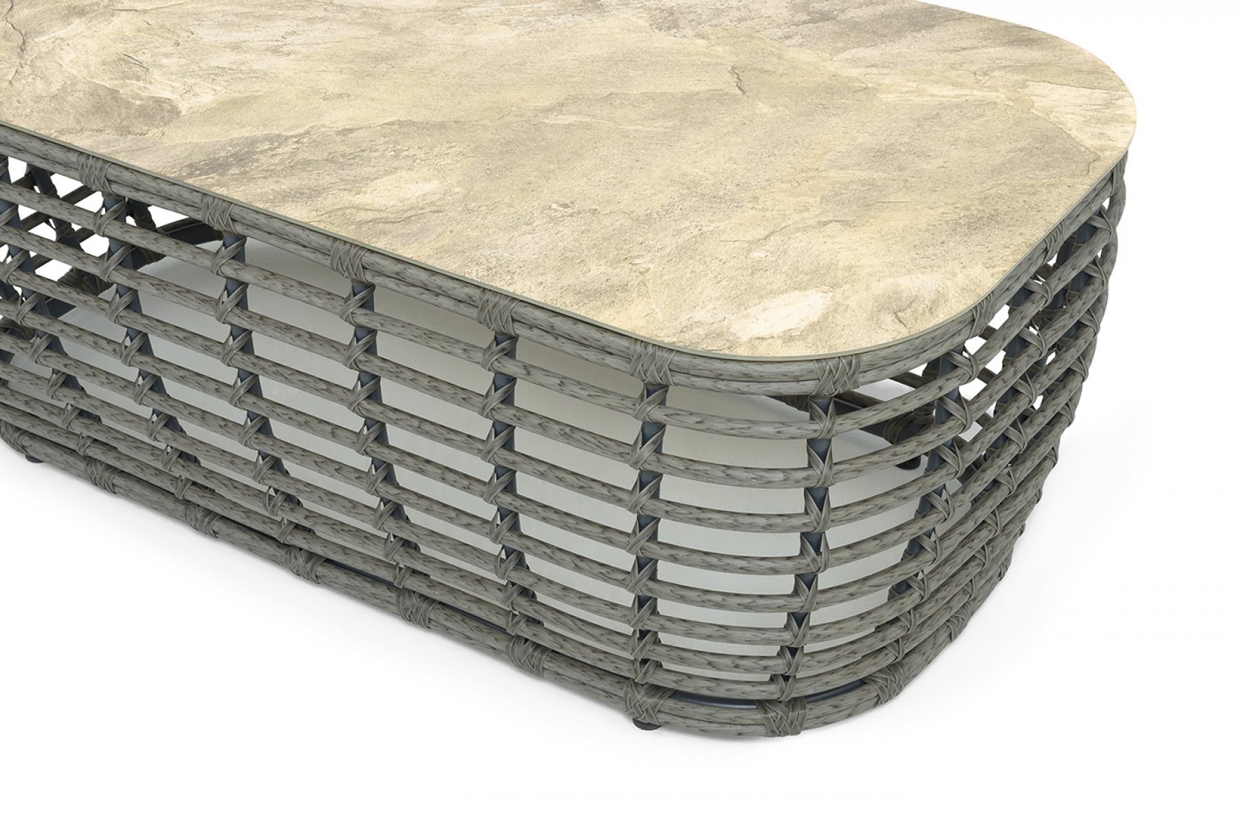 Каркас столика изготовлен из алюминия, вручную оплетенного круглым искусственным ротангом.