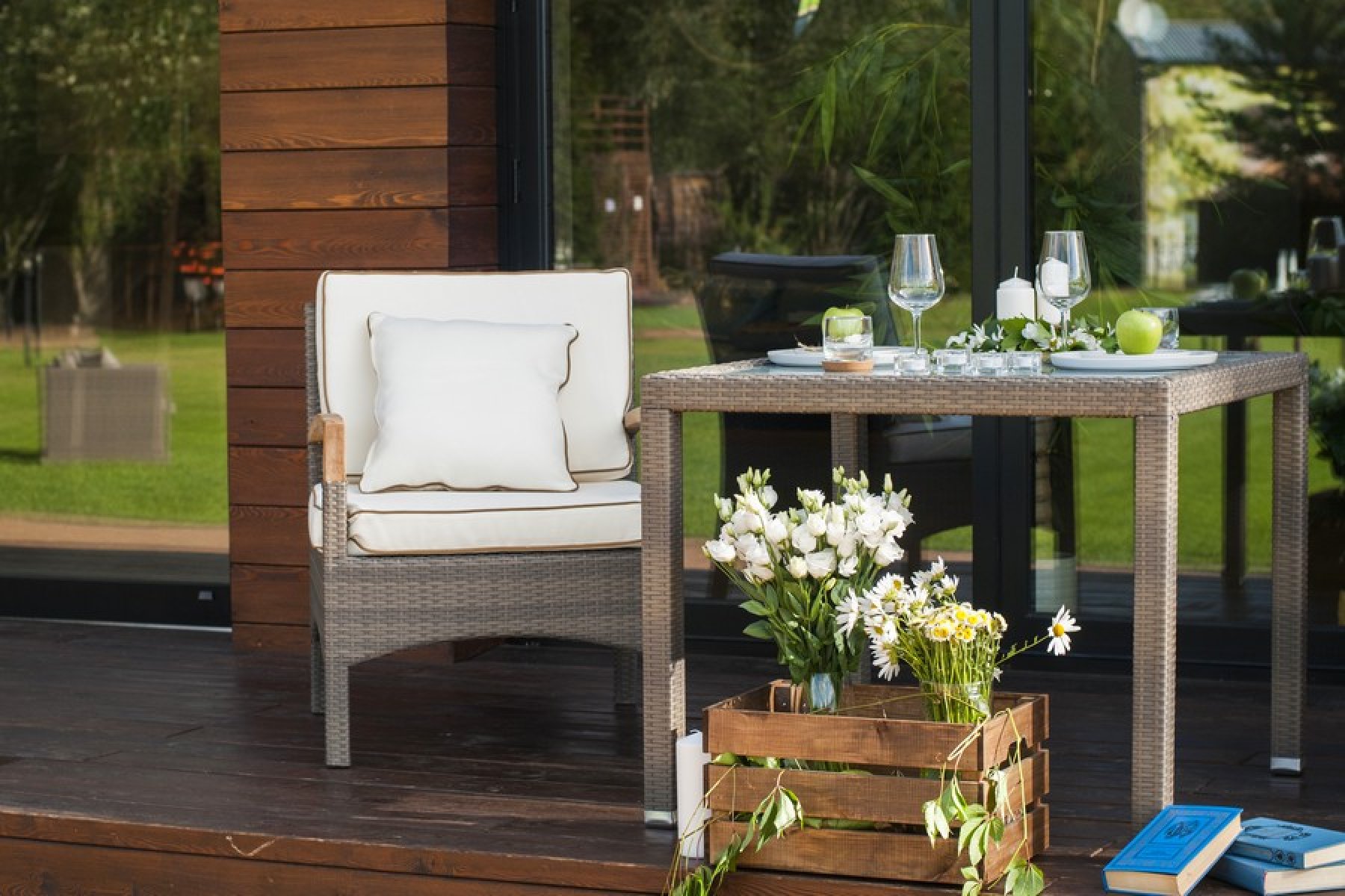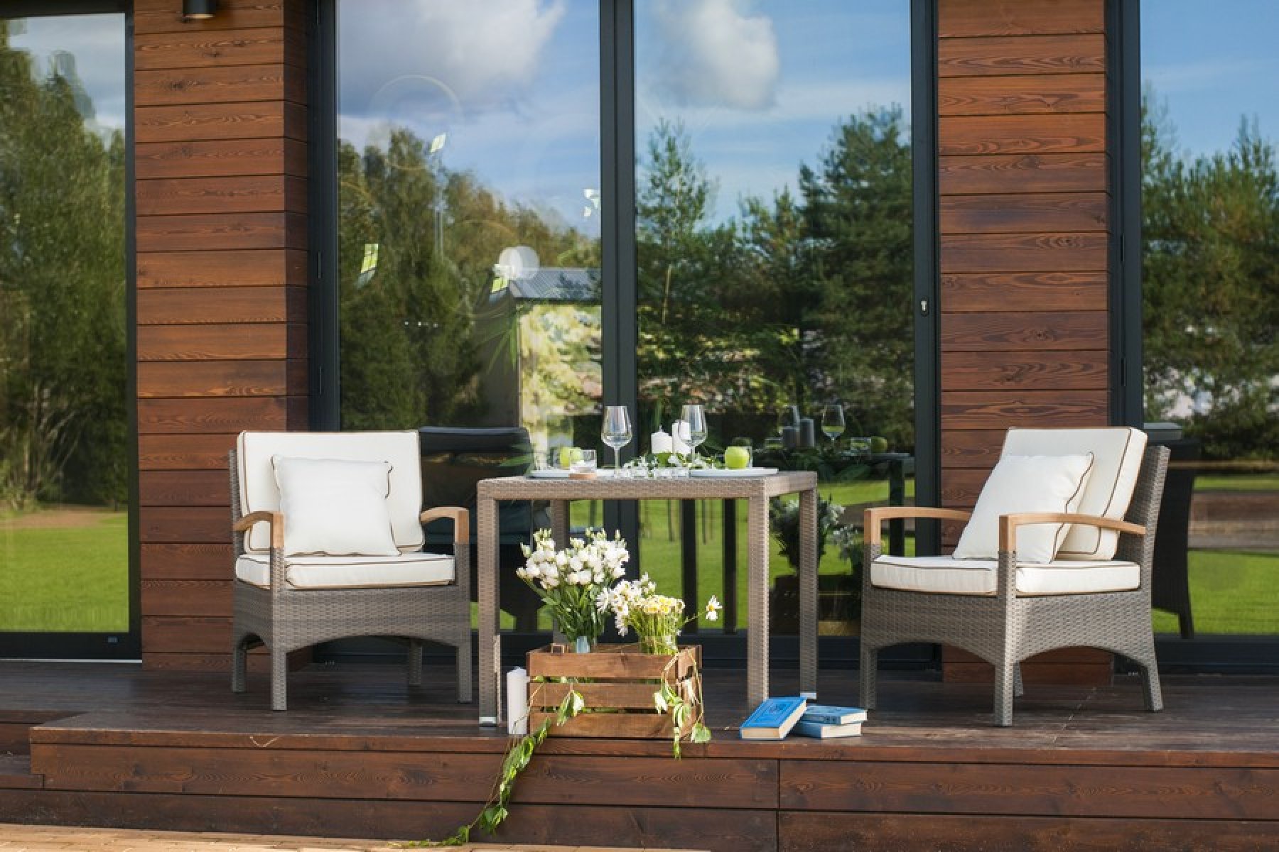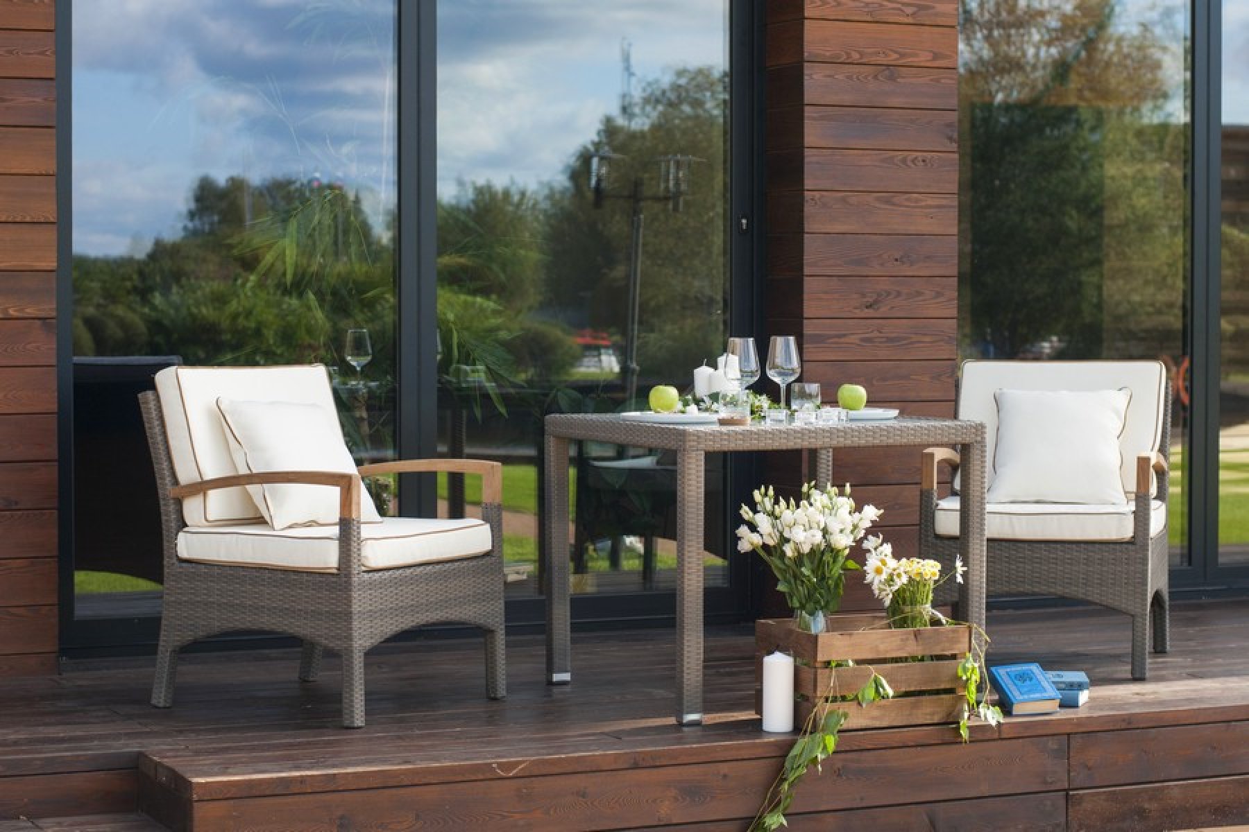 - Подушки выполнены из водостойкой полиэфирной ткани для защиты мебели от дождя и солнца