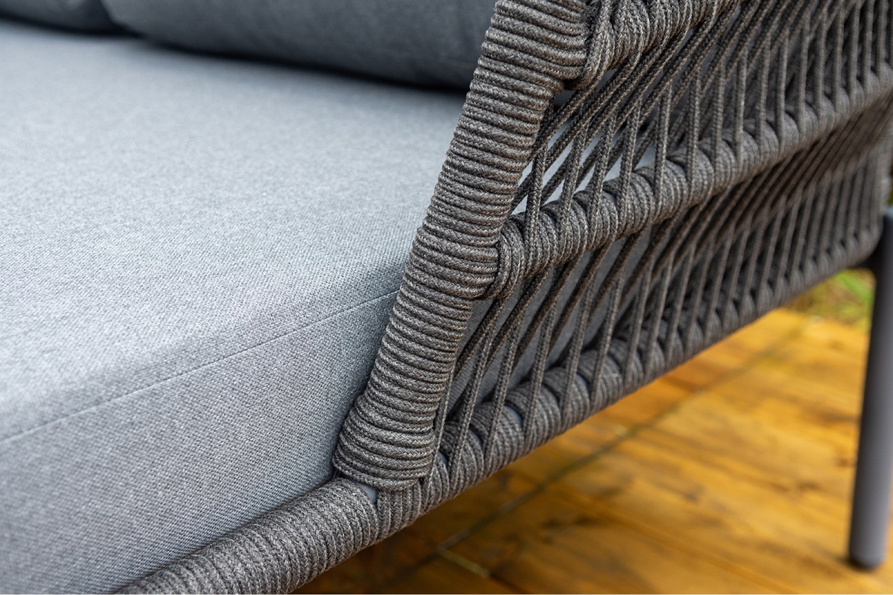 Оплетка боковин выполнена вручную из роупа — эластичных синтетических лент на основе высокопрочных полиэфирных волокон. Темно‑серый оттенок оплетки гармонично сочетается с к