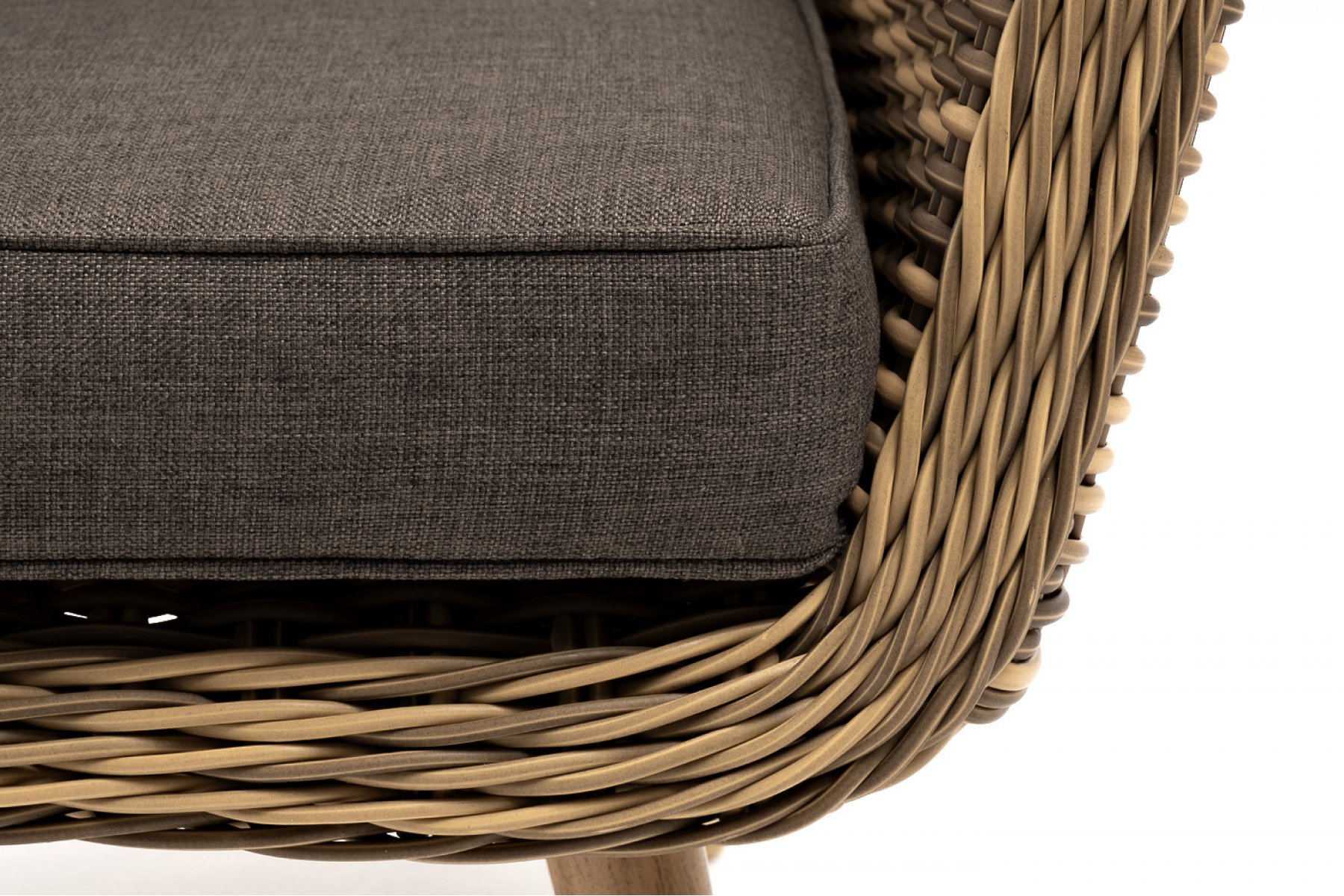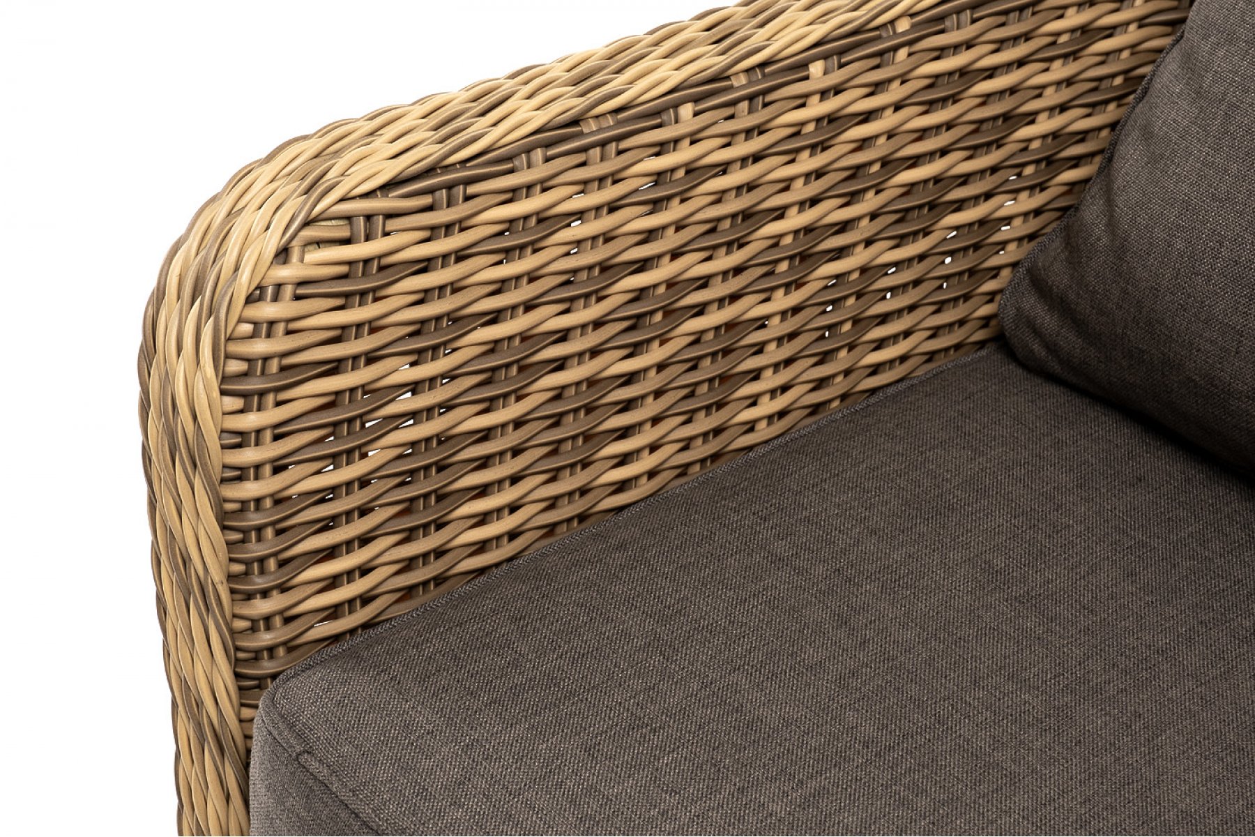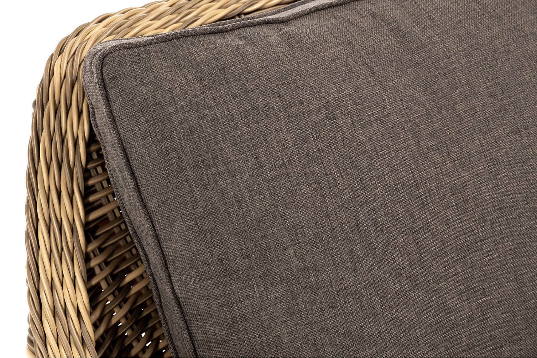 В комплекте с уличным ротанговым креслом идут мягкие подушки со съёмными чехлами серого оттенка. Они пошиты из полиэстера, который не боится повышенной влажности благодаря наличию влагоотталки