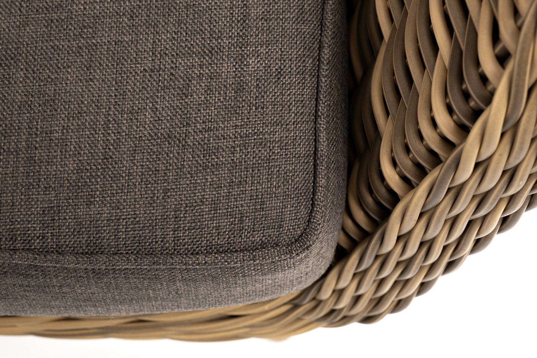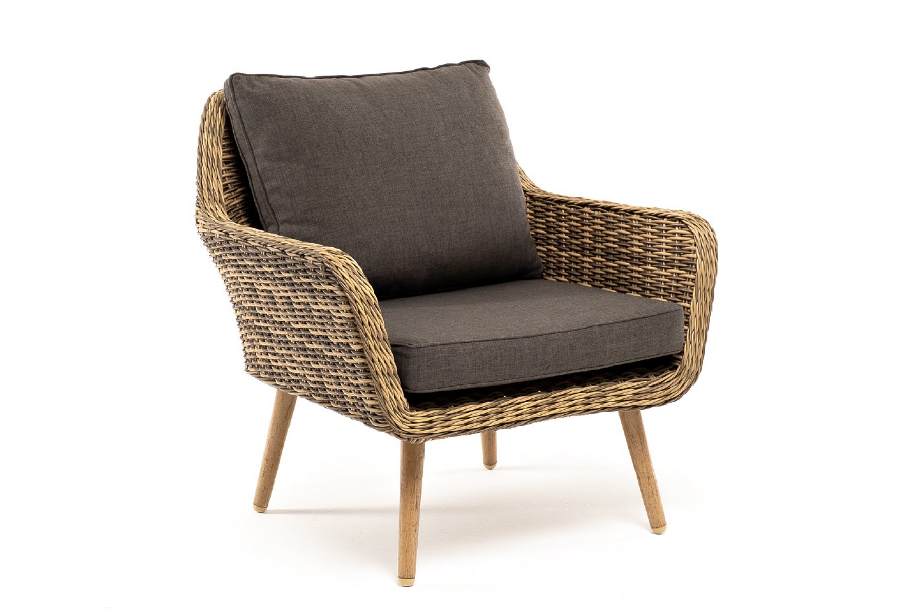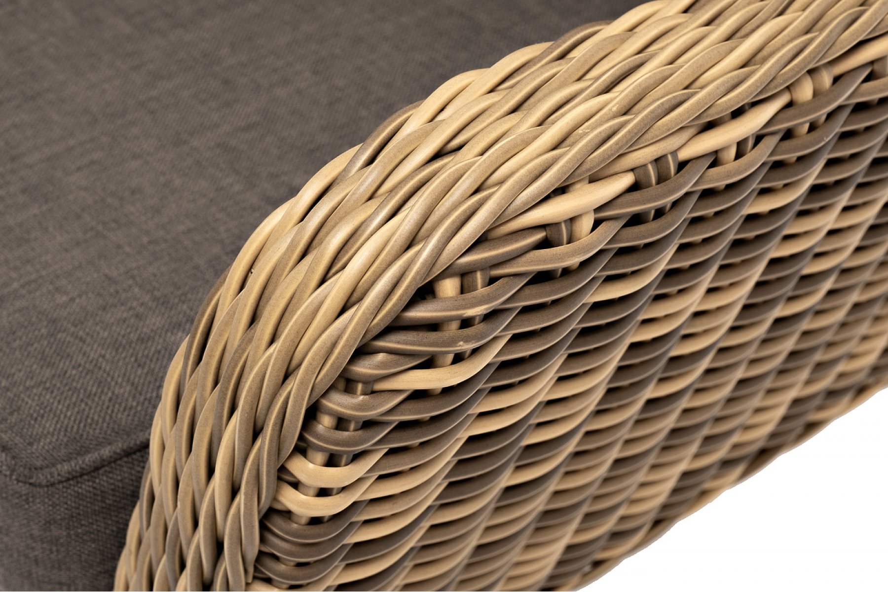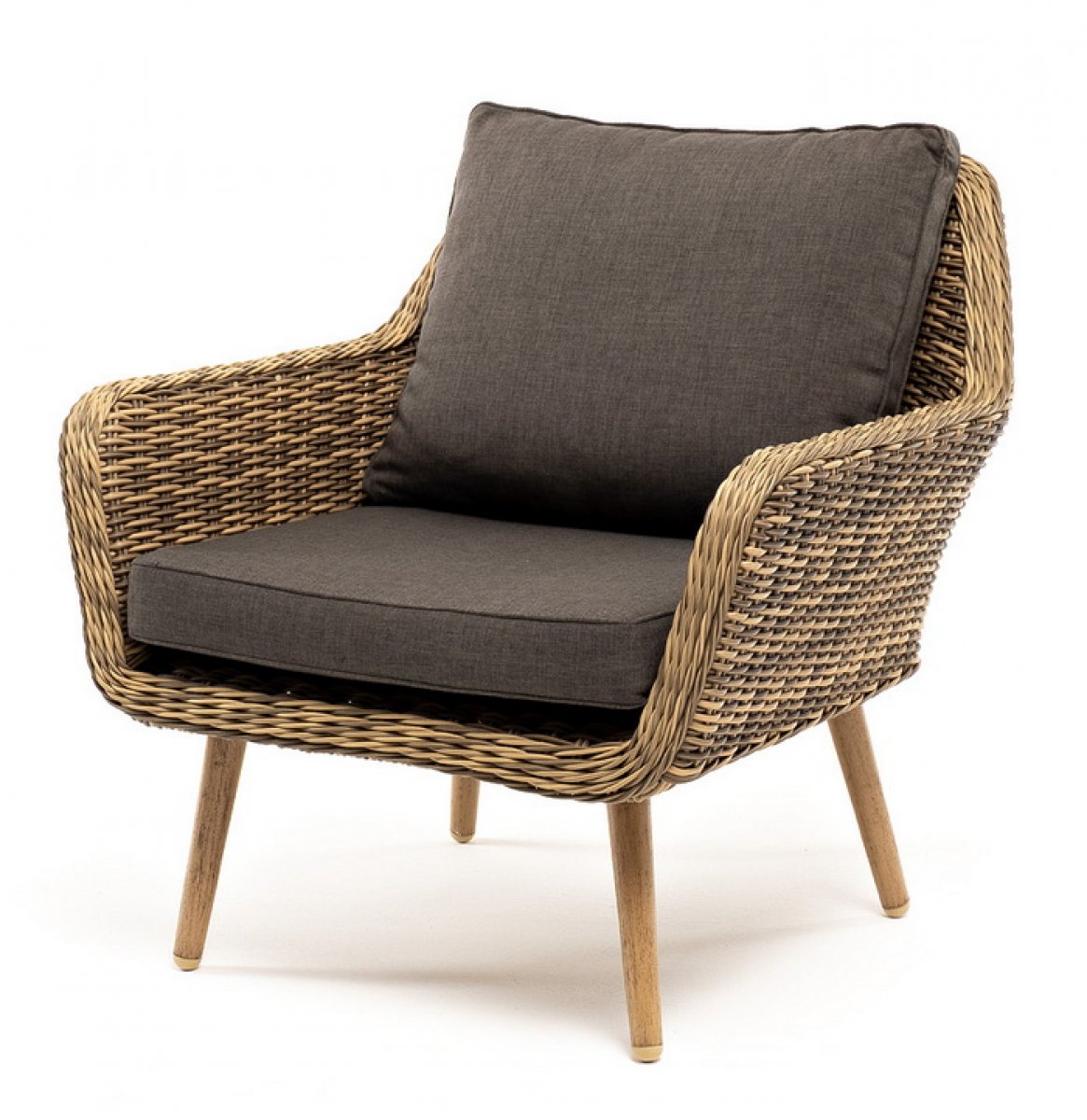 В комплекте с уличным ротанговым креслом идут мягкие подушки со съёмными чехлами серого оттенка. Они пошиты из полиэстера, который не боится повышенной влажности благодаря наличию влагоотталки